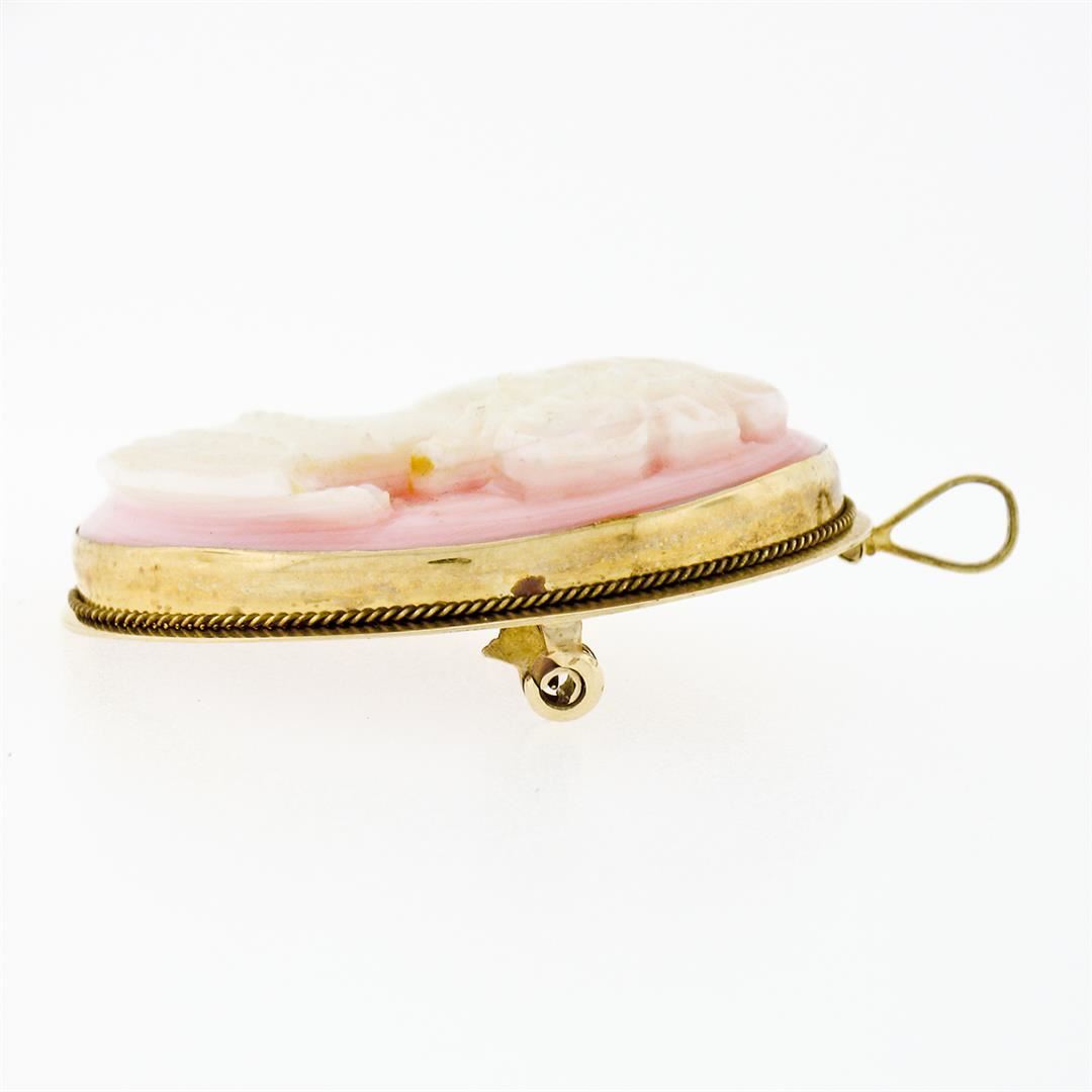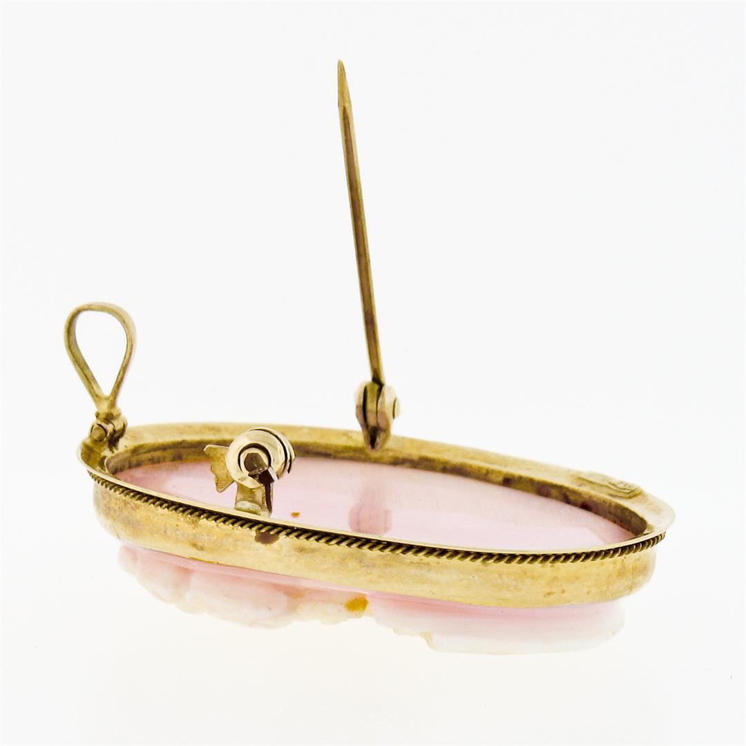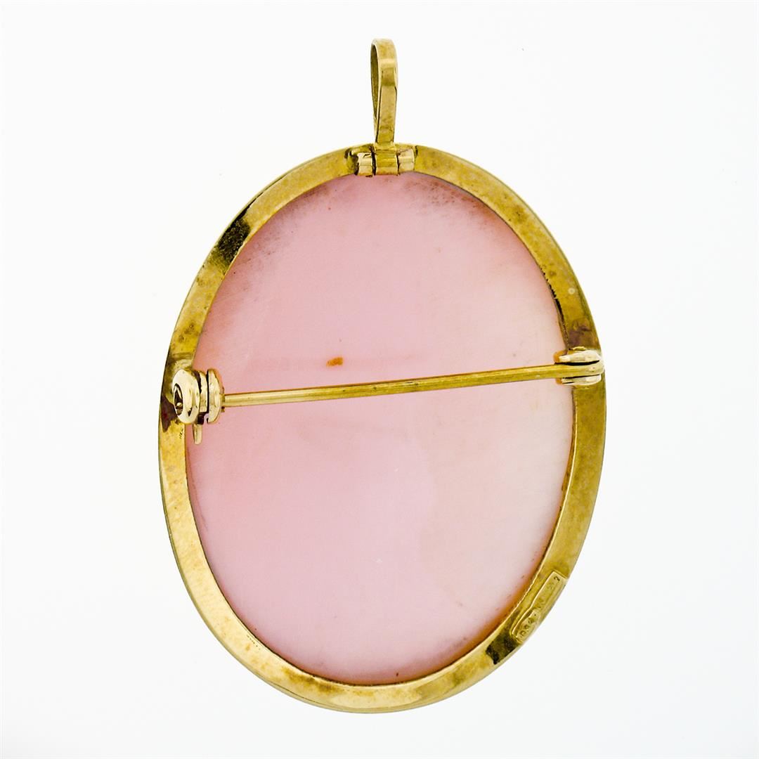 An antique solid 18k yellow gold brooch pendant, with 1 oval shape carved natural cameo coral (29.65x23.0mm). Measures 32.50x25.70mm and weighs a total of 7.65 grams.