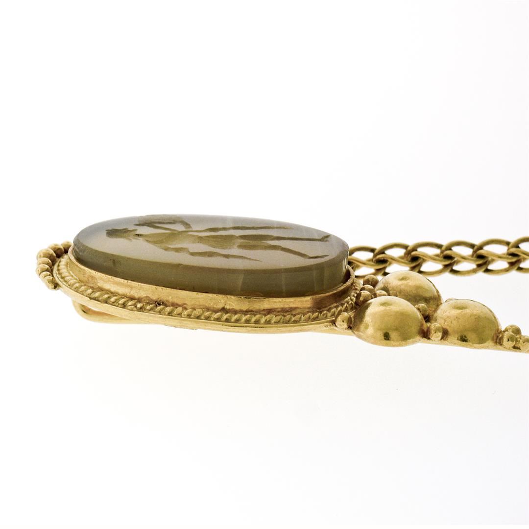An antique solid 18k yellow gold stick pin with cap and chain, featuring 1 oval shape carved natural agate ( 23.30x14.35mm). Measures 73.40x18.25mm and weighs a total of 11.56 grams.