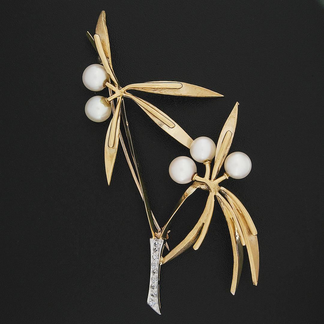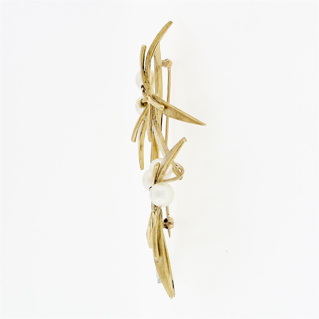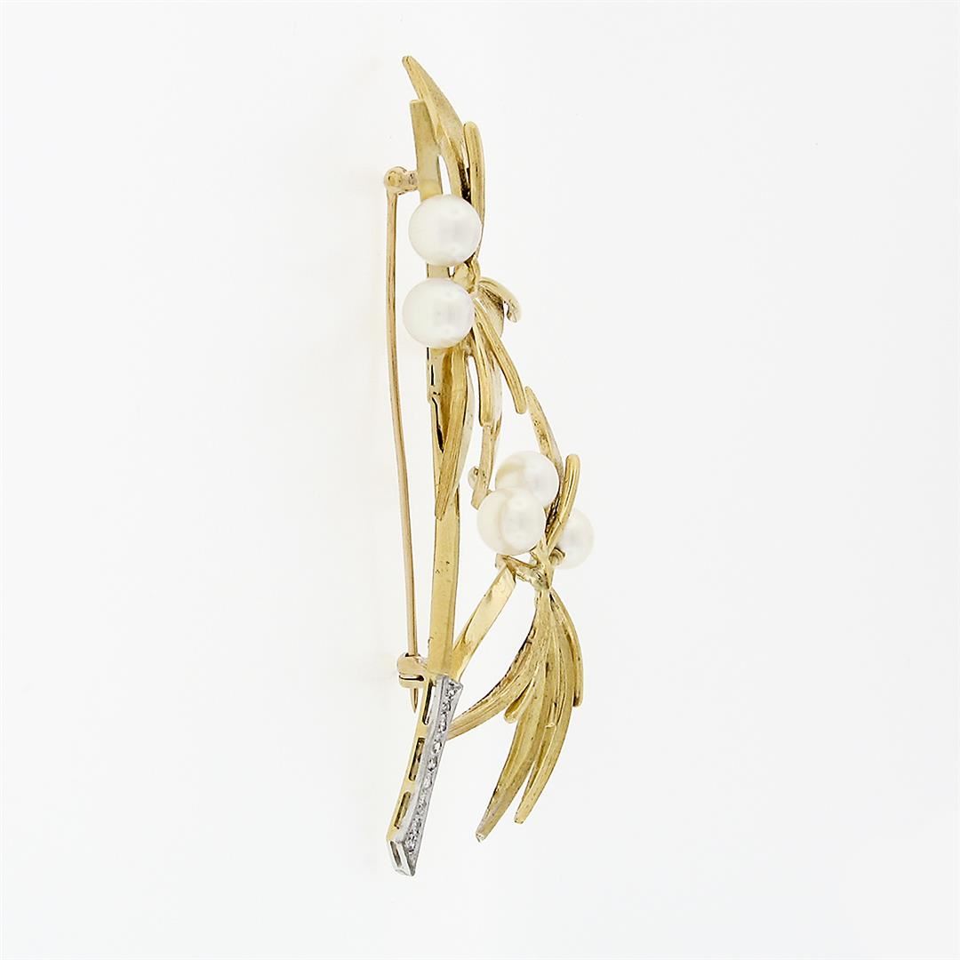 An antique solid 18k yellow gold with platinum flower pin brooch, featuring 5 round shape cultured pearls (6.3mm), & 9 round single cut natural diamonds (G/H - SI1/SI2 ; 0.10ctw). Measures 74.6x36.0mm and weighs a total of 13.0 grams.