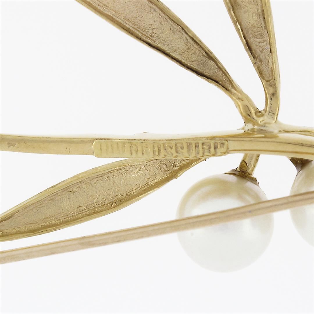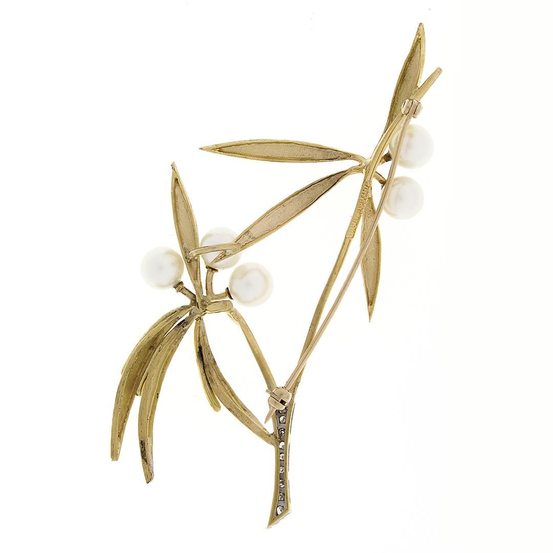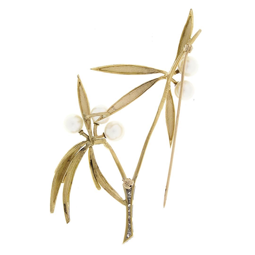 An antique solid 18k yellow gold with platinum flower pin brooch, featuring 5 round shape cultured pearls (6.3mm), & 9 round single cut natural diamonds (G/H - SI1/SI2 ; 0.10ctw). Measures 74.6x36.0mm and weighs a total of 13.0 grams.