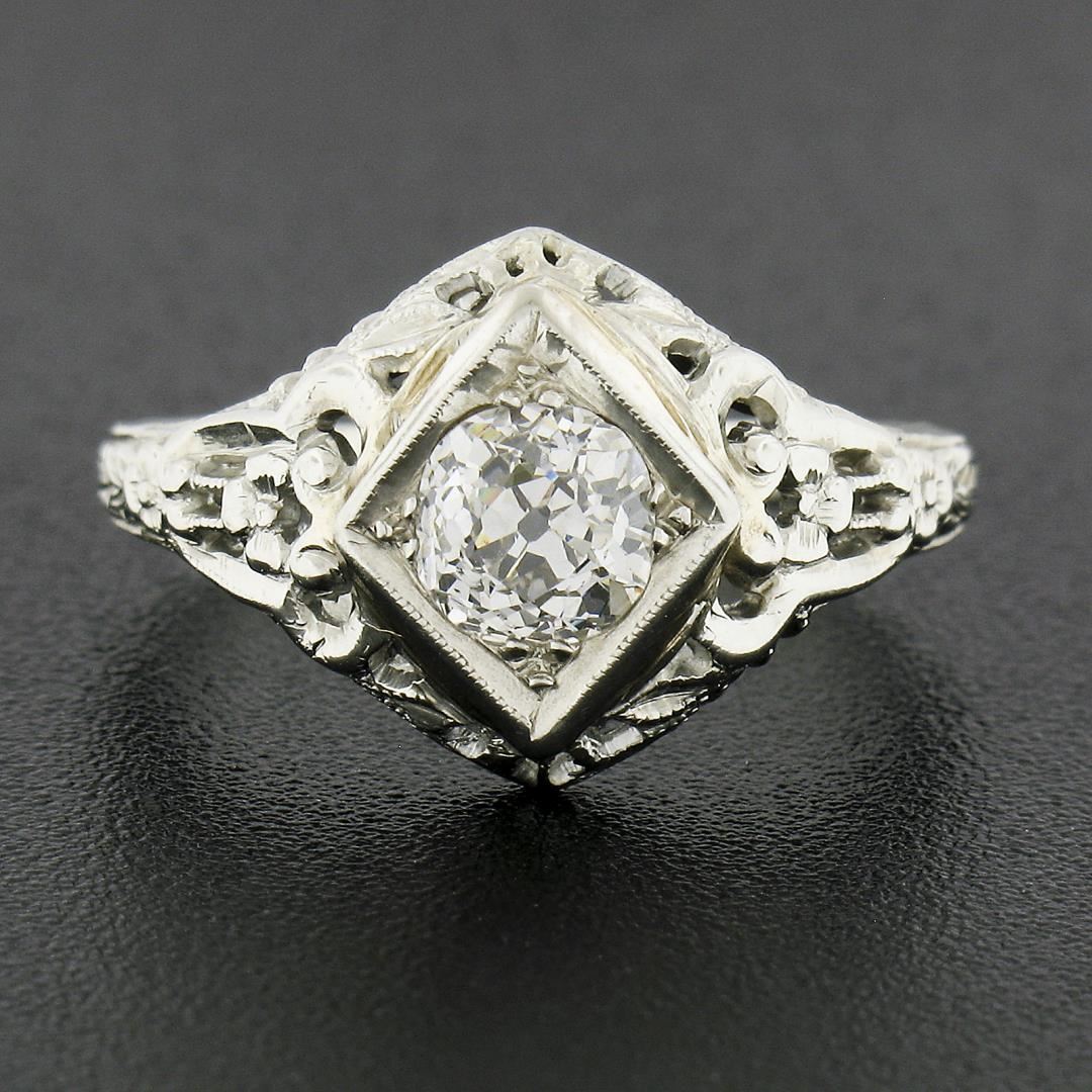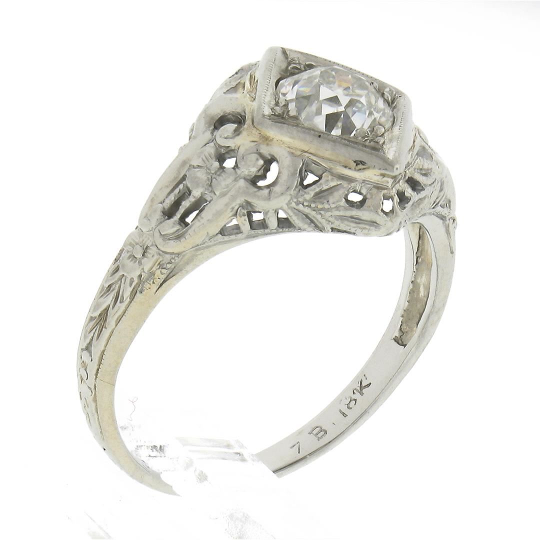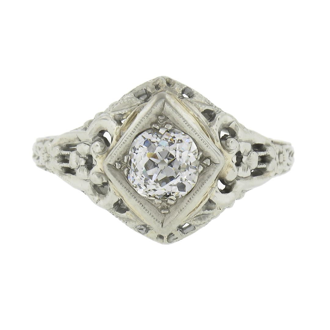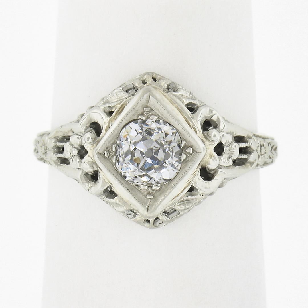 An antique solid 18k white gold engagement ring, with 1 old mine cushion cut natural diamond (G/H - VS2 ; 0.60ct). The ring is size 5.5, weighs a total of 2.63 grams, and measures 11.6mm wide.