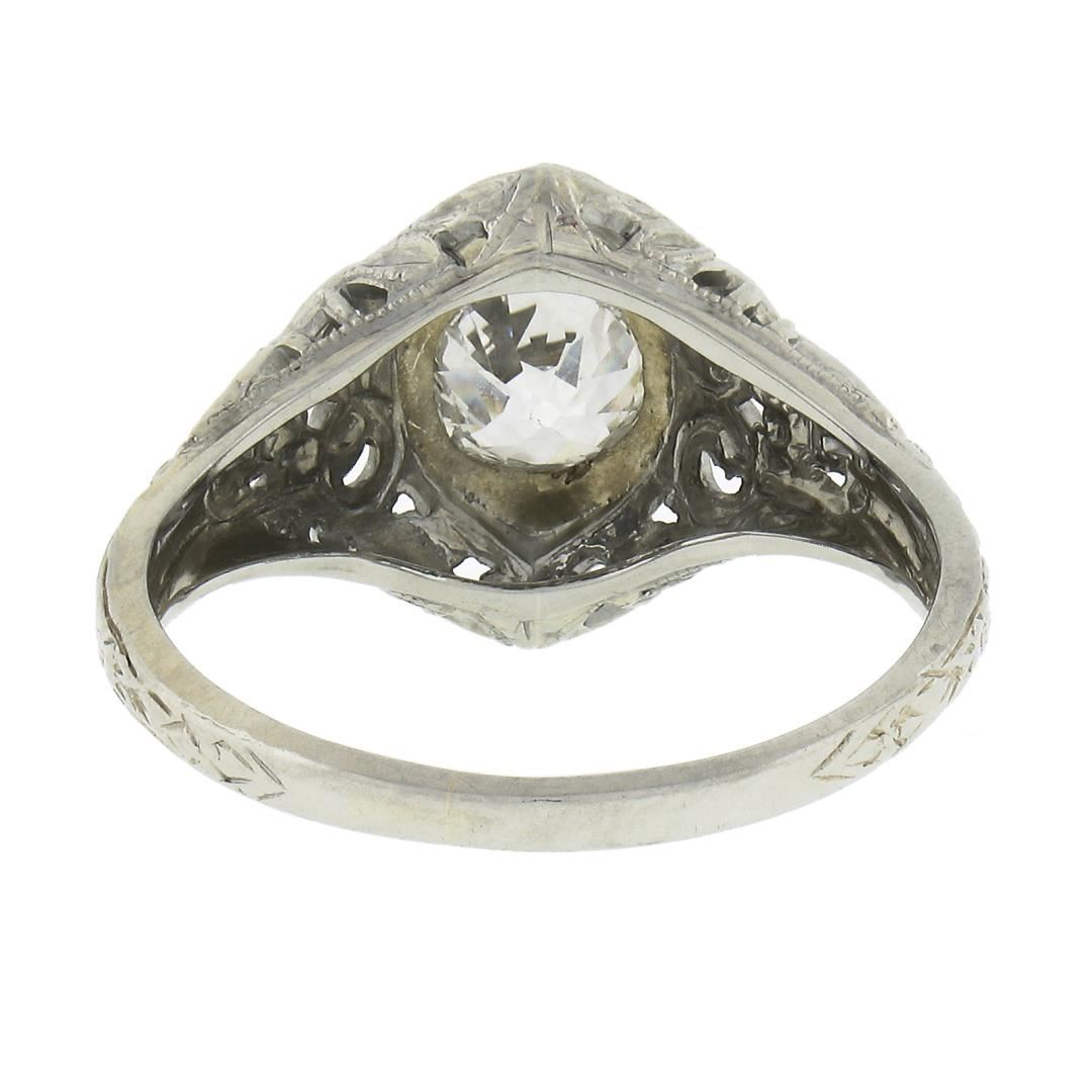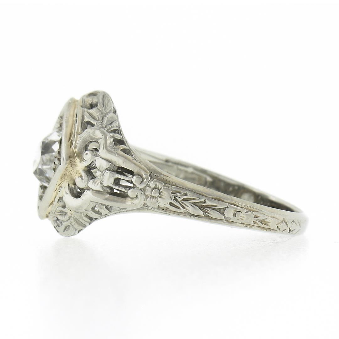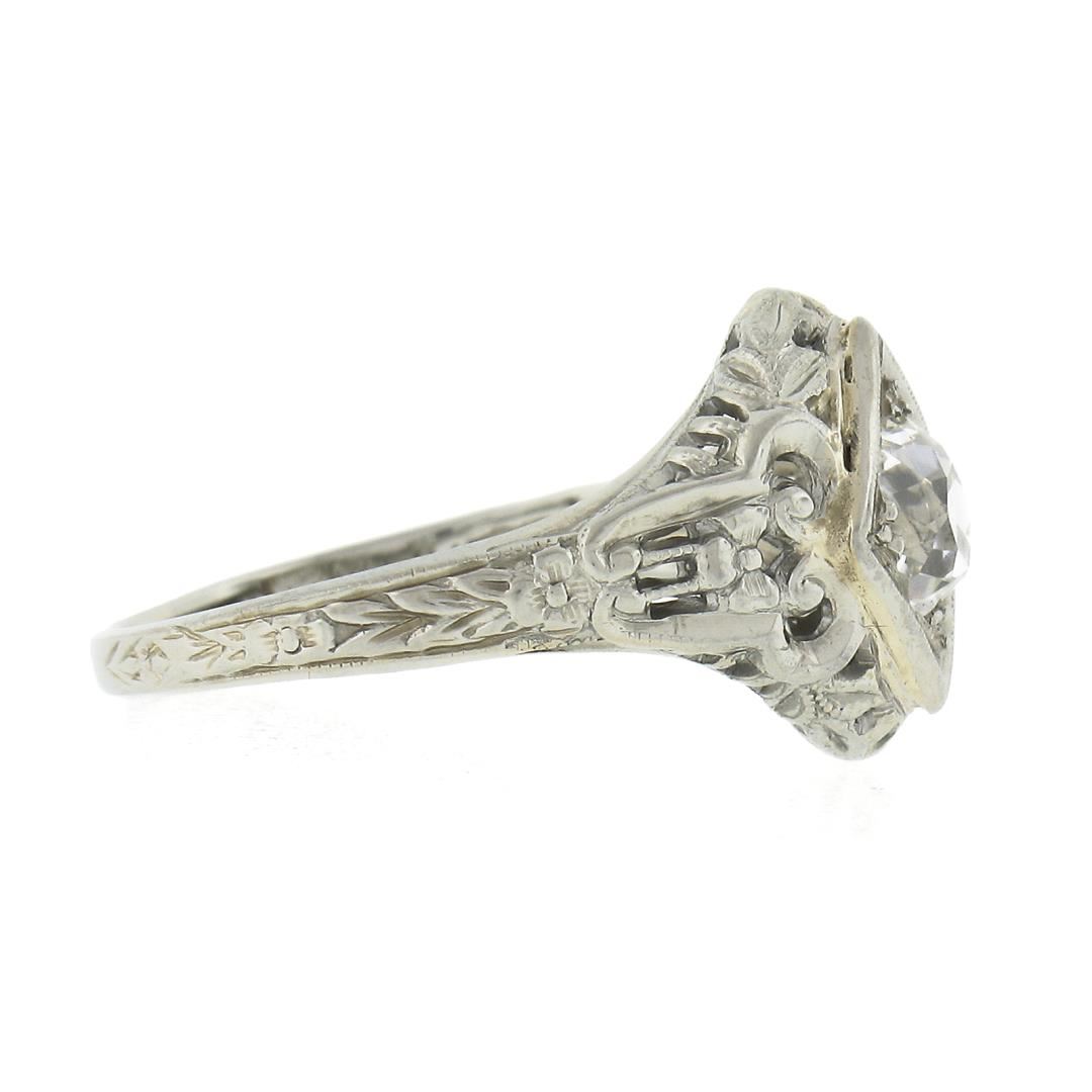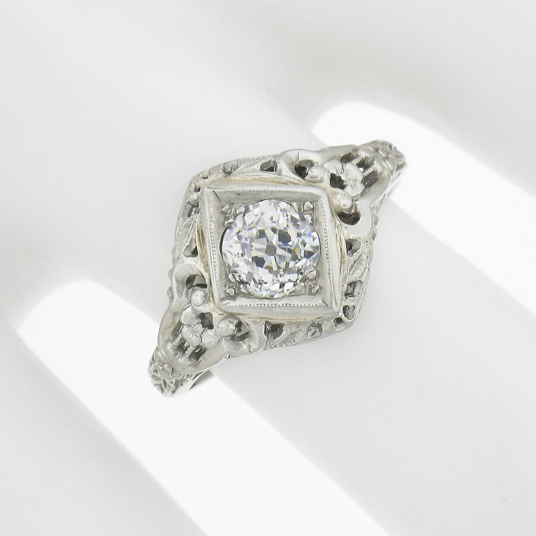 An antique solid 18k white gold engagement ring, with 1 old mine cushion cut natural diamond (G/H - VS2 ; 0.60ct). The ring is size 5.5, weighs a total of 2.63 grams, and measures 11.6mm wide.