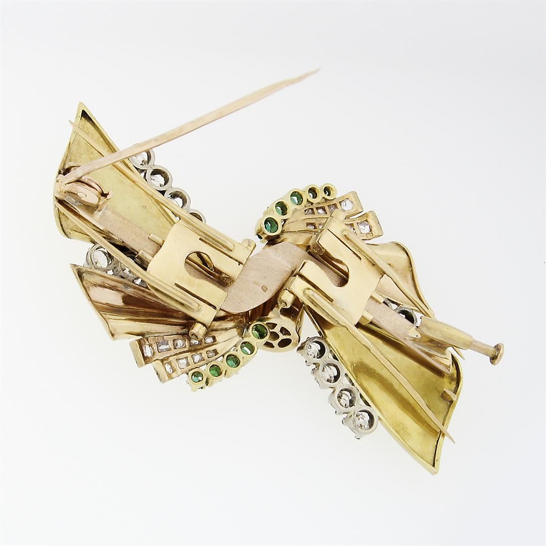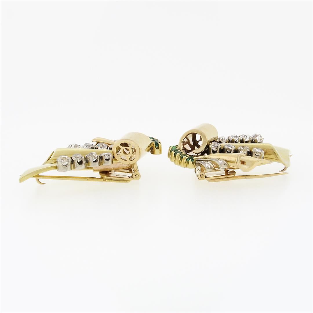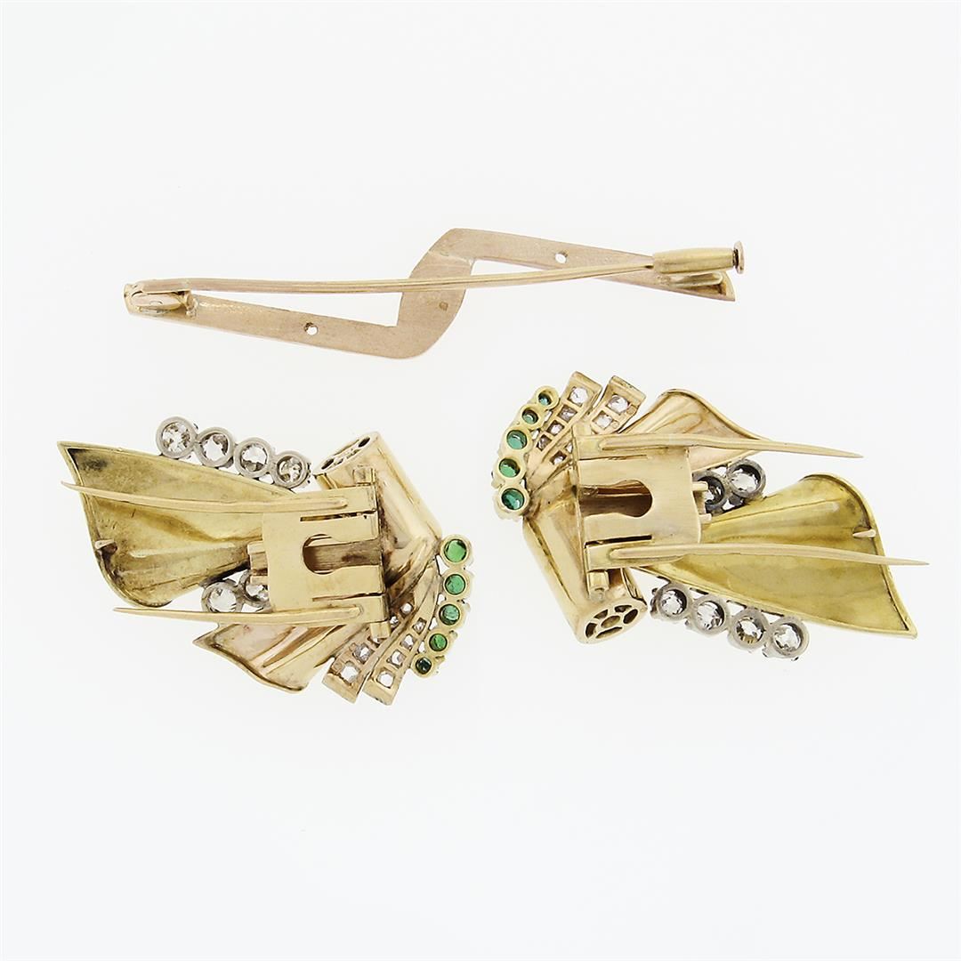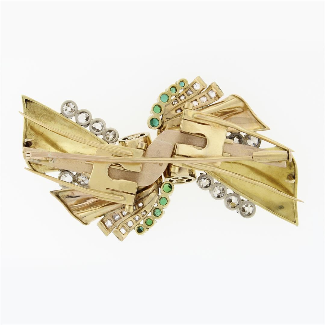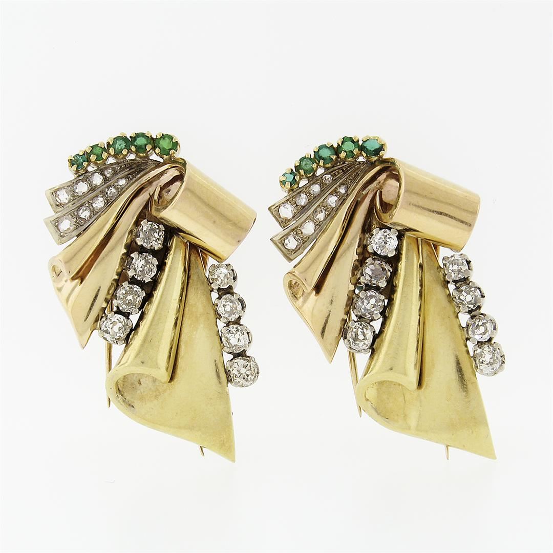 An antique solid 18k rosy yellow, green & white gold dual dree clip brooch, with 16 old mine cut natural diamonds (G -J - VS2-SI2 ; 2.02ctw), and 18 round rose cut natural diamonds (G-I - VS2- I1 ; 0.72ctw ), & 10 round cut natural emeralds (0.50ctw). Measures 39.57x63.38mmm and weighs a total of 32.83 grams.