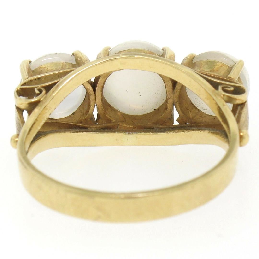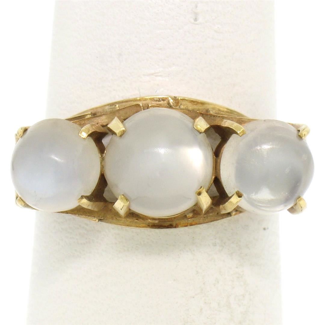 One Antique 18k Rose Gold 4.50ctw Three Stone Cabochon Moonstone Open Work Band Ring. Item Details: Material: 18k Solid Rose Gold, Weight: 4.5 Grams, Stone(s): (3) Natural Genuine Moonstone - Round Cabochon Cut - Prong Set - Grayish Blue Color, Total Carat Weight: 4.50 (approx.), Ring Size: 6.0 , Ring Width: 9.0mm, Ring Height: 7.9mm rise off the finger, Condition: Antique, original stones and patina. Excellent condition!