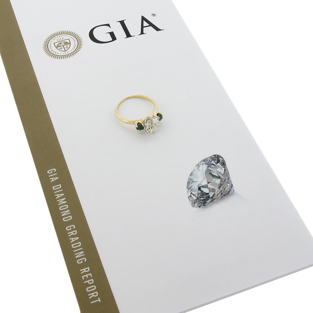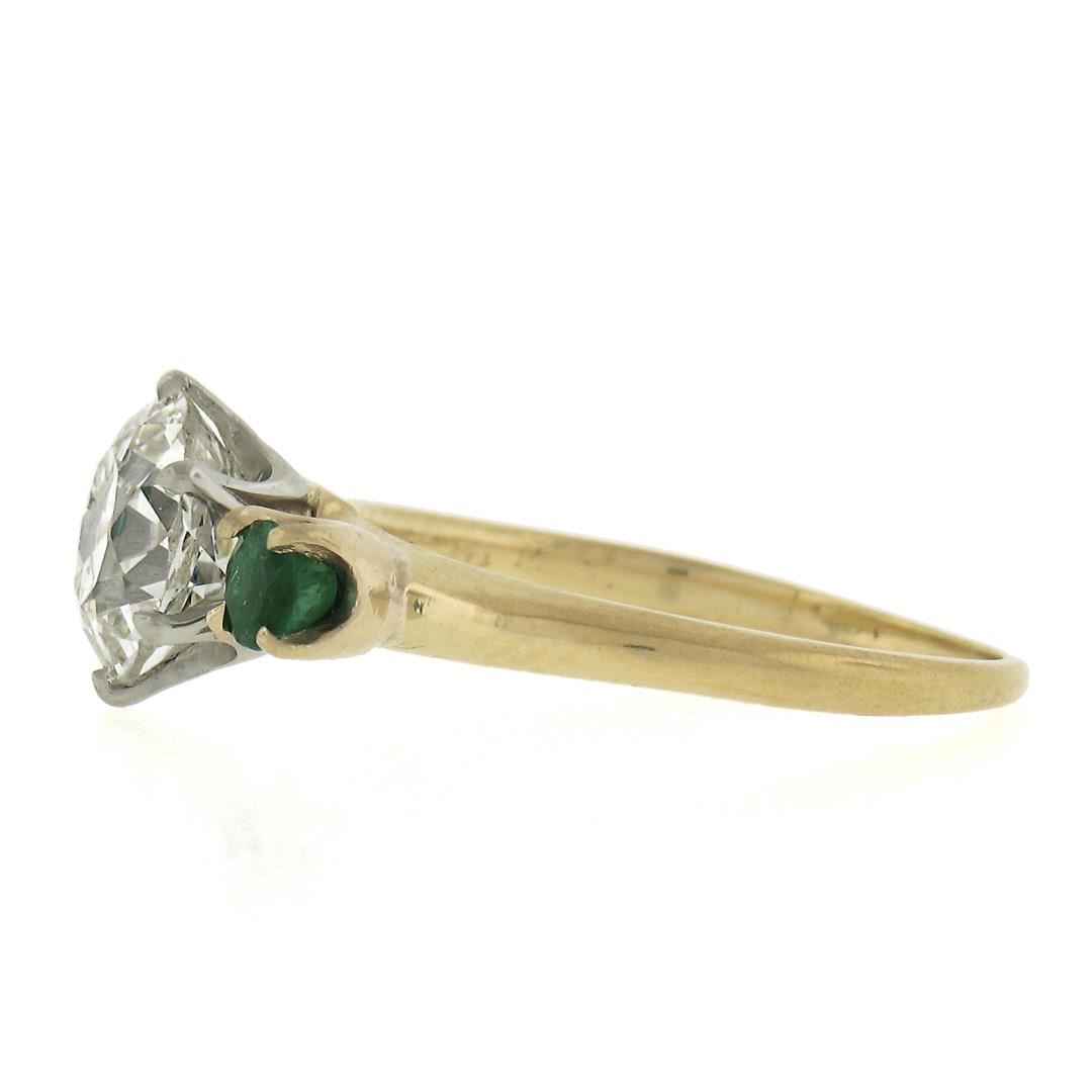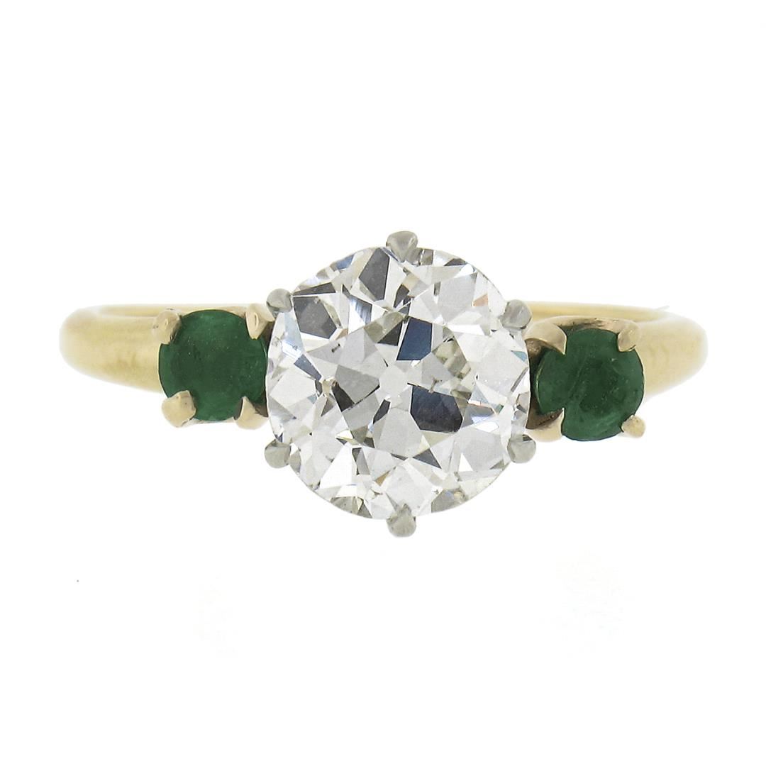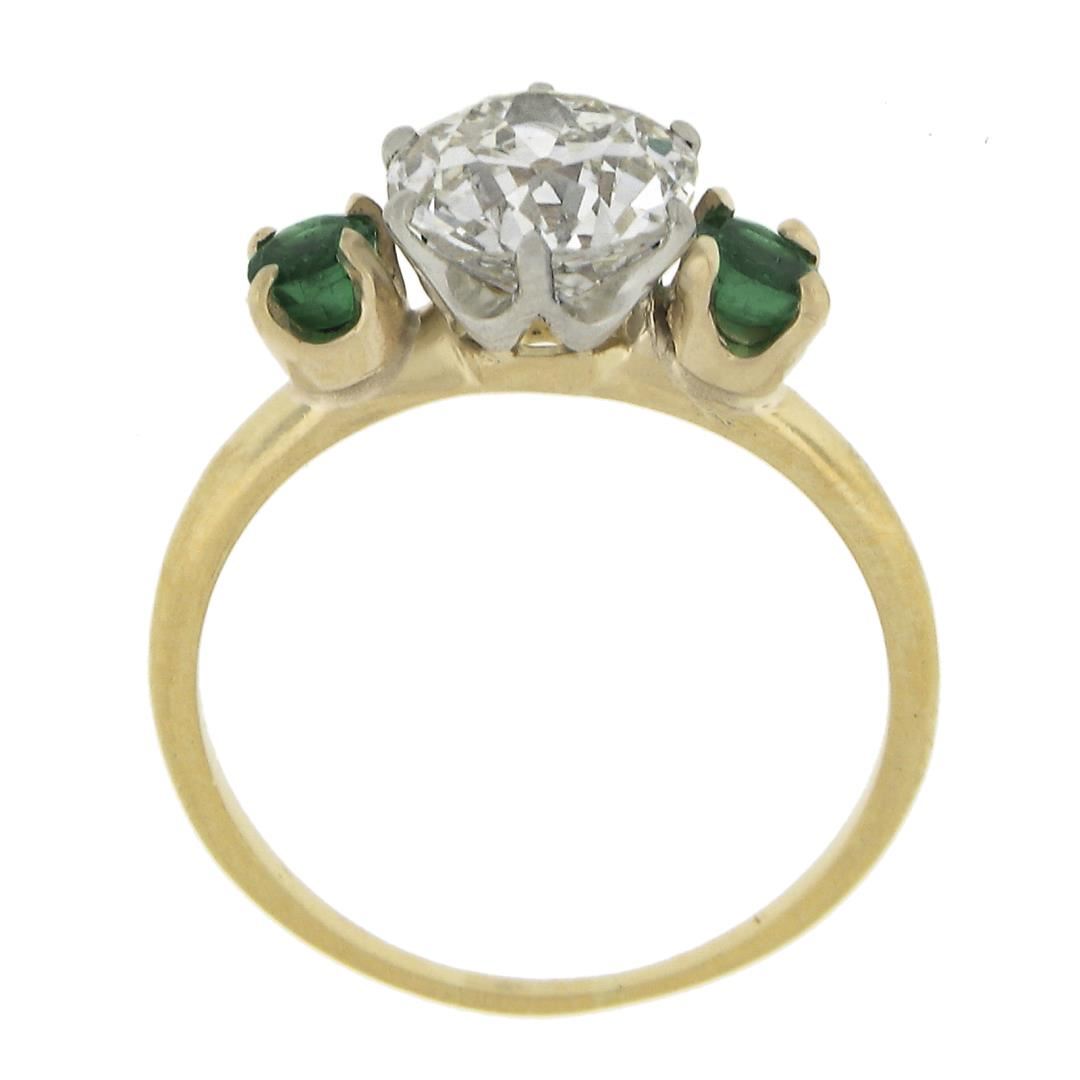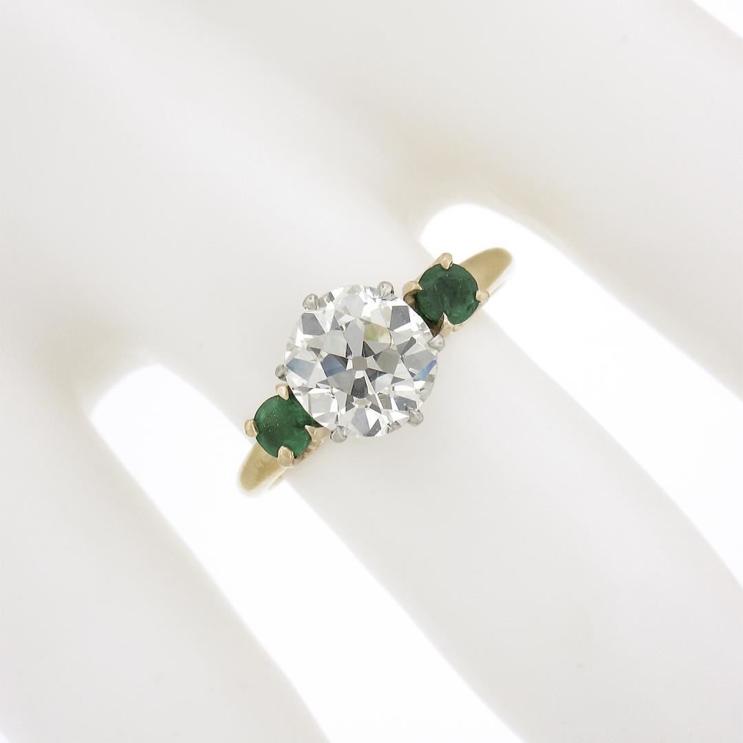 Antique 18k Gold & Platinum 2.02ct GIA European Diamond w/ Emerald 3 Stone Ring