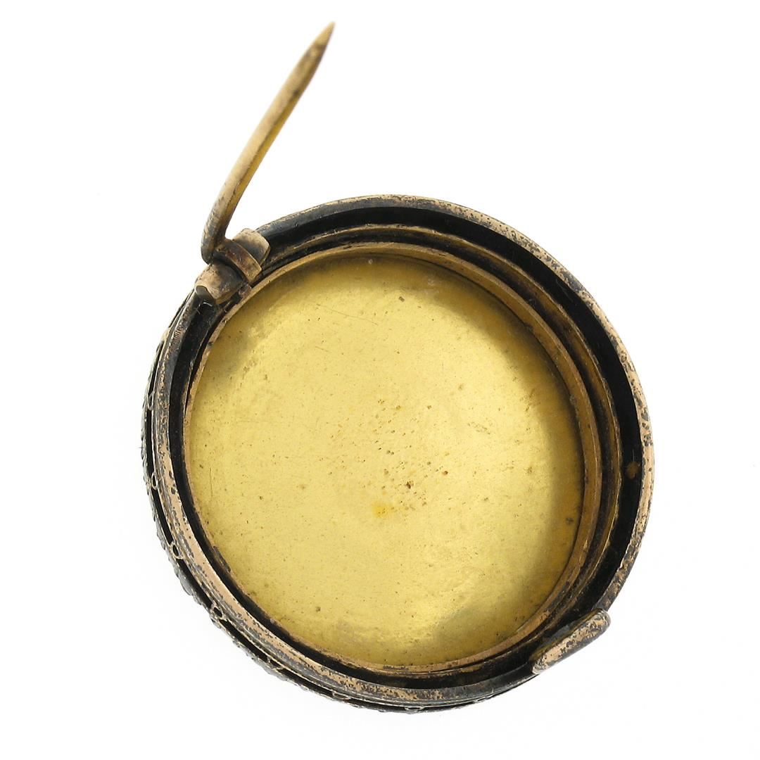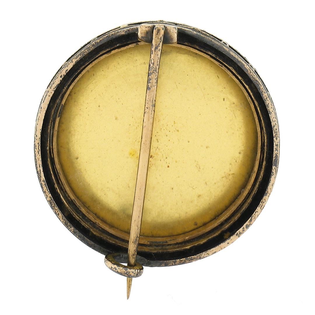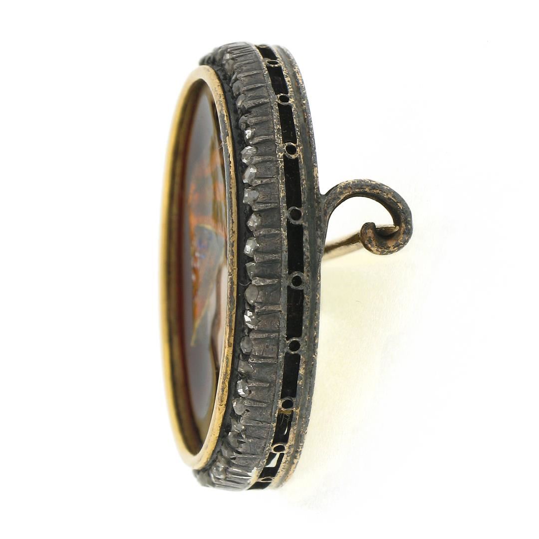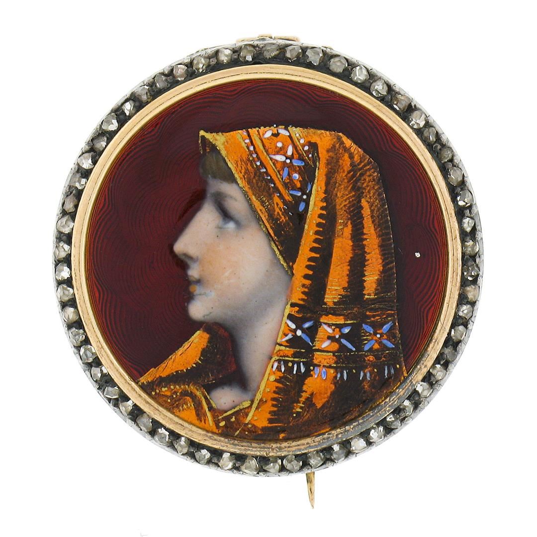 An antique solid 18k yellow gold & silver enamel portrait brooch, with numerous of old rose cut natural diamonds. Measures 26.5mm in diameter and weighs a total of 8.36 grams.