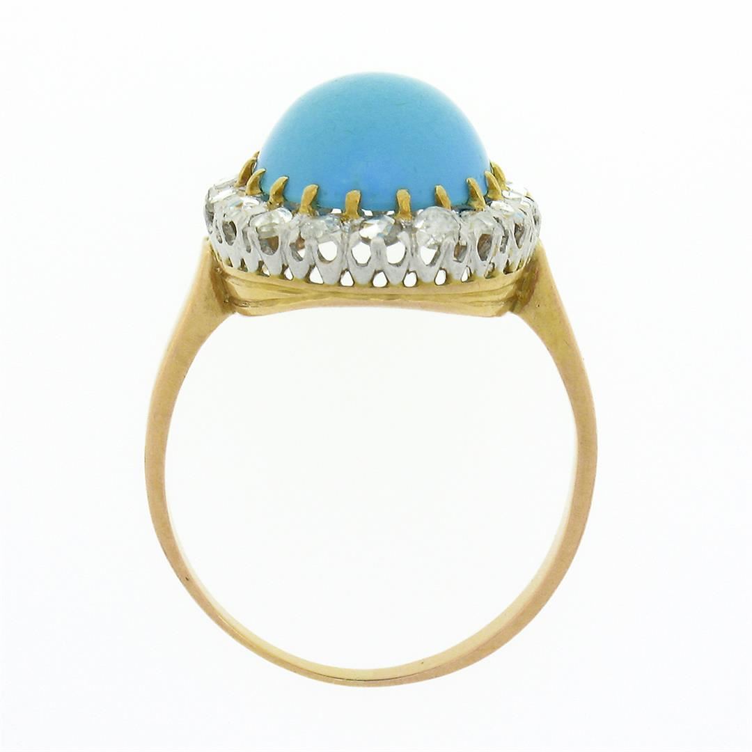 An antique solid 18k rosy yellow gold & platinum ring, with 1 oval cabochon cut natural persian turquoise (13.80x10.25mm), surrounded with a halo of 18 old rose cut natural diamonds (F/G - VS2/I1 ; 0.80ctw). The ring is size 7.5, weighs a total of 4.80 grams, and measures 18.35mm wide.