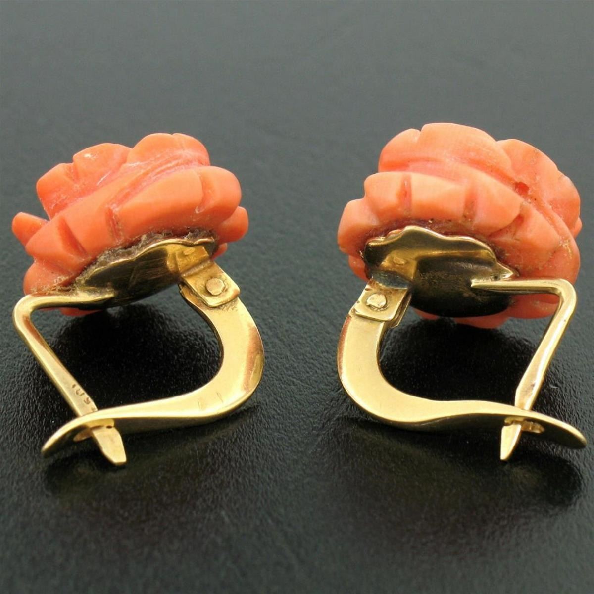 A pair of antique 18kt yellow gold drop earrings featuing pieces of coral carved into roses measuring approximately 14.3mm in diameter. The earrings measure approximately 14.30x15.48mm and weigh a total of 6.09 grams.