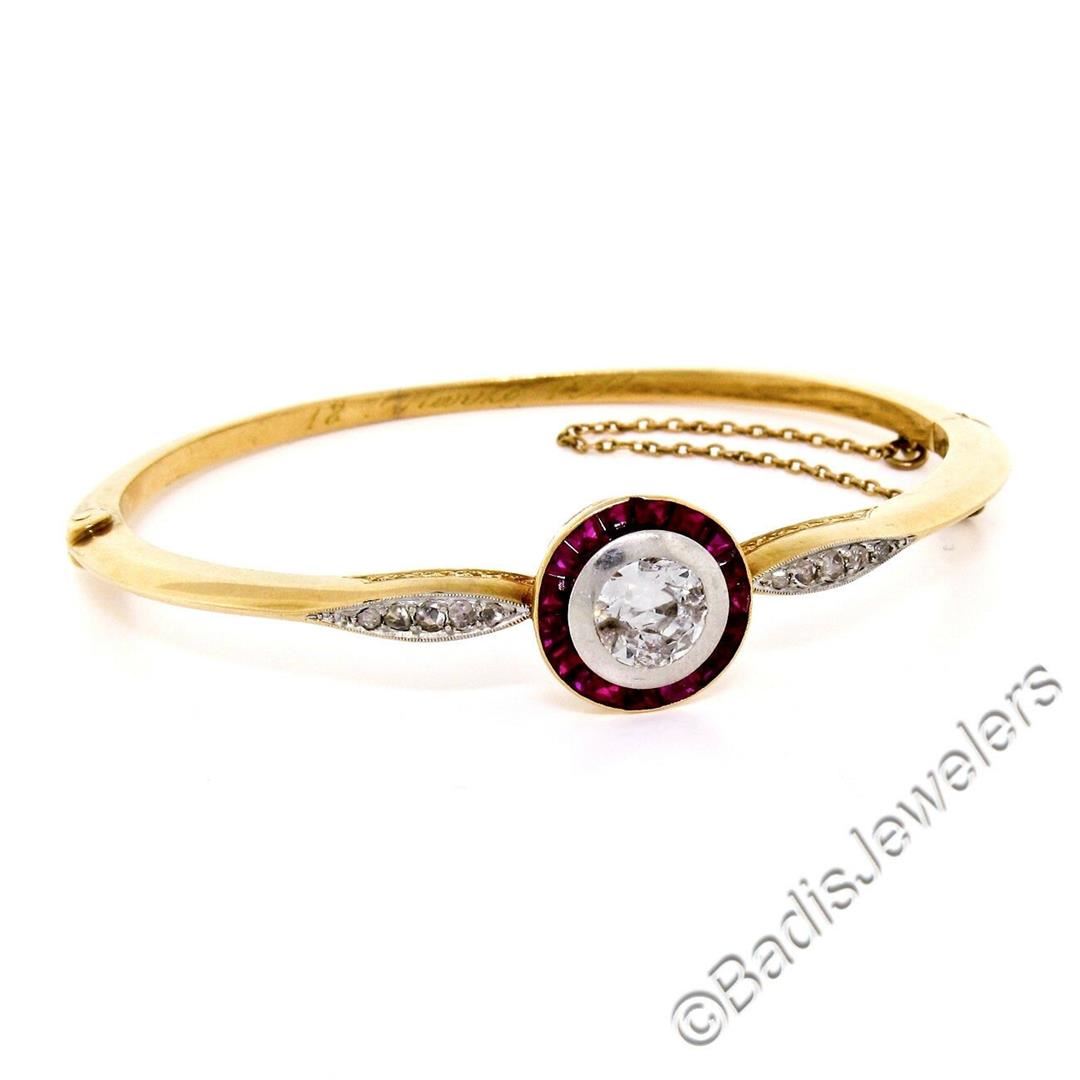 An Edwardian era 18kt yellow gold and platinum bangle bracelet with a 1.40ct old European cut diamond (H - I2) surrounded by a 0.85ctw calibre cut ruby halo and accented by 0.60ctw of rose cut diamonds (H/I - SI2). It weighs a total of 12.46 grams, measures 14.20mm wide, and measures 6.5 inches in length.
