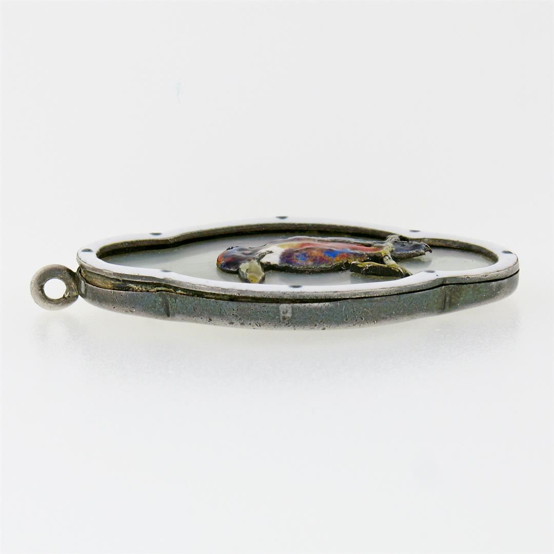 An antique solid sterling silver and enamel pendant, with 1 elongated quatrefoil shape natural mother of pearl (34.9x22.4mm). The pendant weighs a total of 8.4 grams, measures 42.67x26.75mm including the bail, and the inside of the bail measures 1.65x1.65mm.