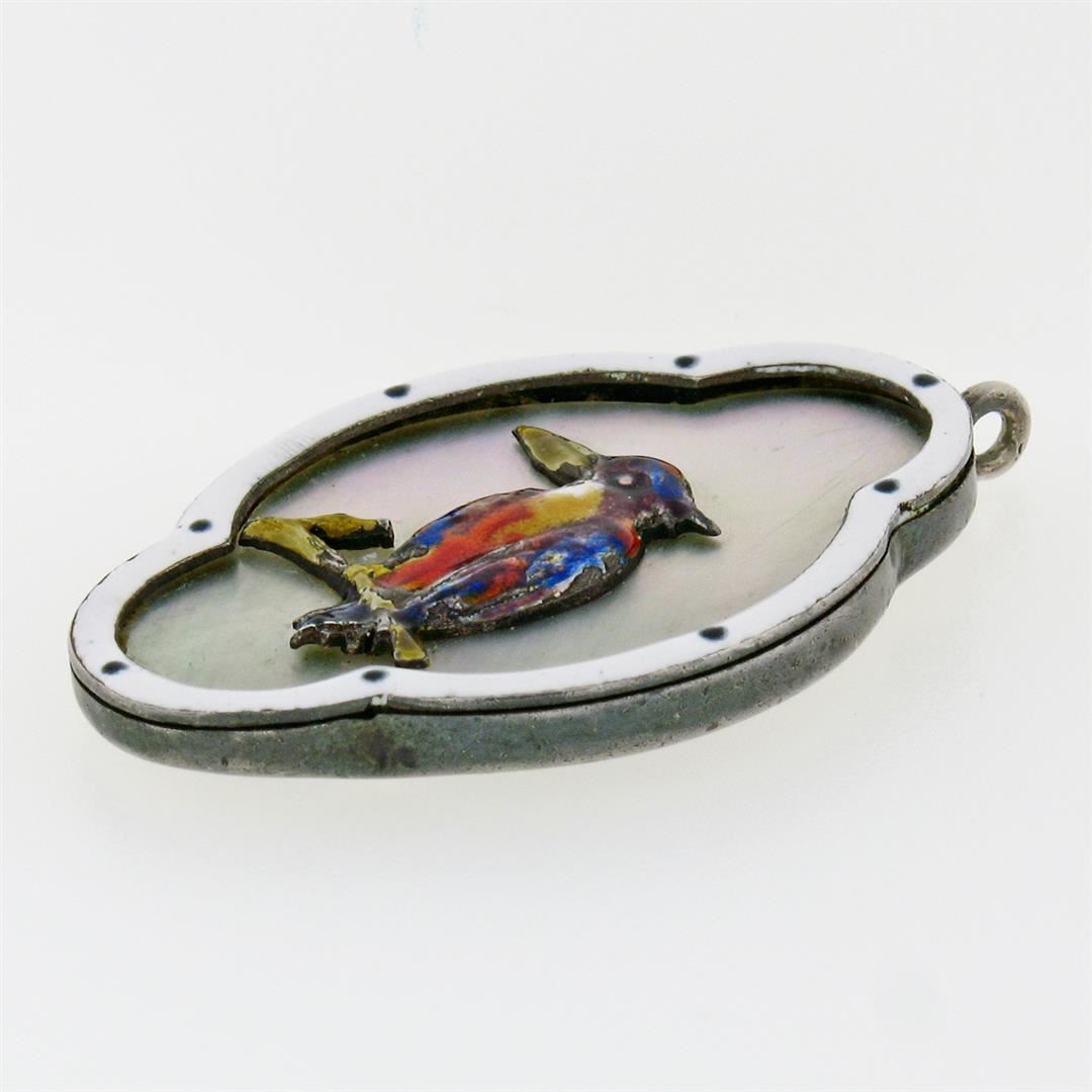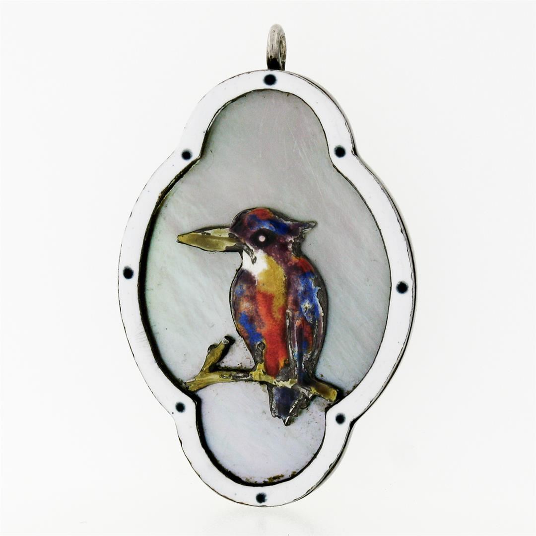 An antique solid sterling silver and enamel pendant, with 1 elongated quatrefoil shape natural mother of pearl (34.9x22.4mm). The pendant weighs a total of 8.4 grams, measures 42.67x26.75mm including the bail, and the inside of the bail measures 1.65x1.65mm.