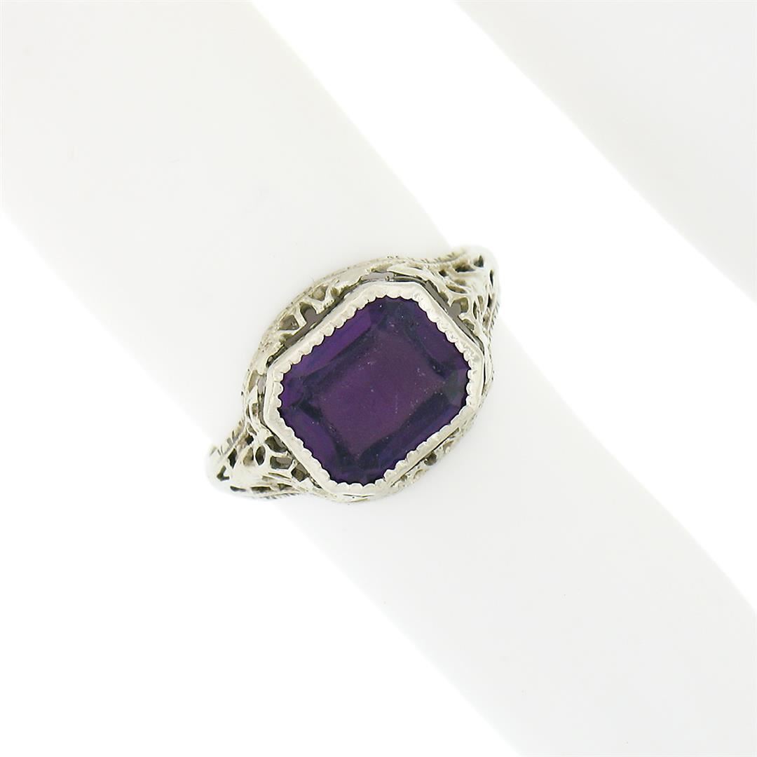 An antique art deco solid 10k white gold solitaire ring, with 1 custom cut natural amethyst (7.4x5.7mm). The ring is size 3.0, weighs a total of 1.18 grams, and measures 9.1mm wide.