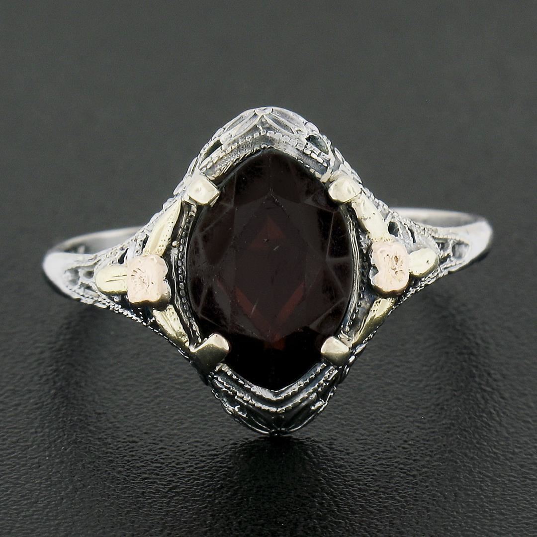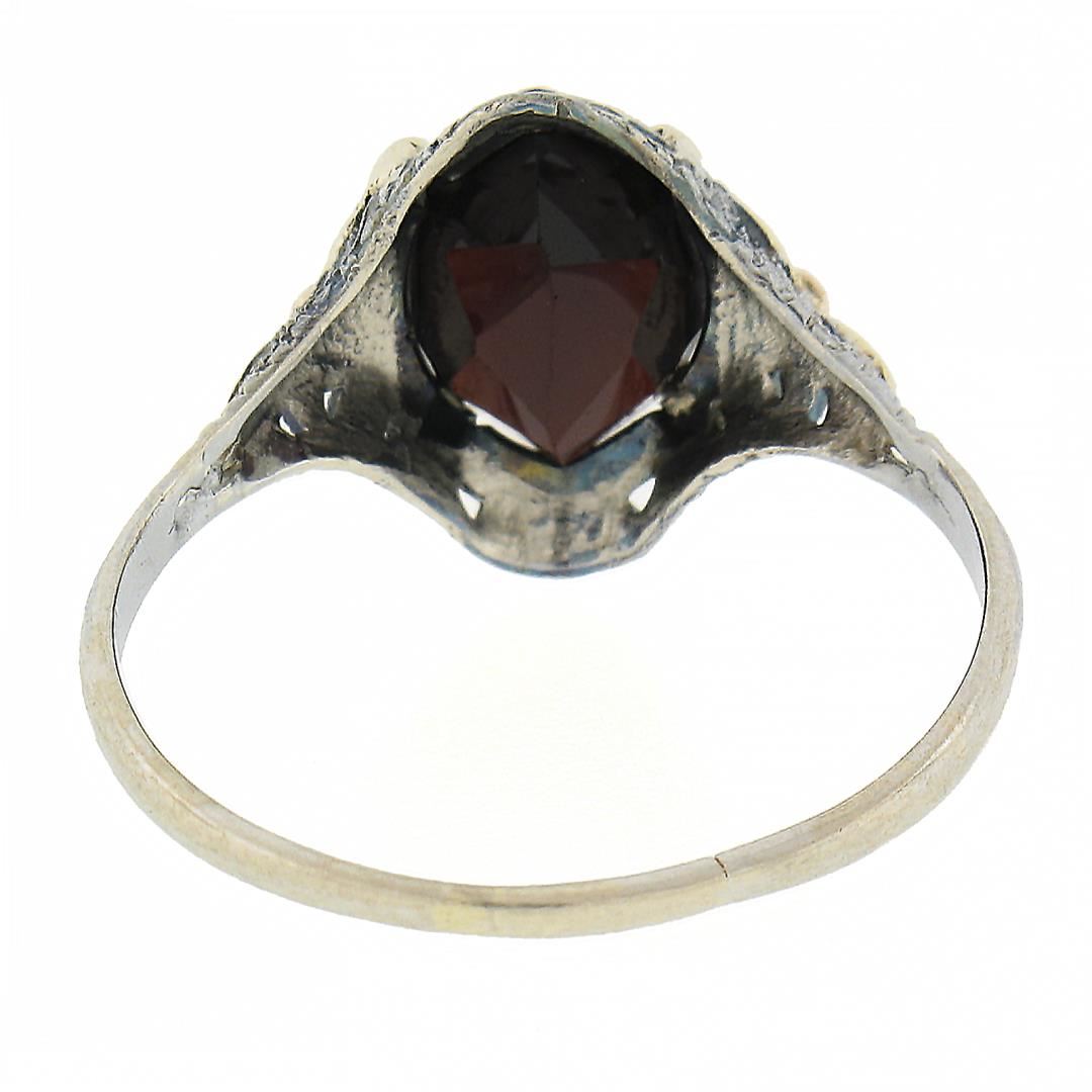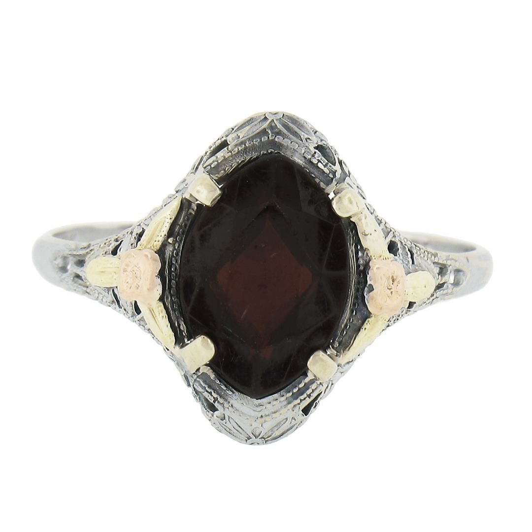 An antique solid 10k tri color gold ring, with 1 marquise cut natural garnet (9.9x6.9mm). The ring is size 8.0, weighs a total of 1.7 grams, and measures 13.6mm wide.