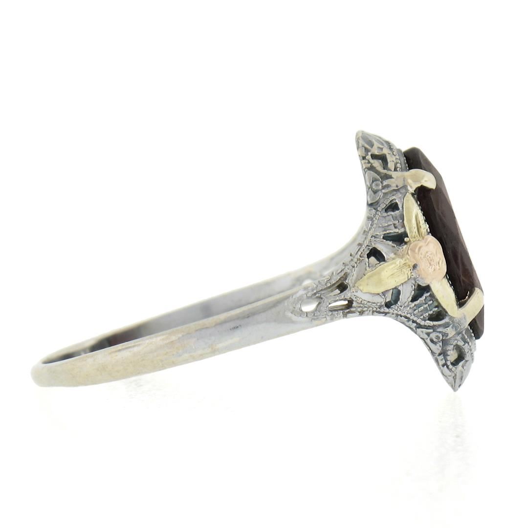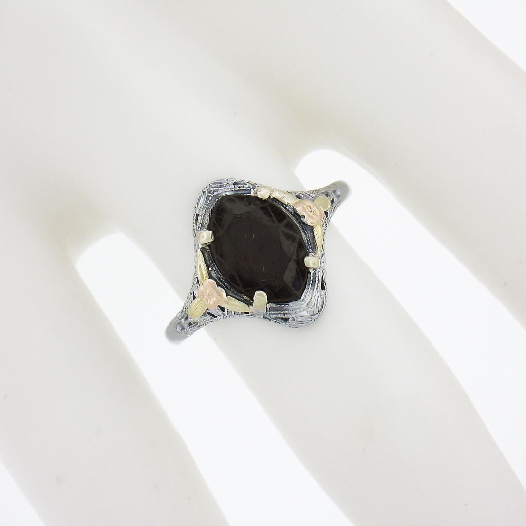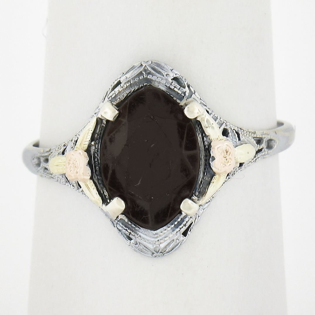 An antique solid 10k tri color gold ring, with 1 marquise cut natural garnet (9.9x6.9mm). The ring is size 8.0, weighs a total of 1.7 grams, and measures 13.6mm wide.
