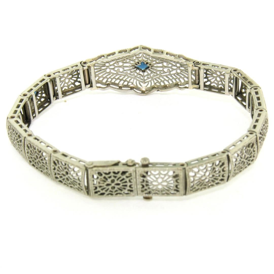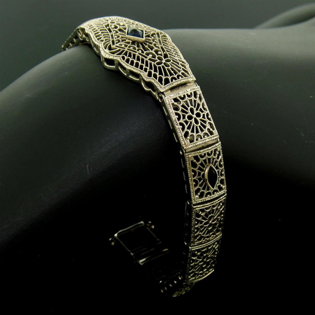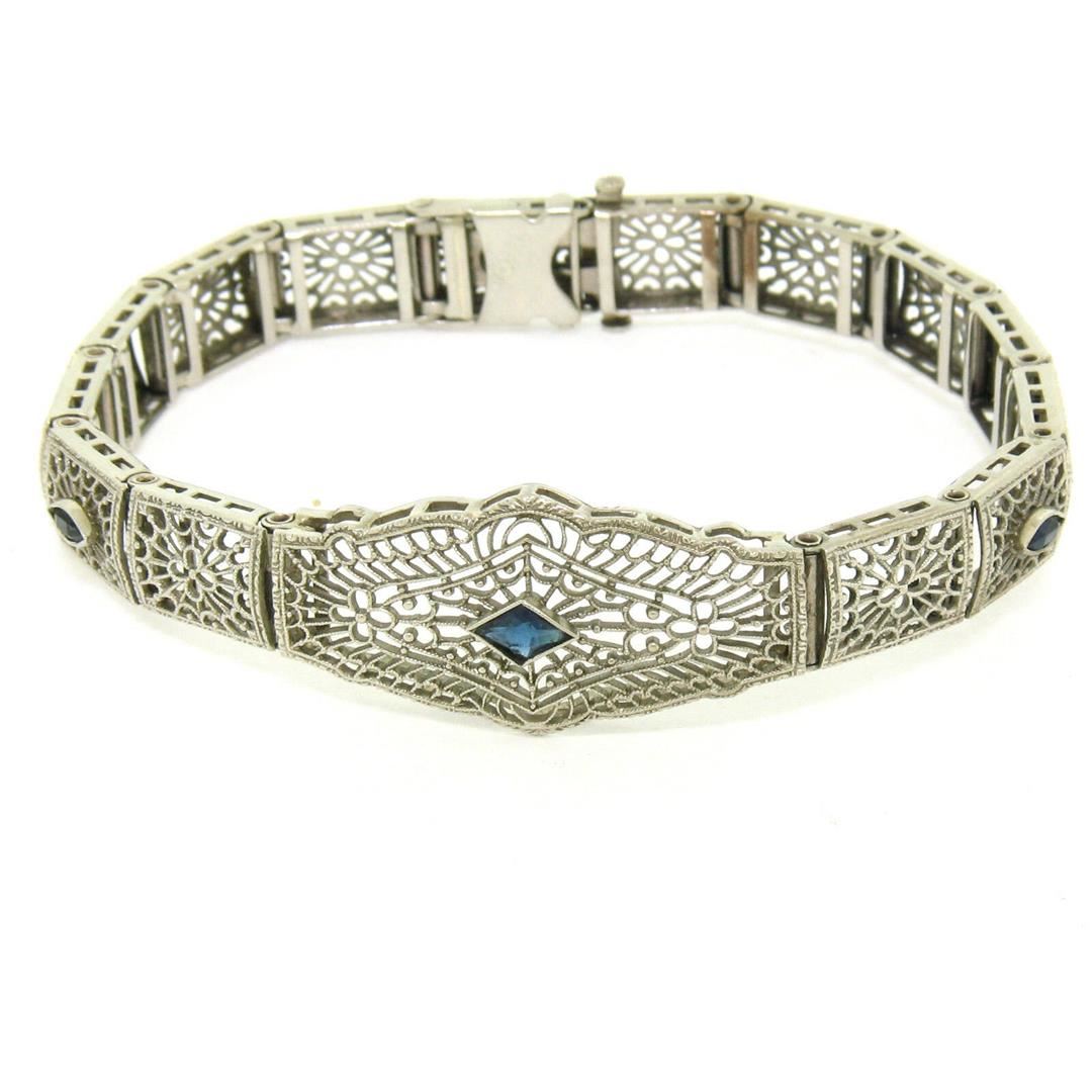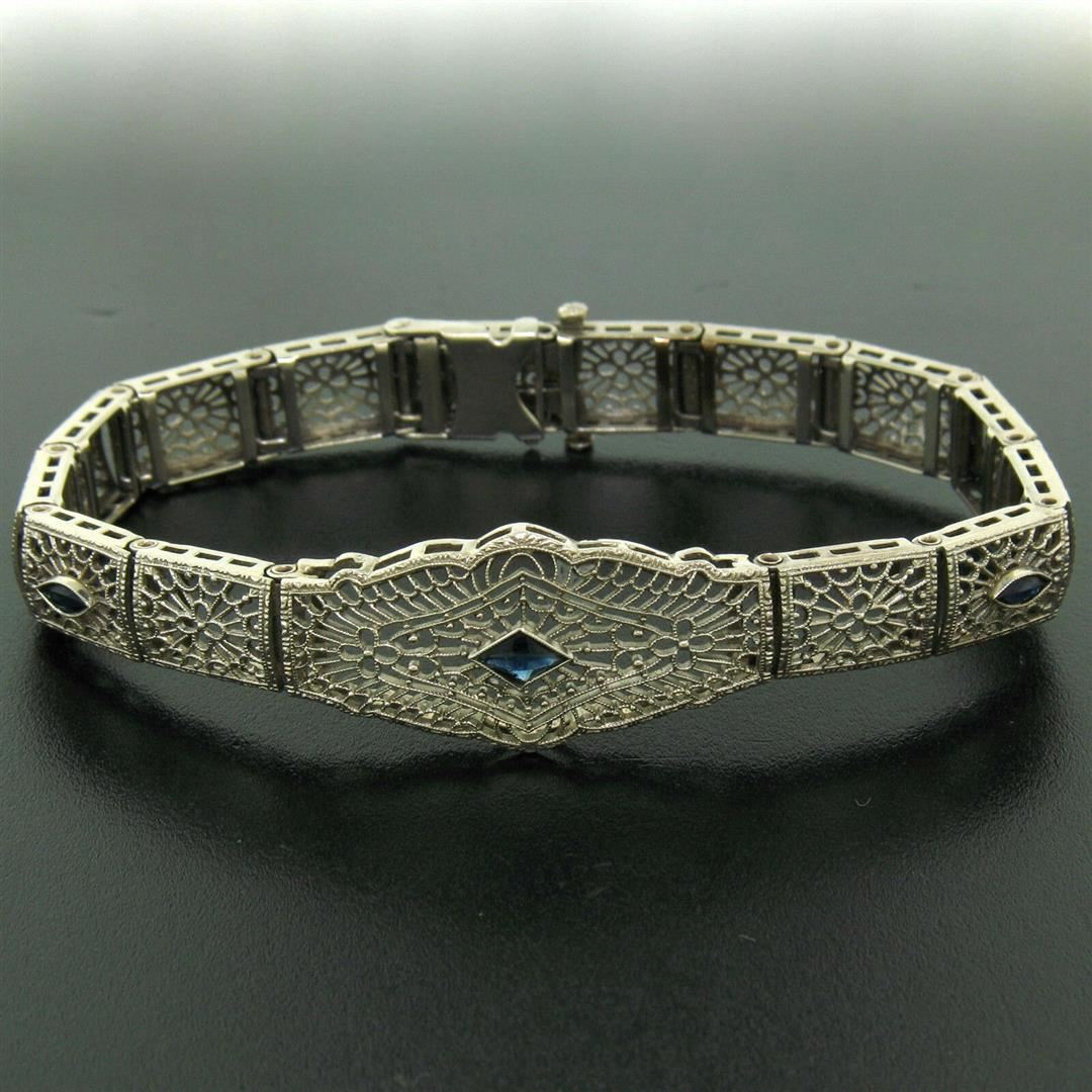 One Antique Art Deco 10k White Gold 7" Wide Marquise Filigree & Sapphire Bracelet. Item Details: Material: 10k Solid White Gold, Weight: 12.80 Grams, Stone(s): (3) Synthetic Sapphires - Marquise and Square Cut - Bezel Set - Rich Royal Blue Color, Chain Type: Open Filigree Link, Chain Length: 7 Inches, Clasp: Push clasp with fold under safety latch, Width: 15.20mm (at the widest part), 8.03mm (the links), Thickness: 5.60mm rise off the wrist Condition: Antique, art deco period bracelet. Excellent, ALL ORIGINAL condition!