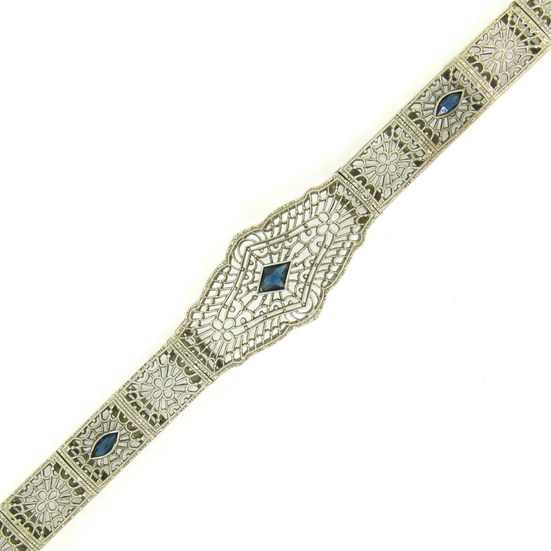One Antique Art Deco 10k White Gold 7" Wide Marquise Filigree & Sapphire Bracelet. Item Details: Material: 10k Solid White Gold, Weight: 12.80 Grams, Stone(s): (3) Synthetic Sapphires - Marquise and Square Cut - Bezel Set - Rich Royal Blue Color, Chain Type: Open Filigree Link, Chain Length: 7 Inches, Clasp: Push clasp with fold under safety latch, Width: 15.20mm (at the widest part), 8.03mm (the links), Thickness: 5.60mm rise off the wrist Condition: Antique, art deco period bracelet. Excellent, ALL ORIGINAL condition!
