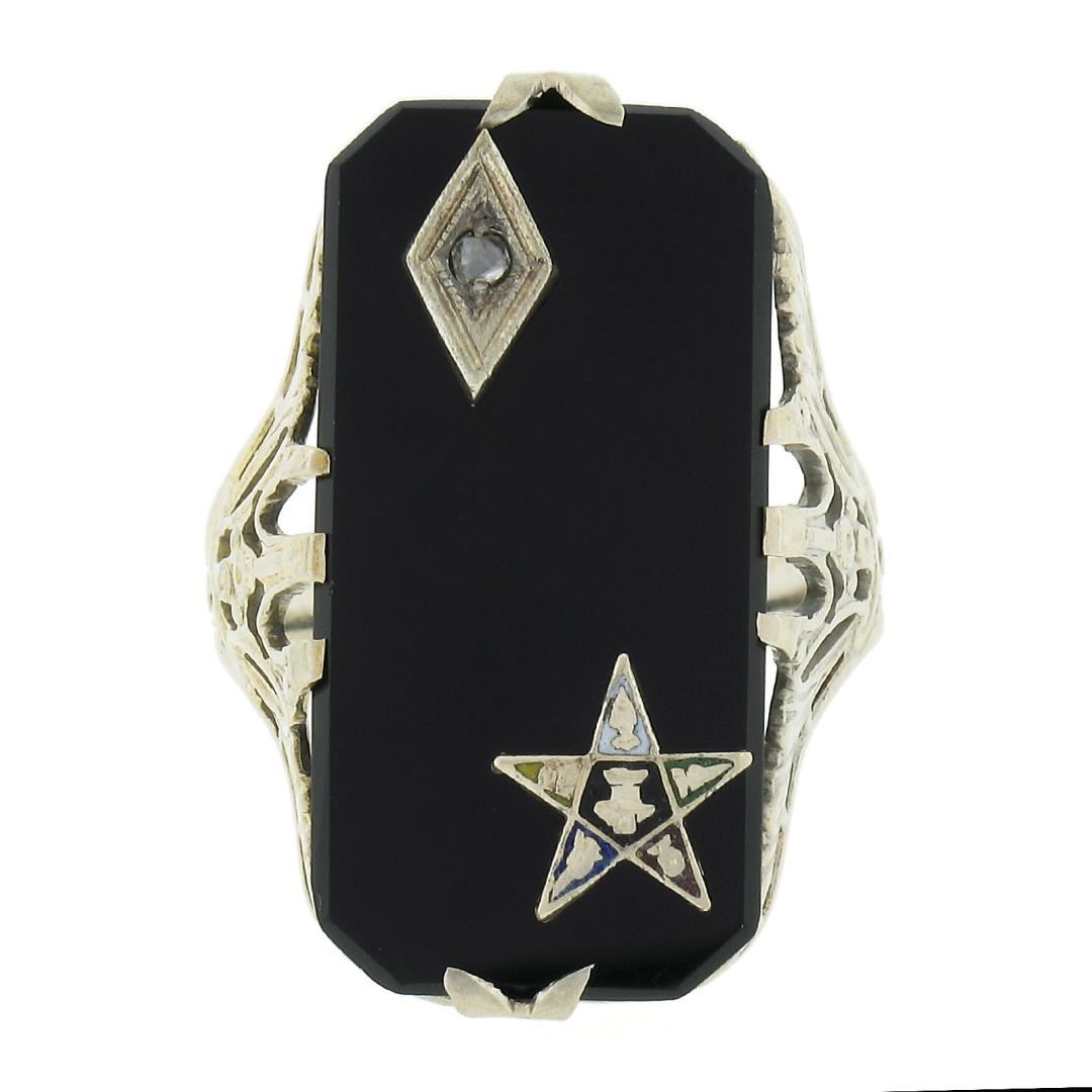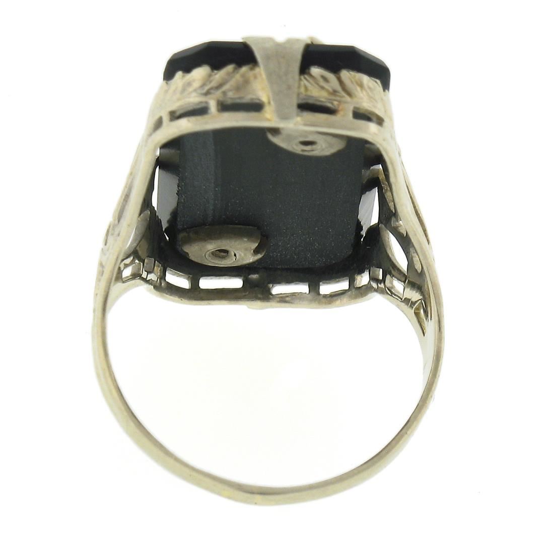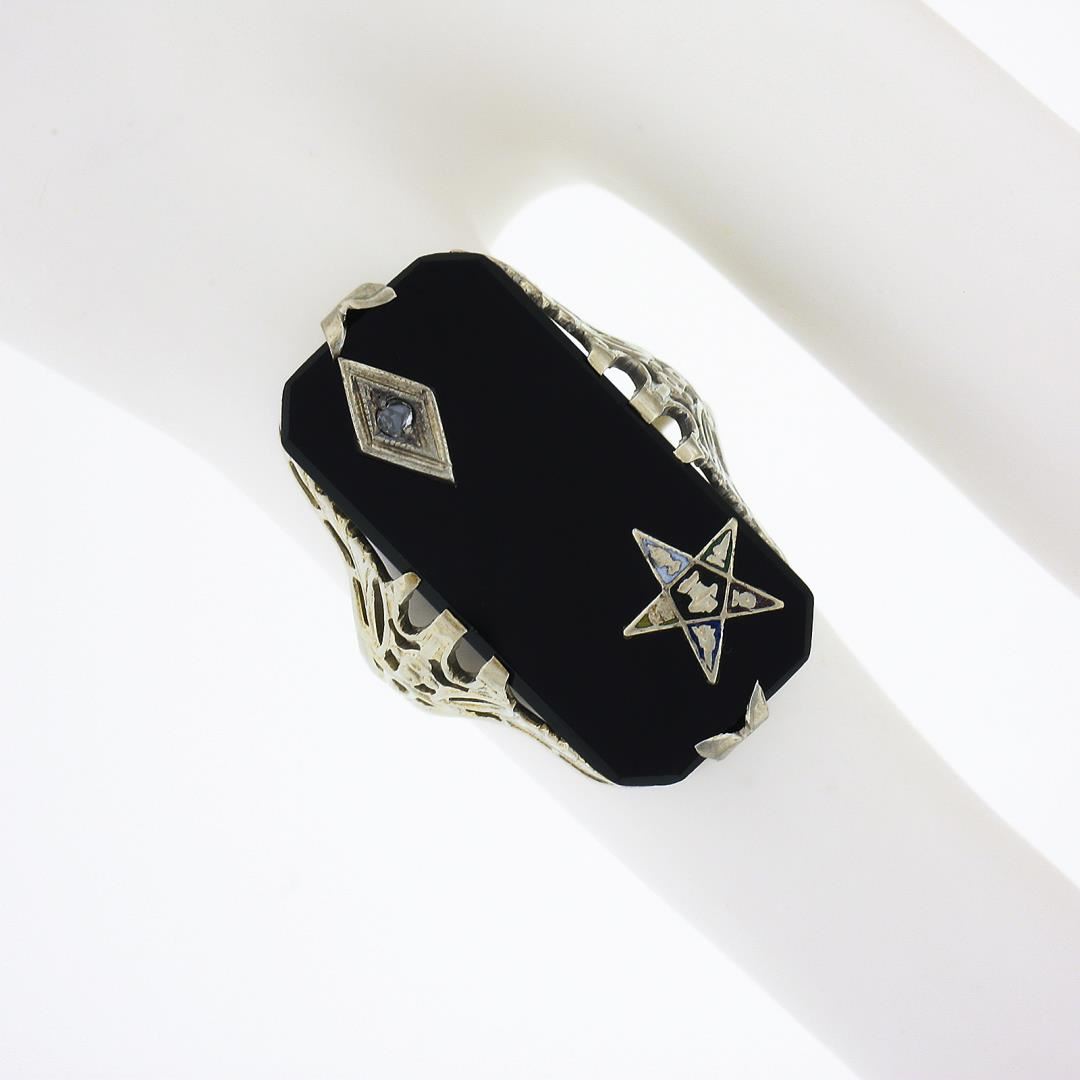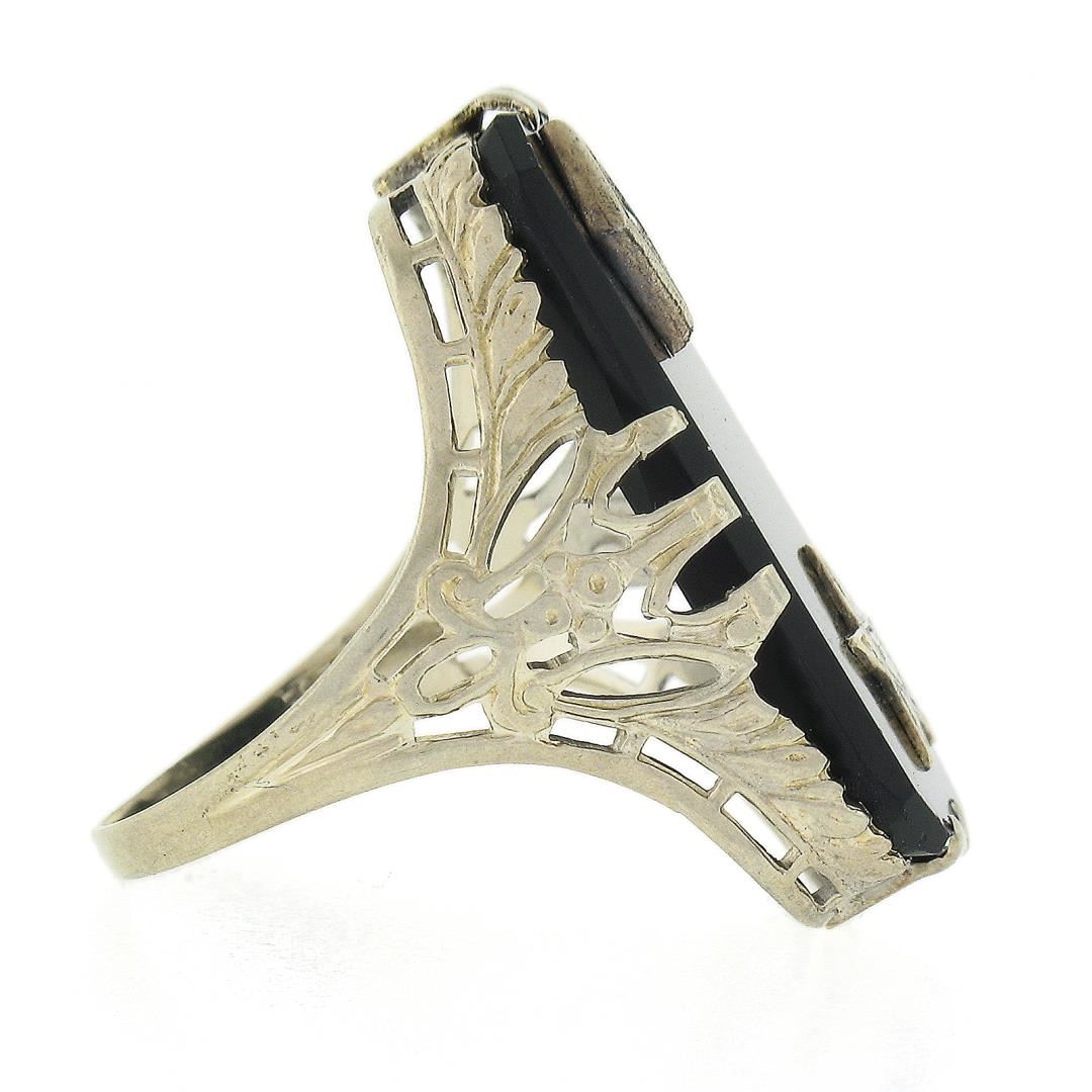 an antique solid 14k white gold ring, with 1 rectangular cut black onyx (22.1x11.3mm), and 1 old round cut natural diamond ( J - SI2 ; 0.02ct). The ring is size 4.0, weighs a total of 3.74 grams, and measures 23.4mm wide.