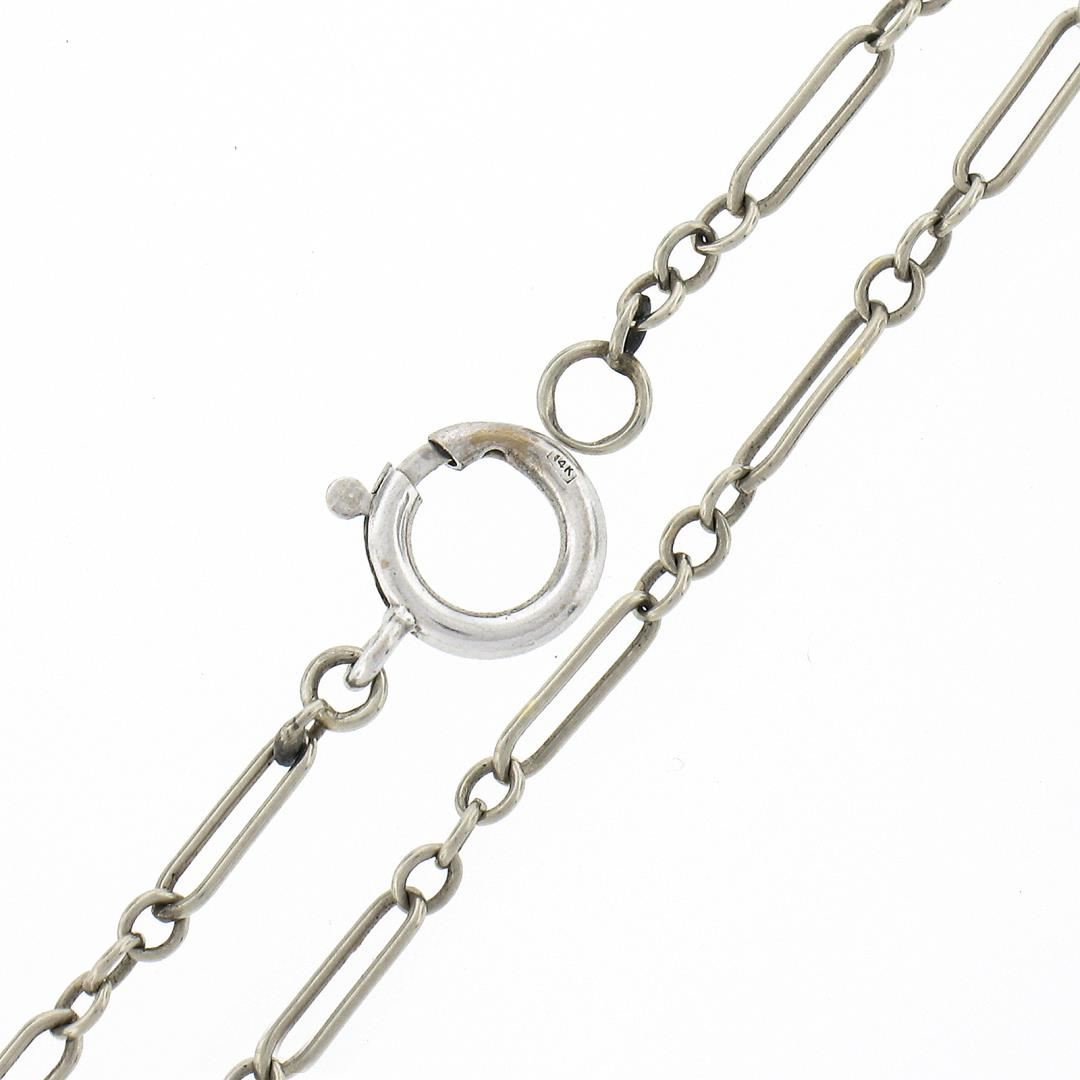 an antique solid 14k white gold dangle pendant necklace. with oval camphor glass & 1 old transitional cut natural diamond ( F - VS1 ; 0.04ct). 14 inch open filigree link chain, 9.54 grams total weight, pendant dangle measures 53.70x24mm.