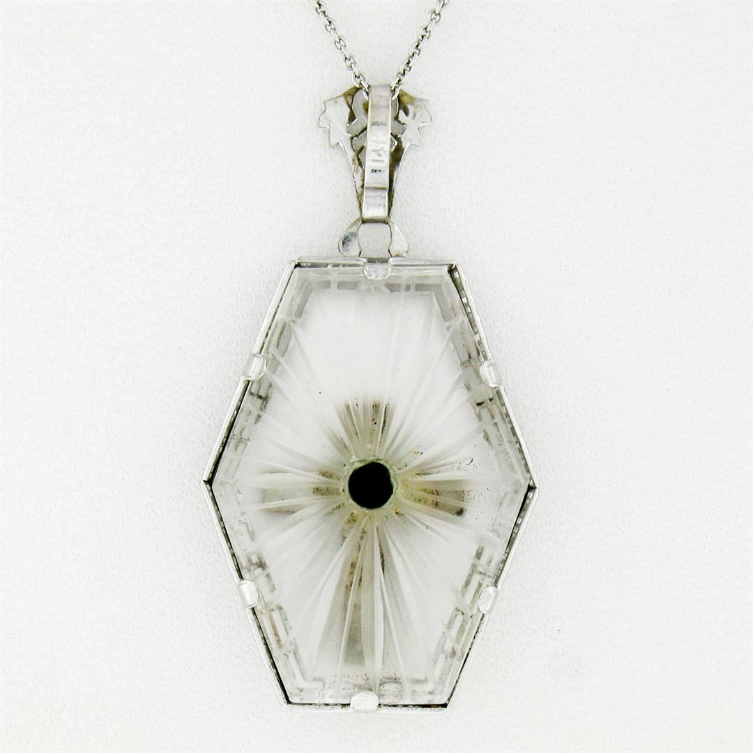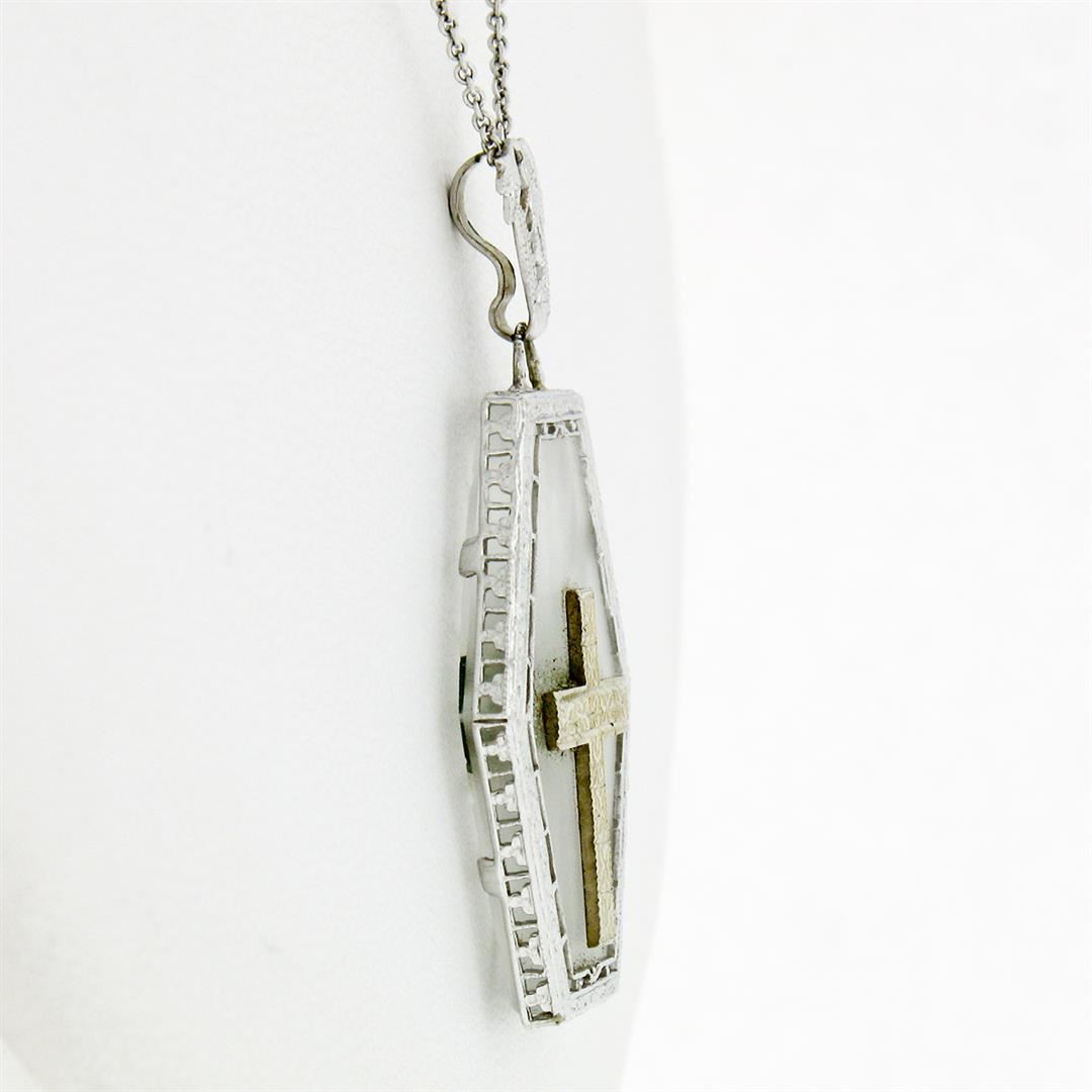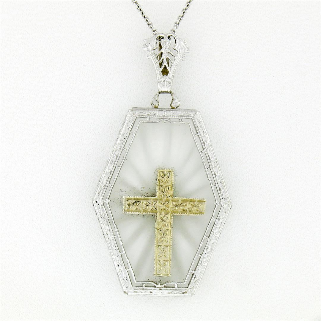 An antique art deco solid 14k white & yellow gold cross pendant necklace, with 1 french camphor glass. 16 inch cable link chain, 4.94 grams total weight, pendant measures 36.55x19.50mm.