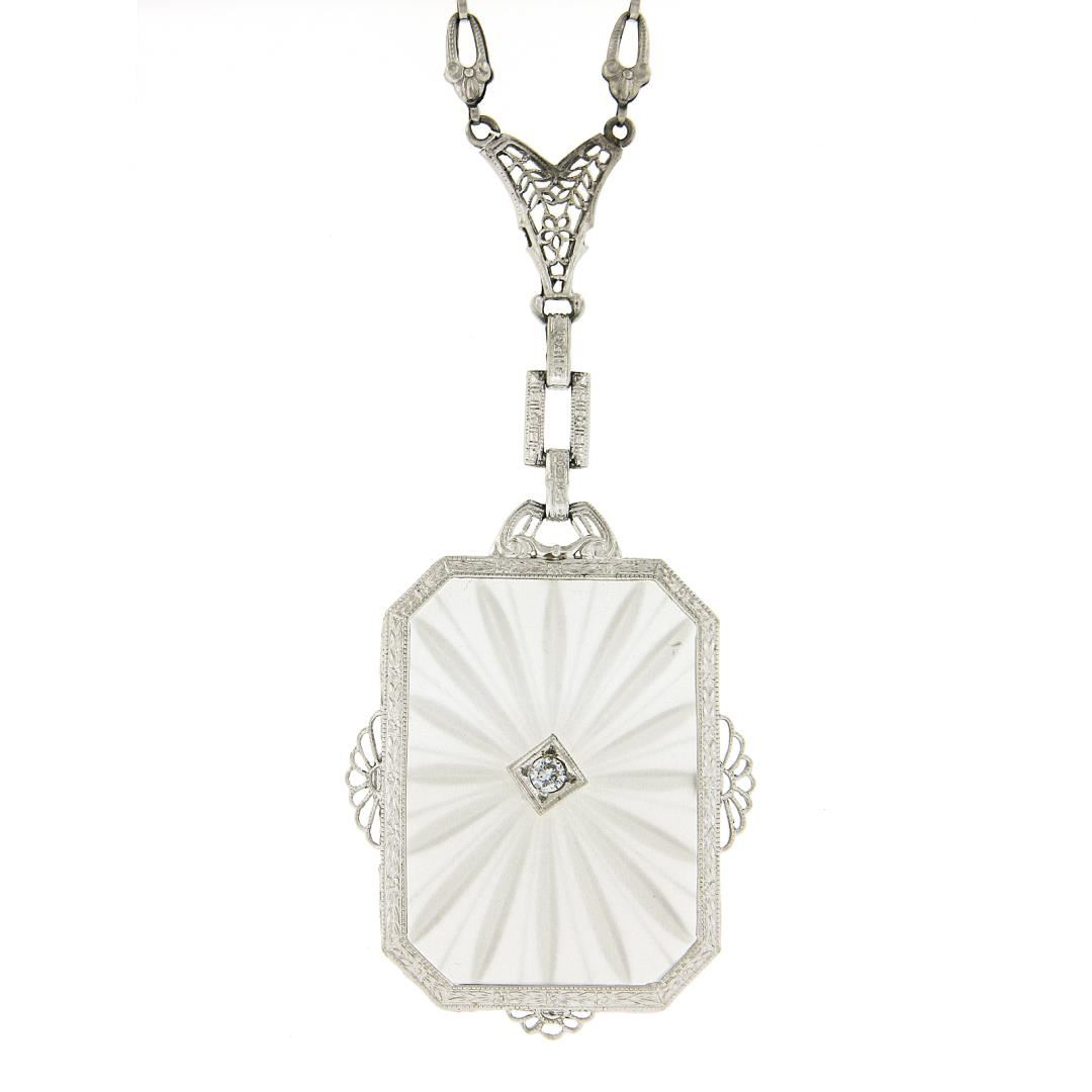 An antique solid 14k white gold pendant necklace, with 1 camphor glass, and 1 old european cut natural diamond (G/H - SI2; 0.05ctw). 16 inch etched repousse open link chain, 11.48 grams total weight, pendant measures 37x28.2mm.