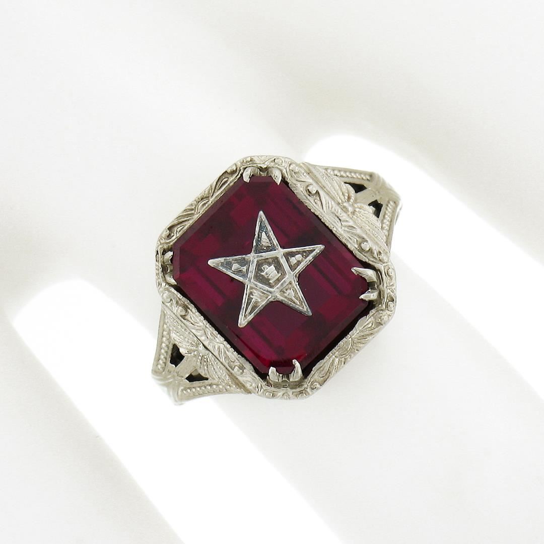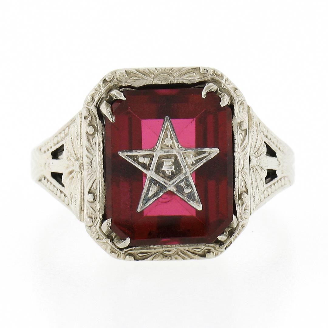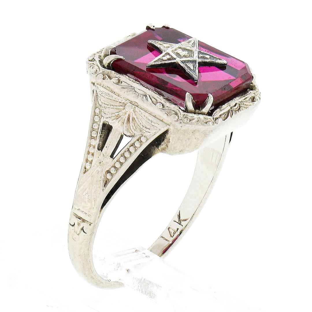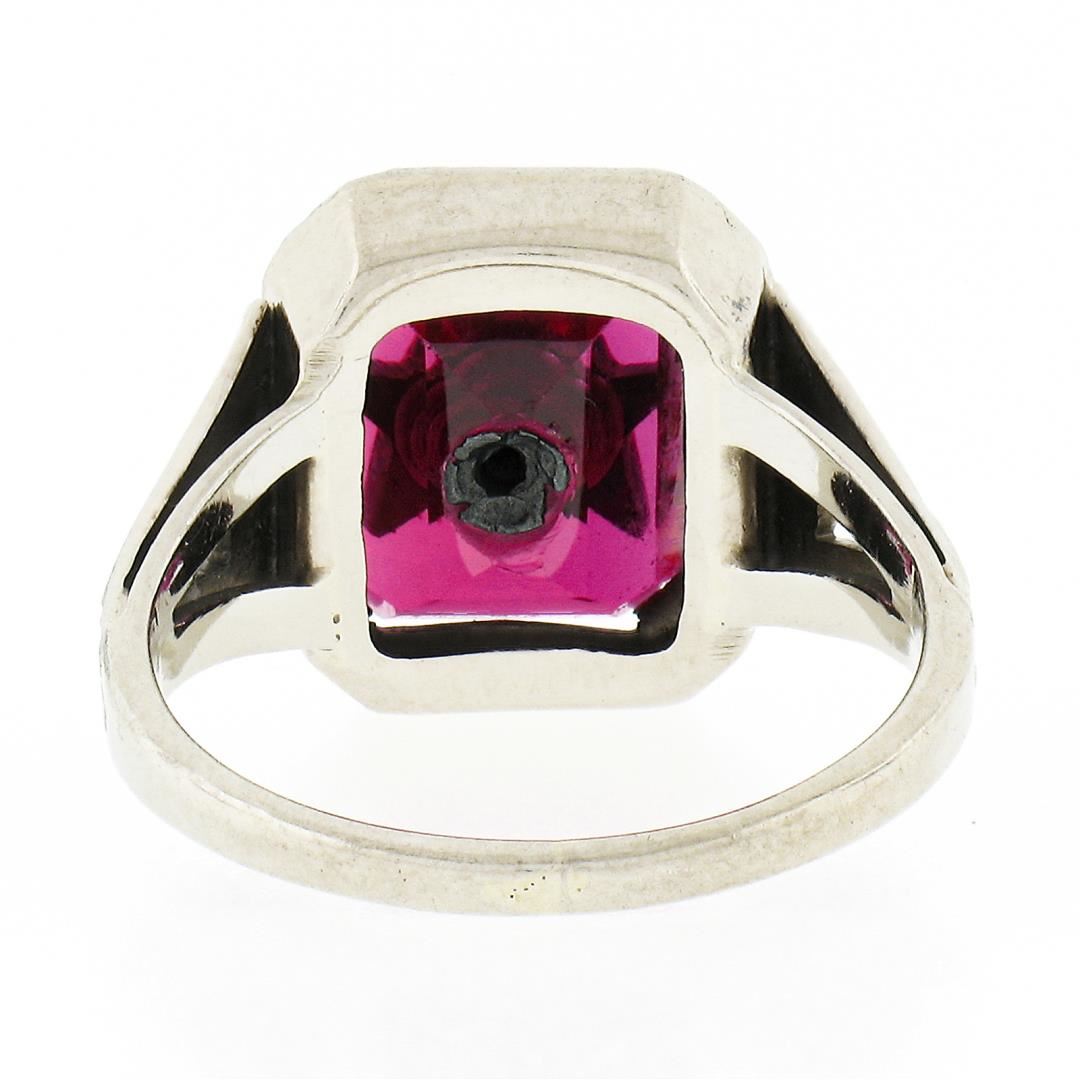 An antique solid 14k white gold ring, with 1 emerald cut red stone (10.2x8.4mm ). The ring is size 5.0, weighs a total of 3.13 grams, and measures 12.7mm wide.