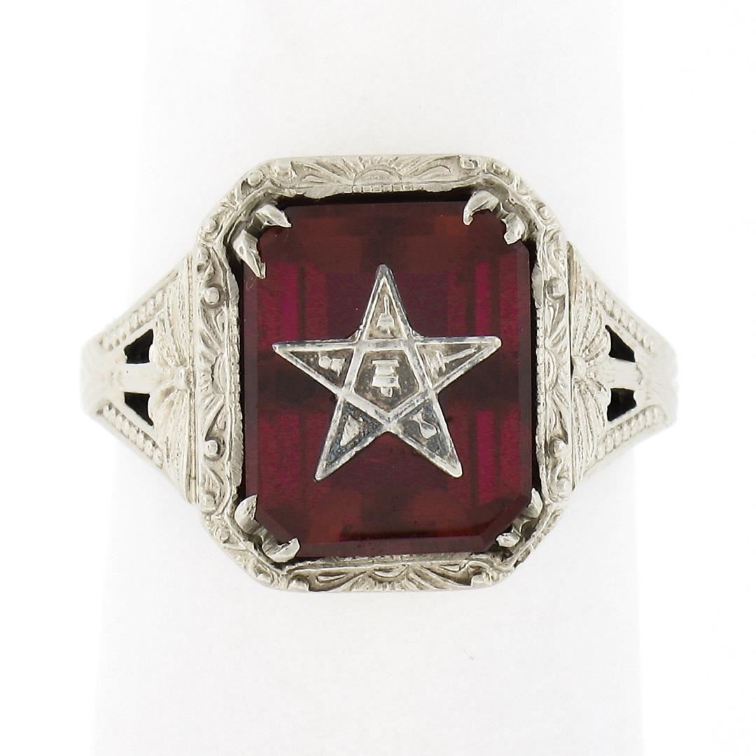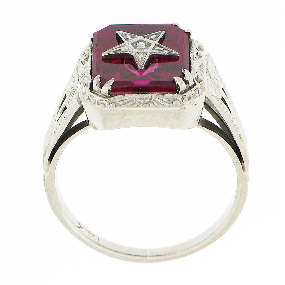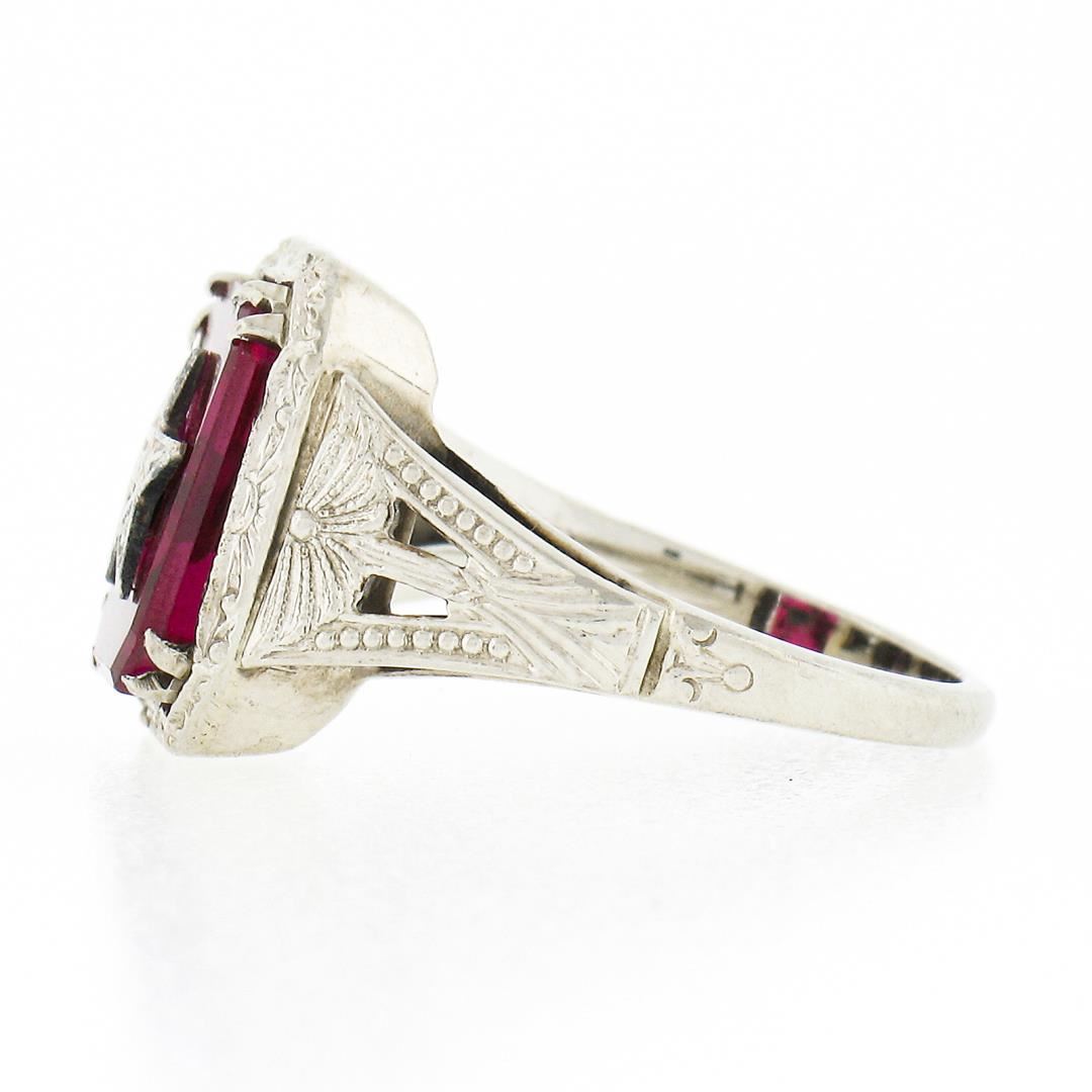 An antique solid 14k white gold ring, with 1 emerald cut red stone (10.2x8.4mm ). The ring is size 5.0, weighs a total of 3.13 grams, and measures 12.7mm wide.