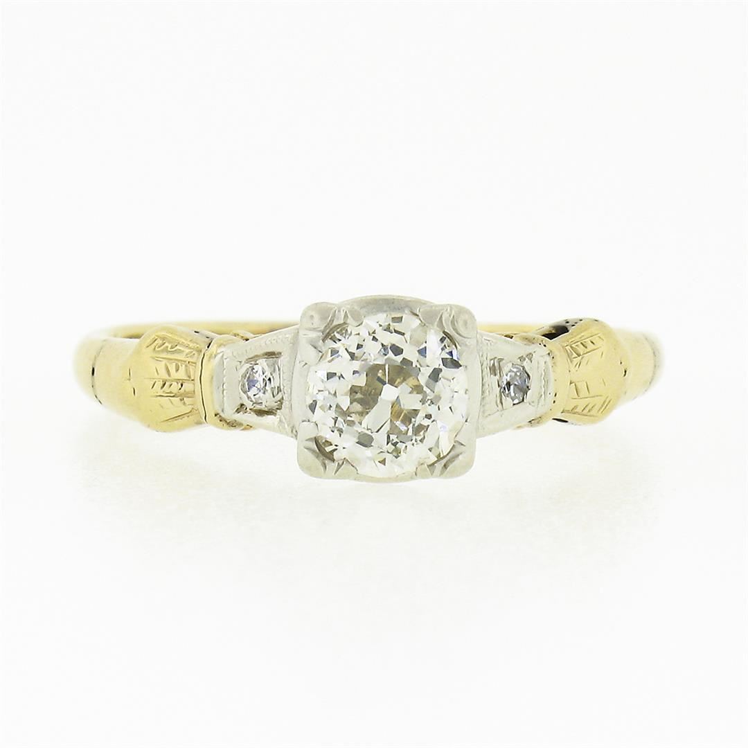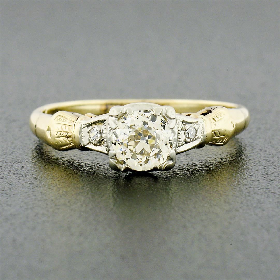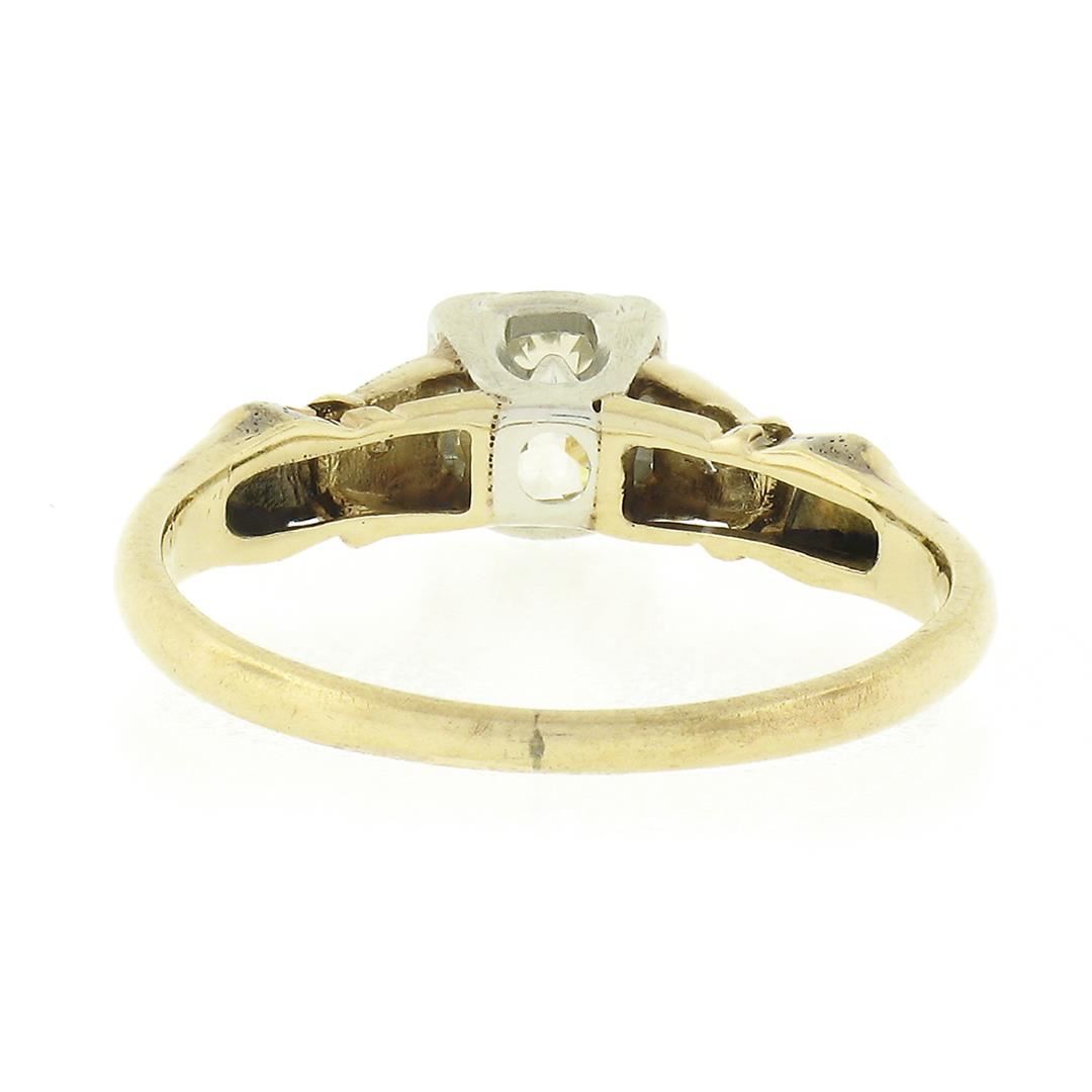 An antique solid 14k yellow and white gold engagement ring, with 1 old european cut natural diamond (M/N - VS2 ; 0.50ct), accented with 2 old single cut natural diamonds (H/I - VS2 ; 0.04ctw). The ring is size 5.5, weighs a total of 1.67 grams, and measures 5.65mm wide.