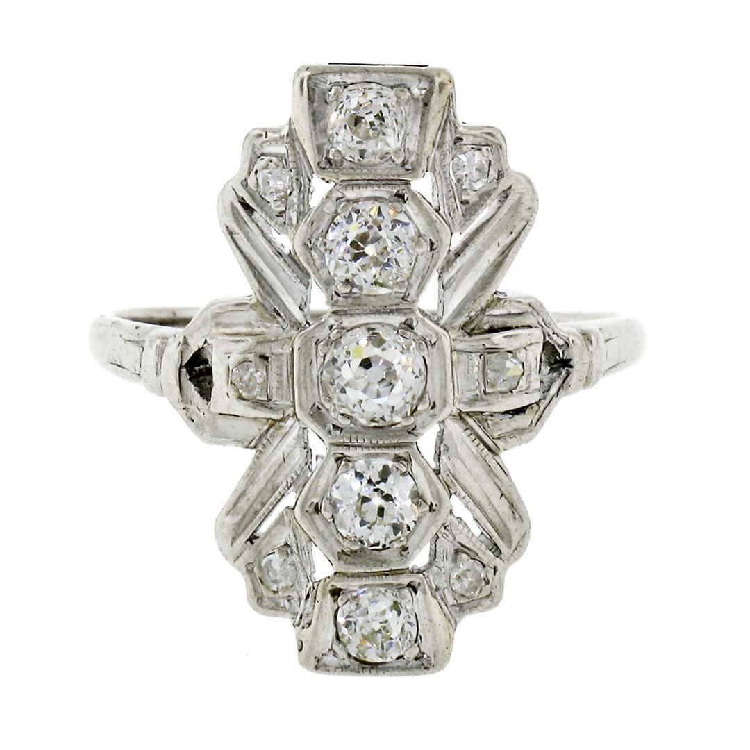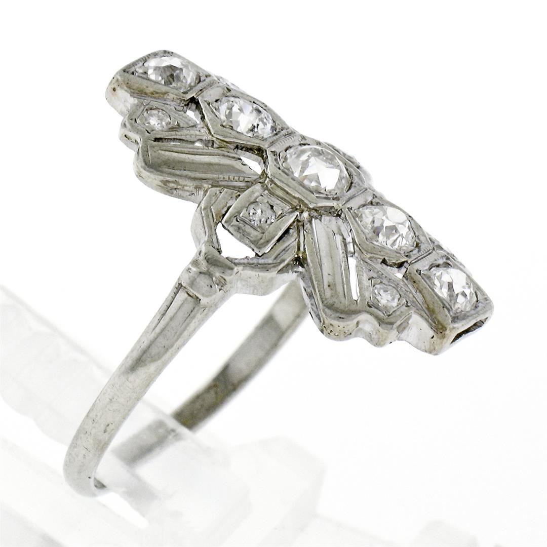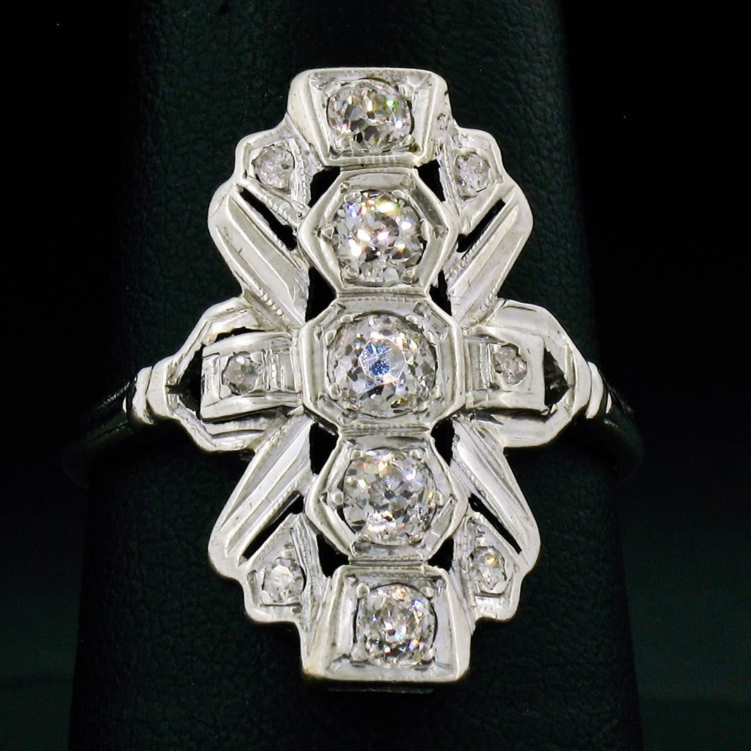 An antique soldi 14k white gold milgrain dinner ring, with 6 round single cut natural diamonds (G/H- VS2/SI1; 0.10ctw ), and 5 old european cut natural diamonds (G/H-VS1/VS2; 0.50ctw ). The ring is size 6.0, weighs a total of 2.69 grams, and measures 19.70mm wide.