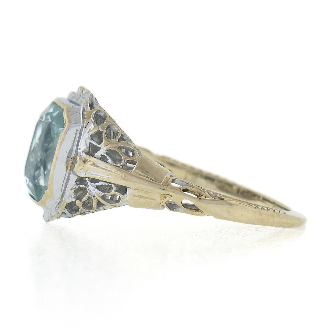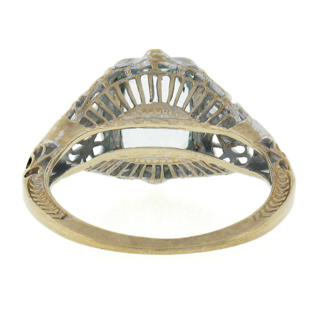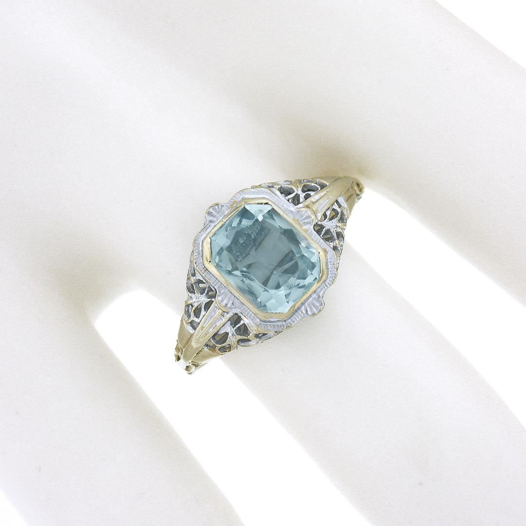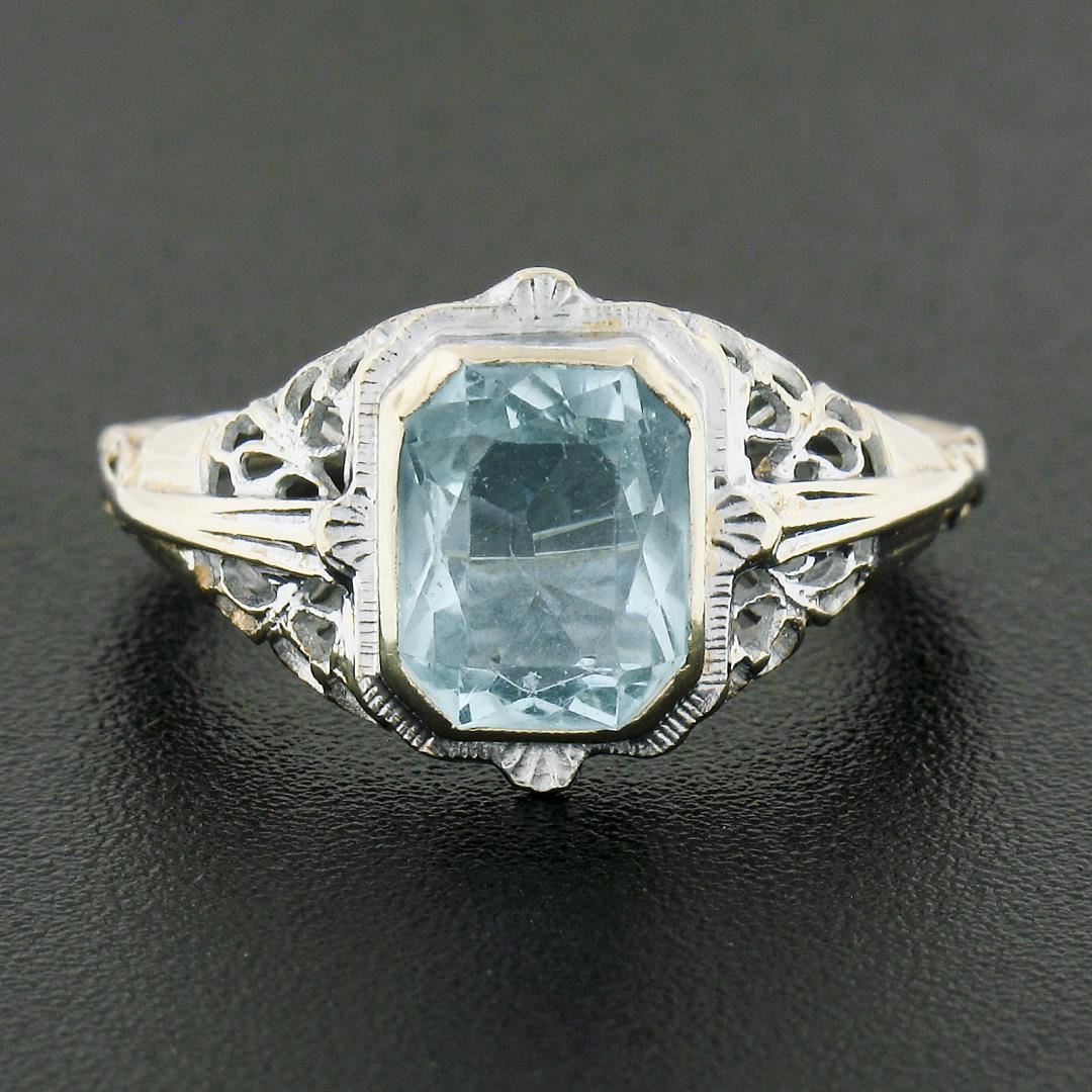 An antique solid 14k white gold ring, with 1 rectangular cut natural aquamarine (1.50ct ). The ring is size 5.5, weighs a total of 2.47 grams, and measures 11.5mm wide.