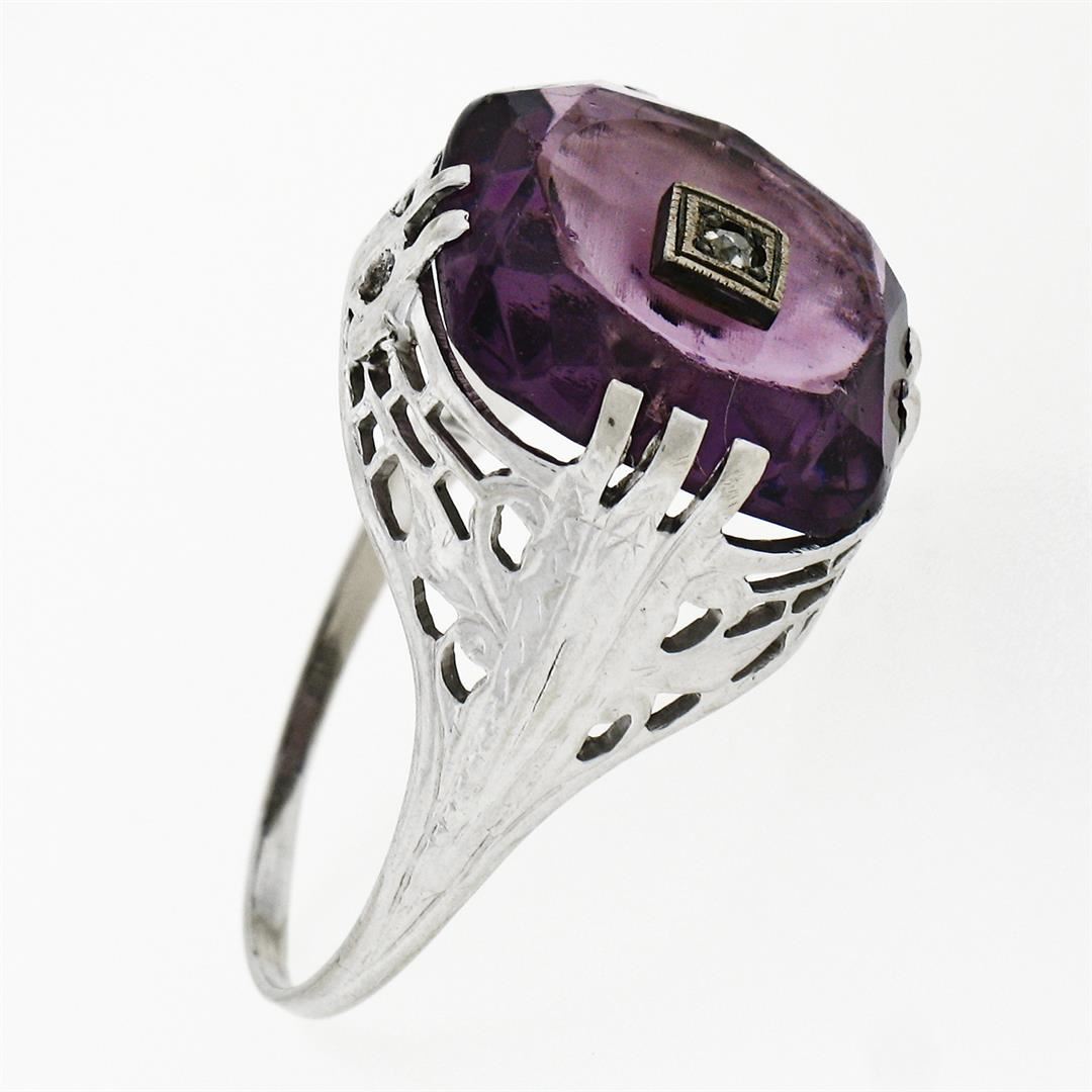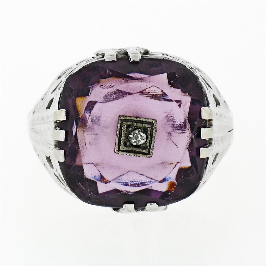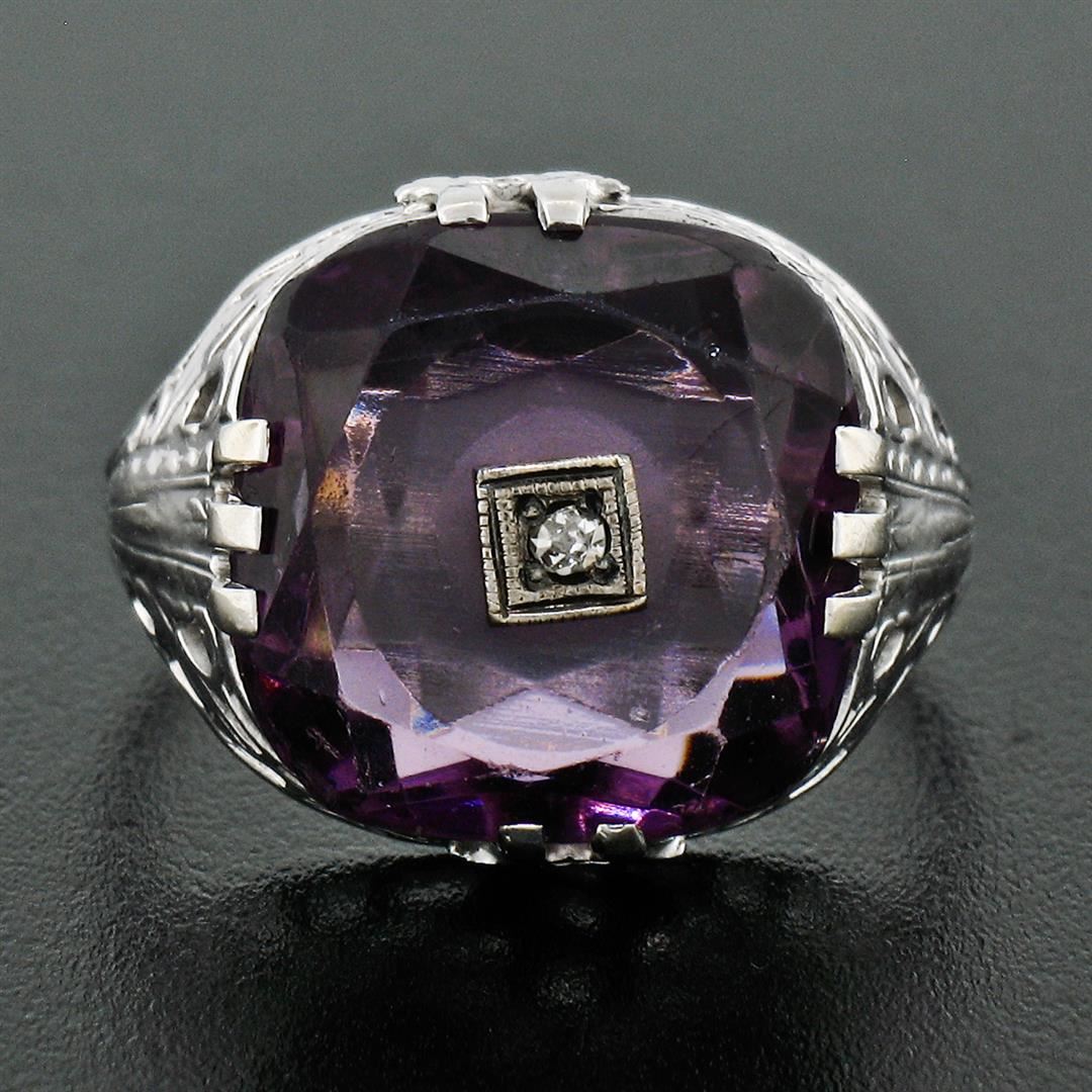 An antique solid 14k white gold filigree ring, with 1 custom cut natural amethyst (13.0x13.0mm), and 1 old single cut natural diamond (H - VS2 ; 0.02ct). The ring is size 7.5, weighs a total of 3.77 grams, and measures 14.65mm wide.