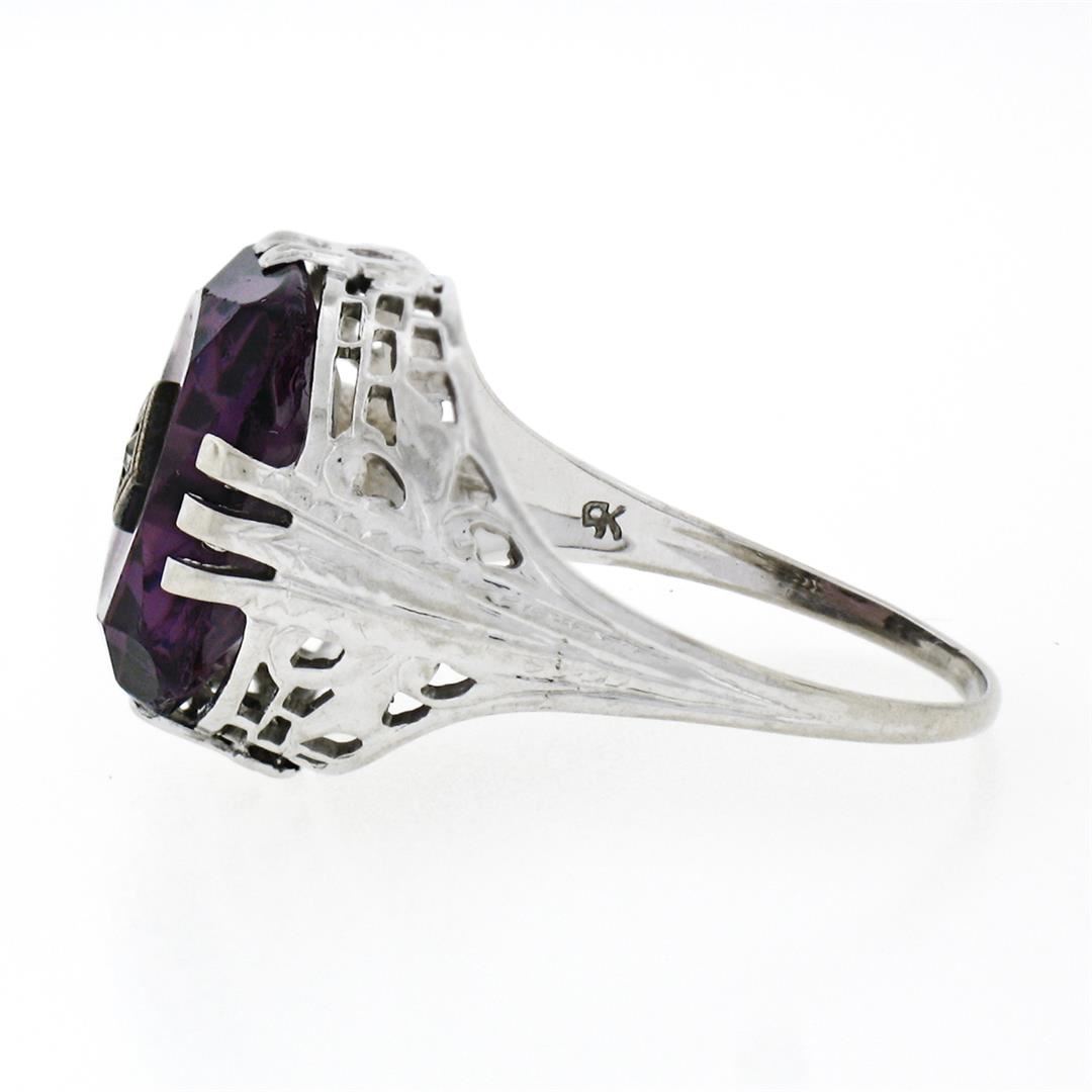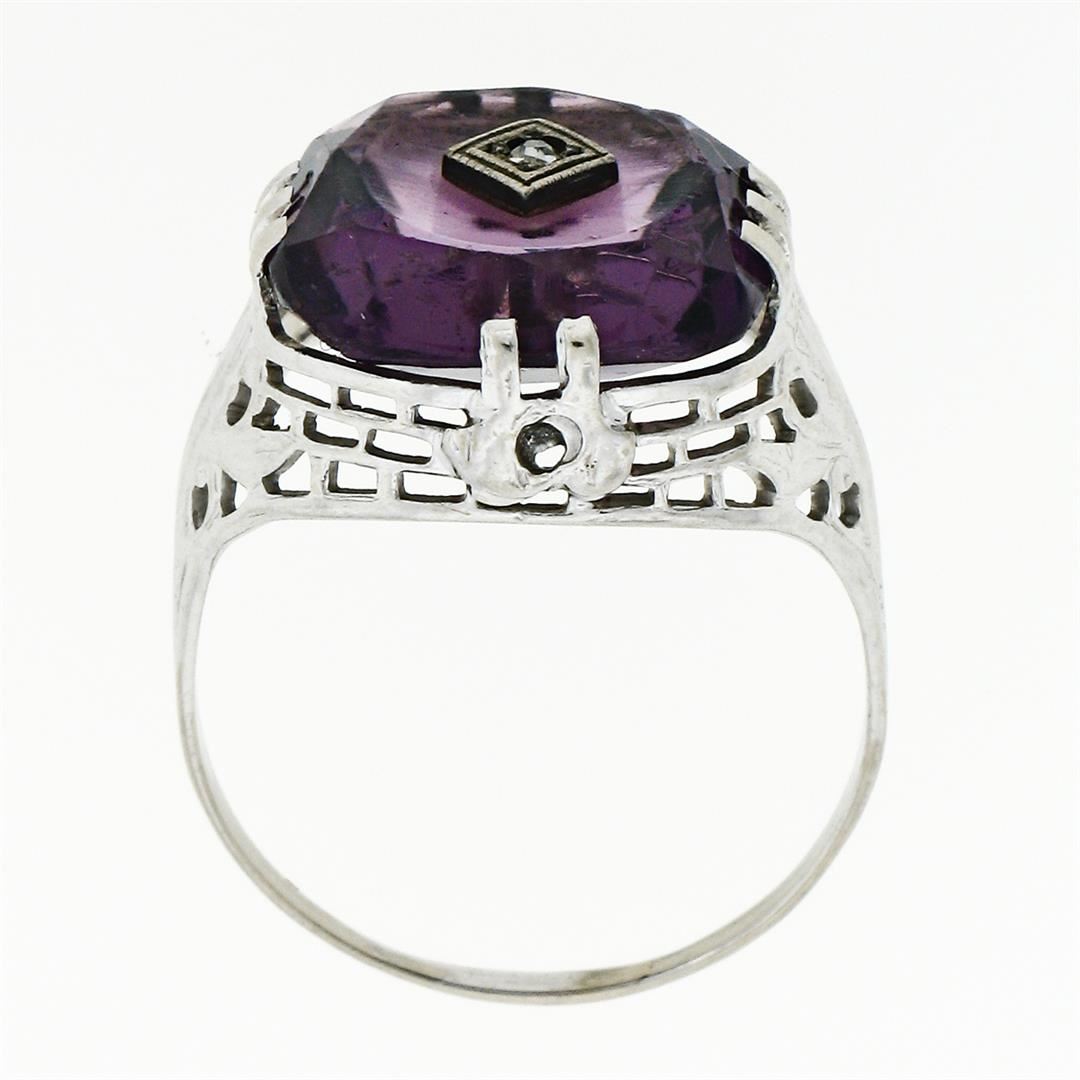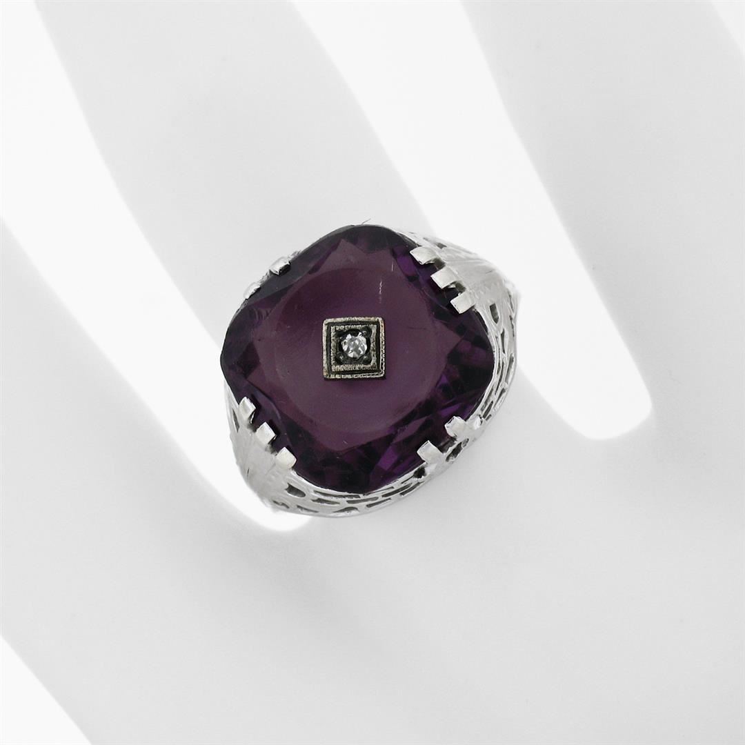 An antique solid 14k white gold filigree ring, with 1 custom cut natural amethyst (13.0x13.0mm), and 1 old single cut natural diamond (H - VS2 ; 0.02ct). The ring is size 7.5, weighs a total of 3.77 grams, and measures 14.65mm wide.