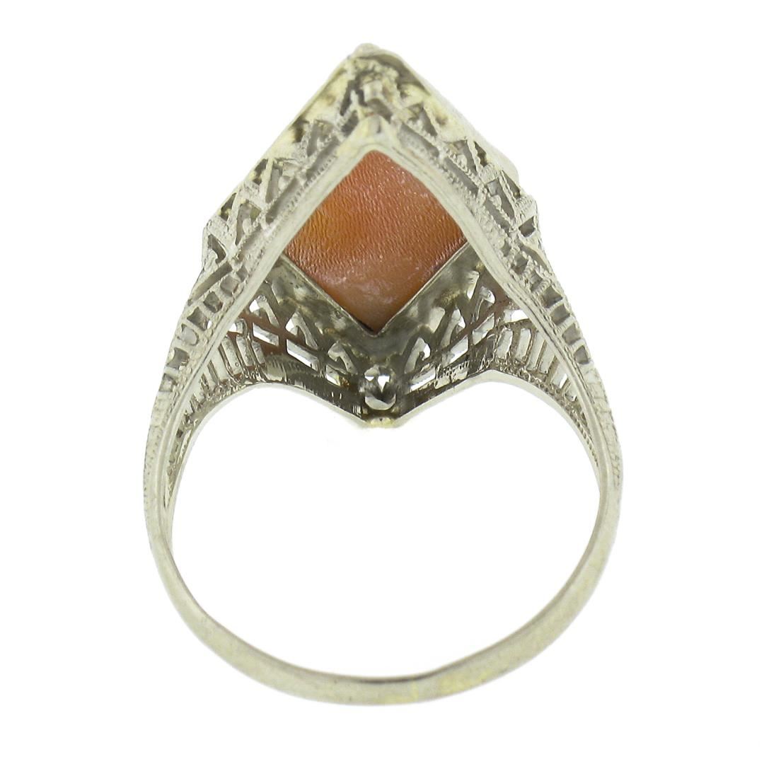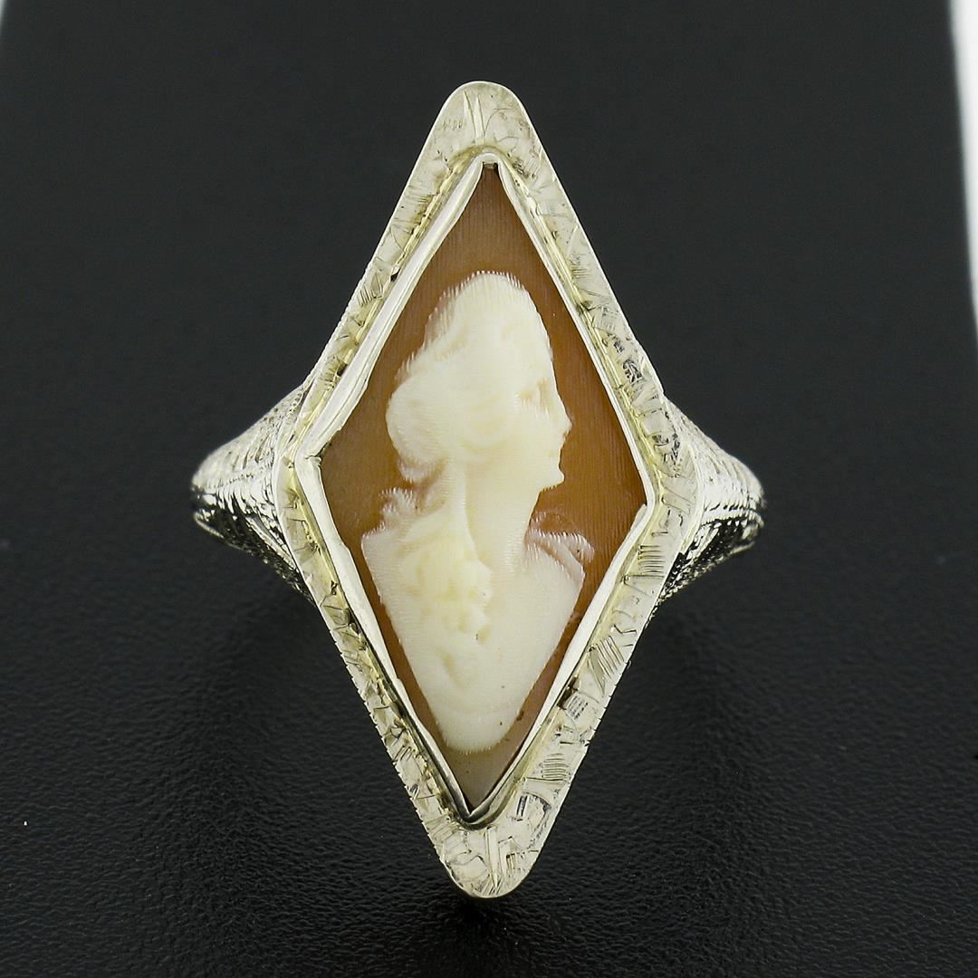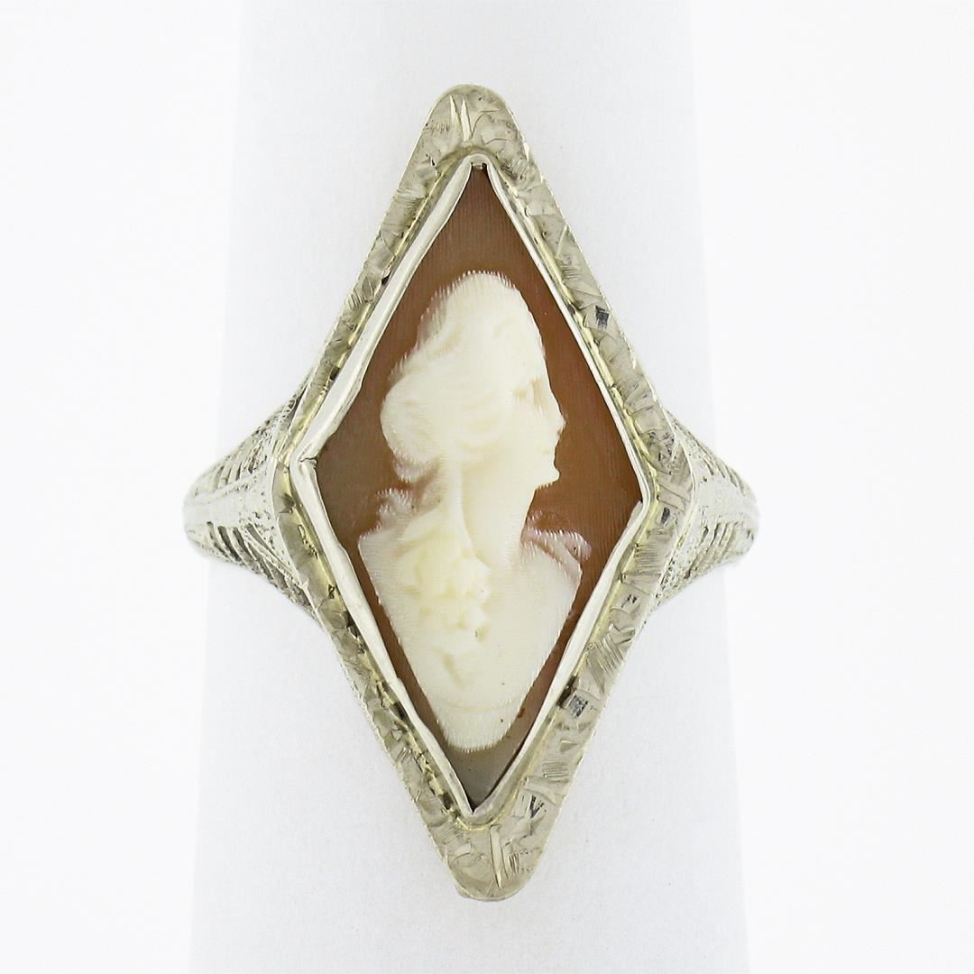 An antique solid 14k white gold ring, with 1 carved shell cameo (18.8x9.8mm). The ring is size 5.0, weighs a total of 3.0 grams, and measures 24mm wide.