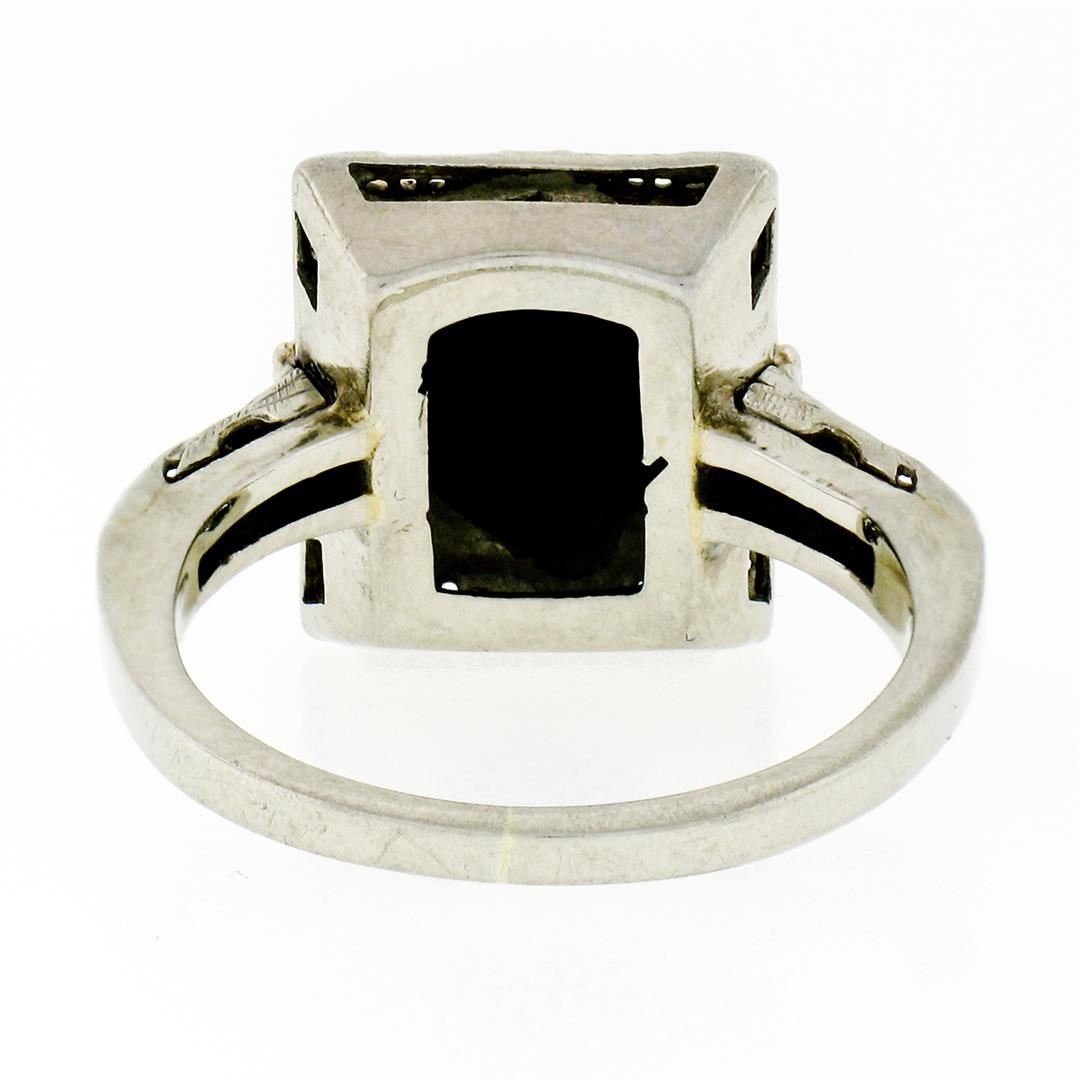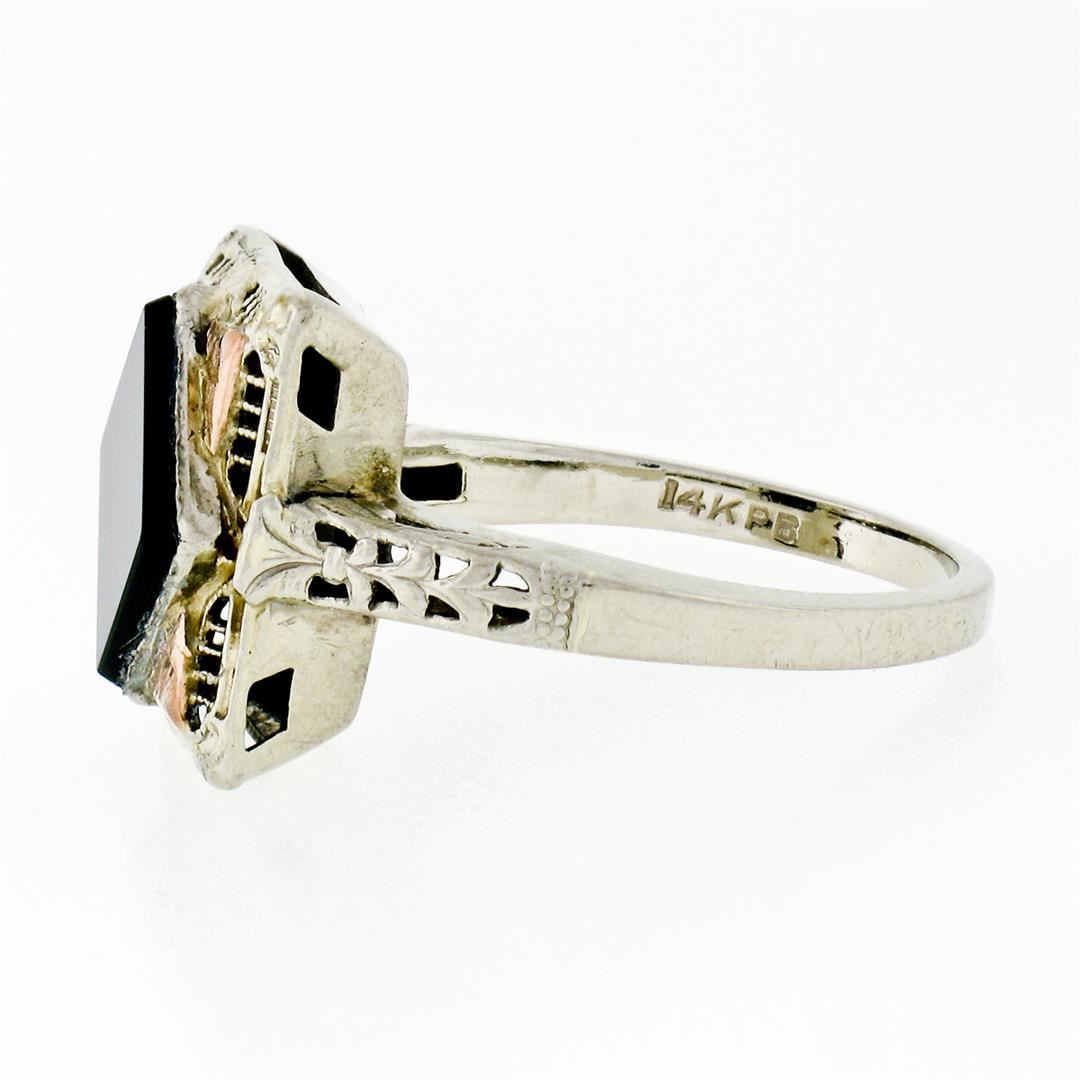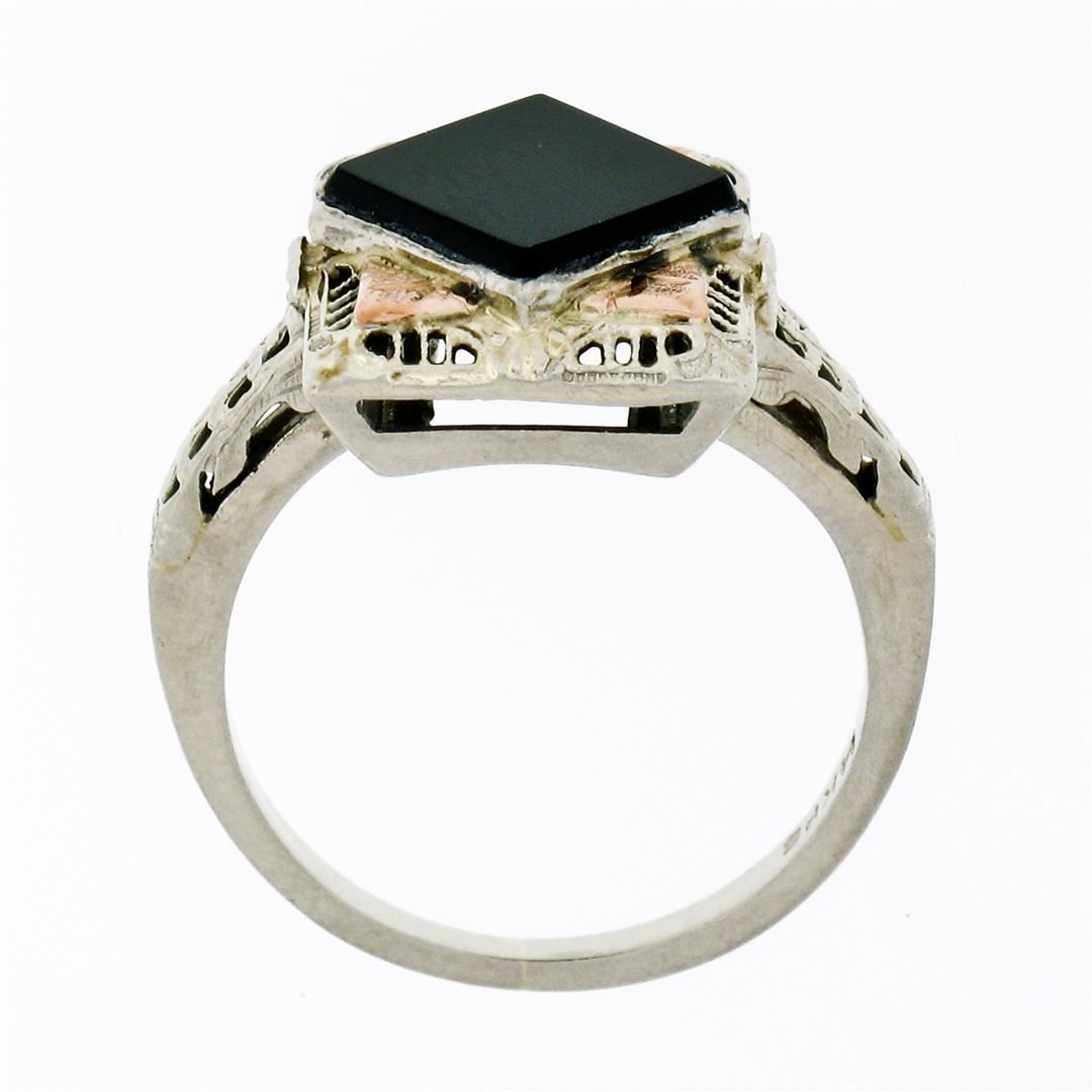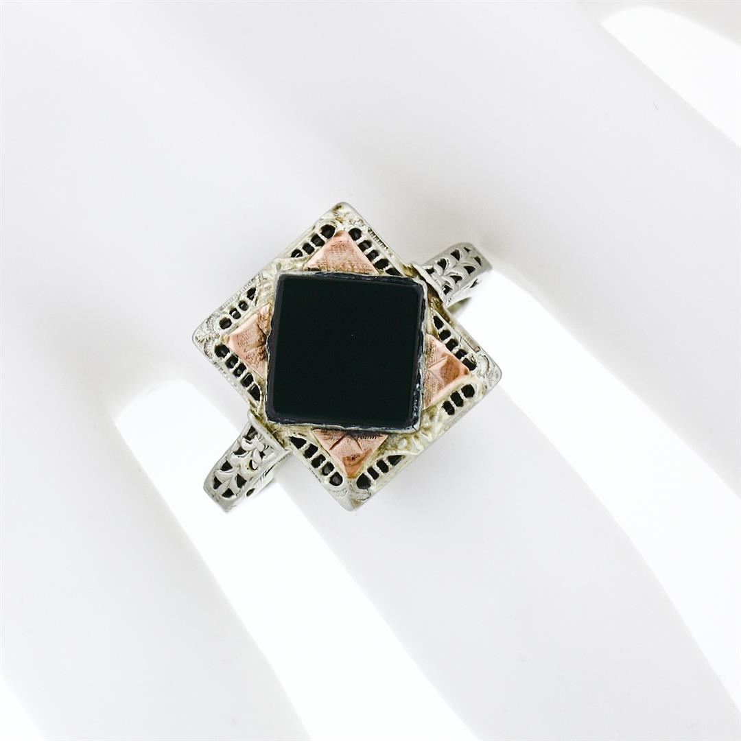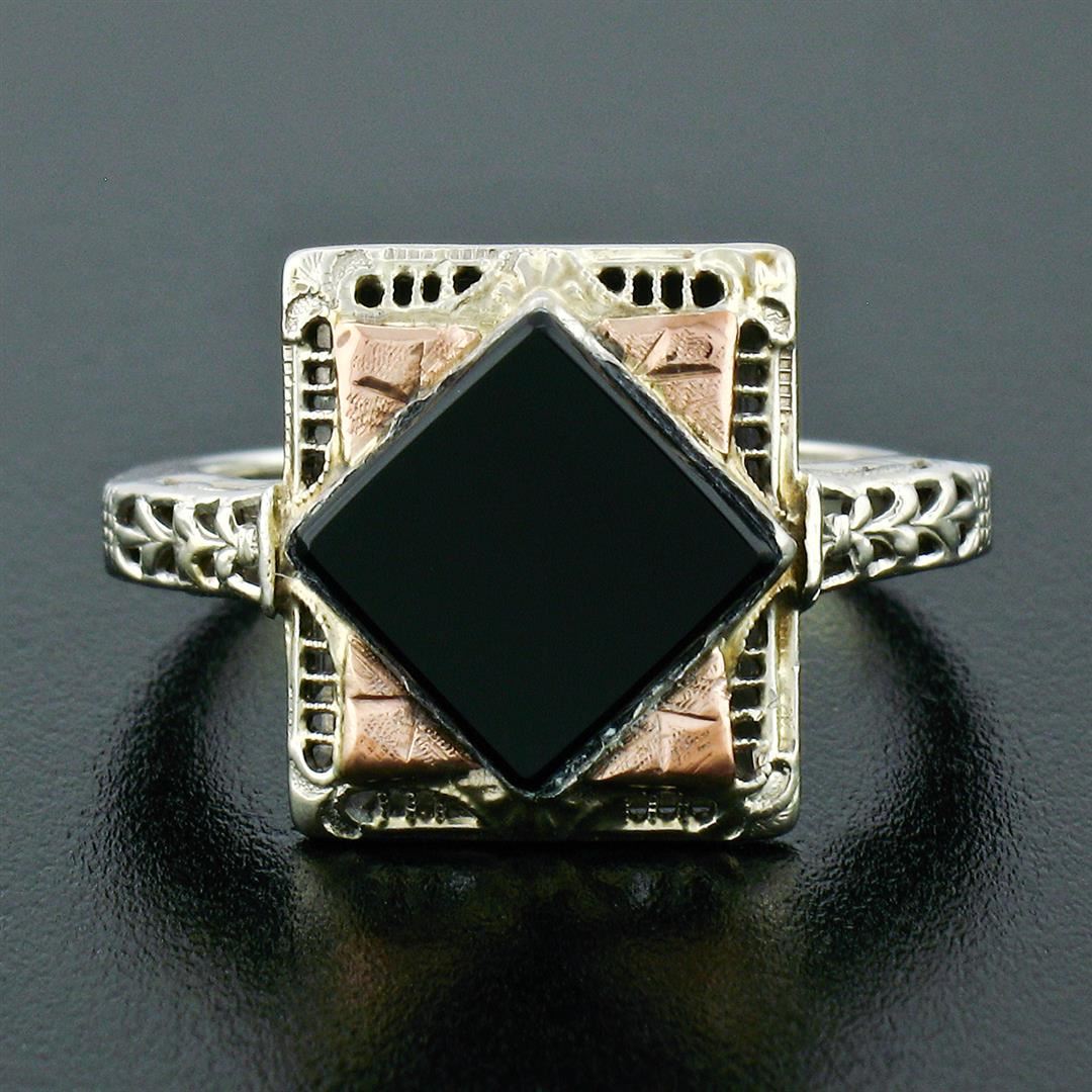 An antique solid 14k white and rose gold filigree ring, with 1 square shape natural onyx (8.3mm). The ring is size 7.0, weighs a total of 4.05 grams, and measures 13.8mm wide.