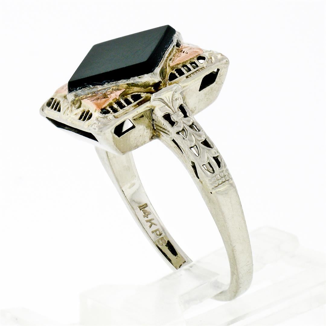 An antique solid 14k white and rose gold filigree ring, with 1 square shape natural onyx (8.3mm). The ring is size 7.0, weighs a total of 4.05 grams, and measures 13.8mm wide.