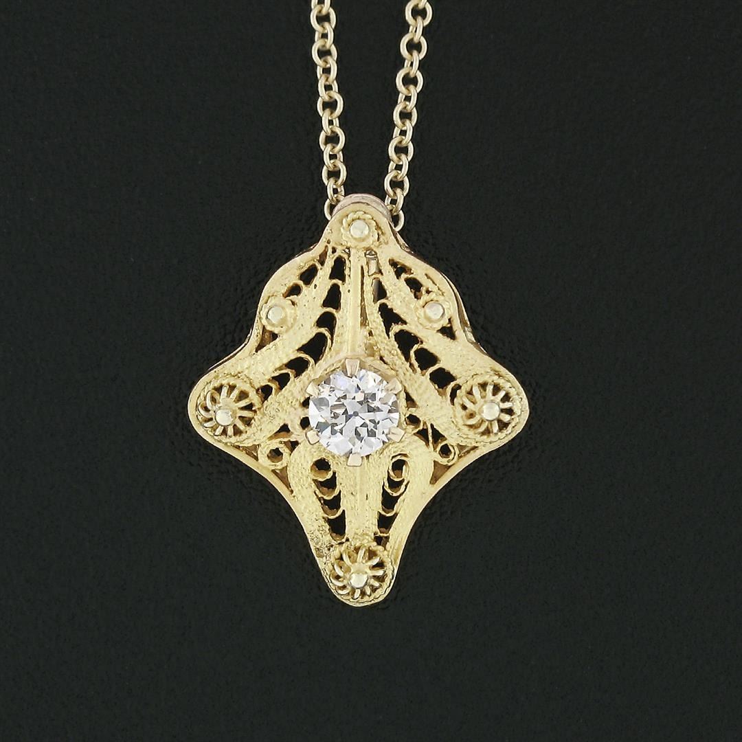 An antique art deco solid 14k yellow gold pendant necklace, featuring 1 old european cut natural diamond (F - VS2 ; 0.16ct). 18 inch cable link chain, 3.0 grams total weight, pendant measures 16x13.35mm.