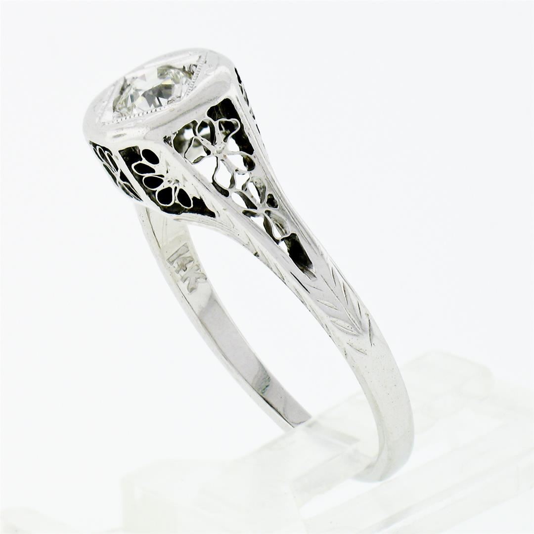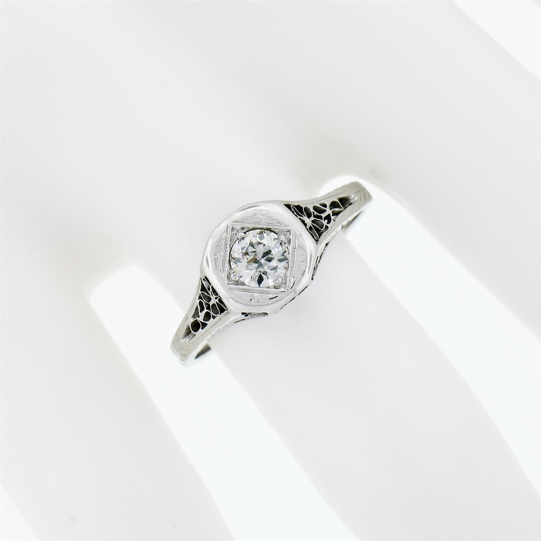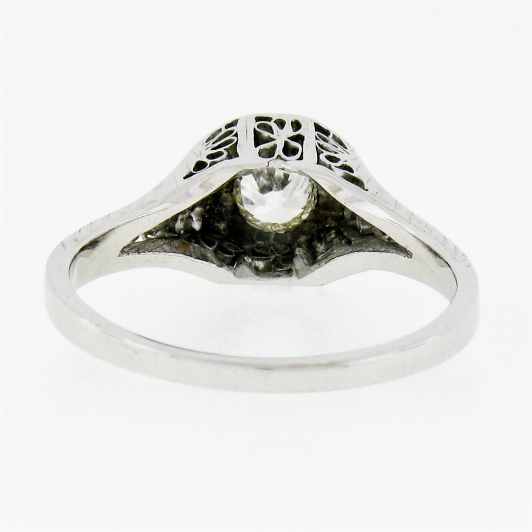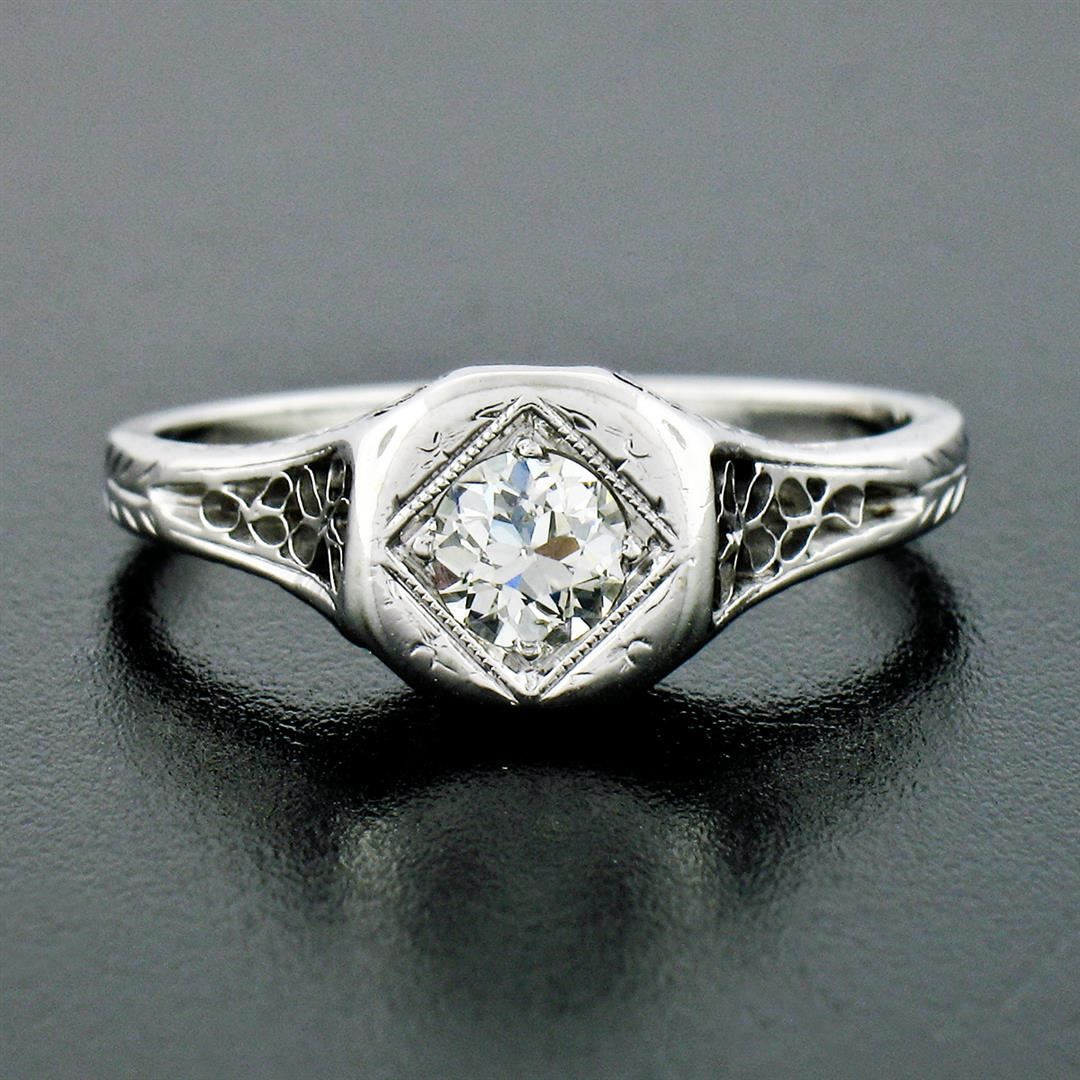 An antique soldi 14k white gold solitaire ring, with 1 old european cut natural diamond (I/J- VS2 ; 0.36ct ). The ring is size 7.5, weighs a total of 2.61 grams, and measures 7.90mm wide.
