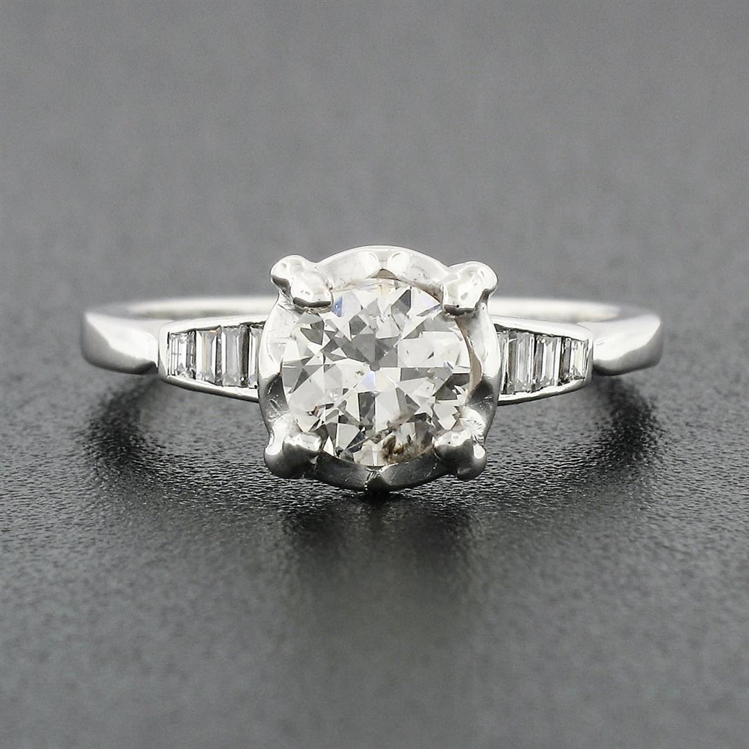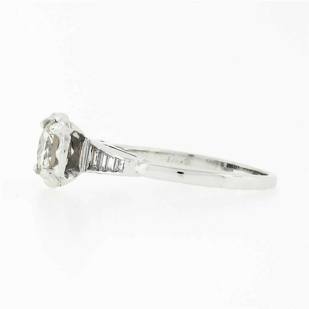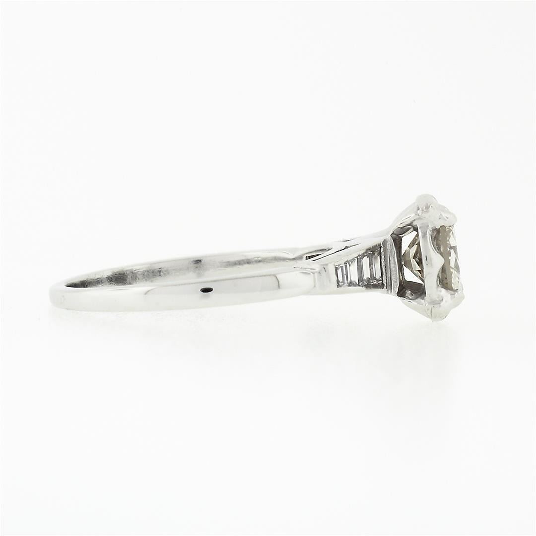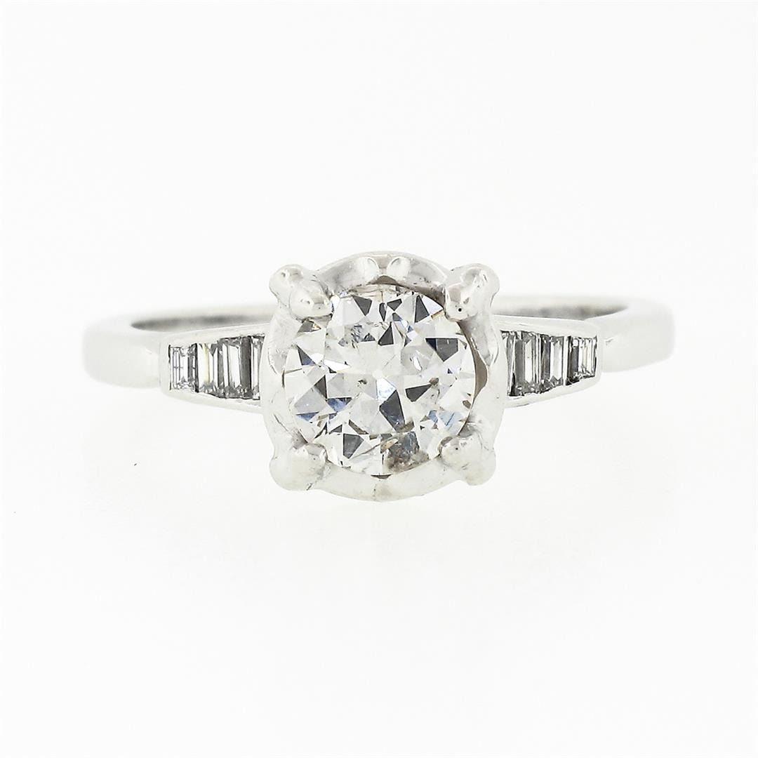 An antique art deco solid 14k white gold engagement ring, with 1 old european cut natural diamond (H - I1 ; 0.71ct ), and 8 straight baguette cut natural diamonds (G/H - VS2 ; 0.26ctw). The ring is size 5.0, weighs a total of 2.3 grams, and measures 7.5mm wide.