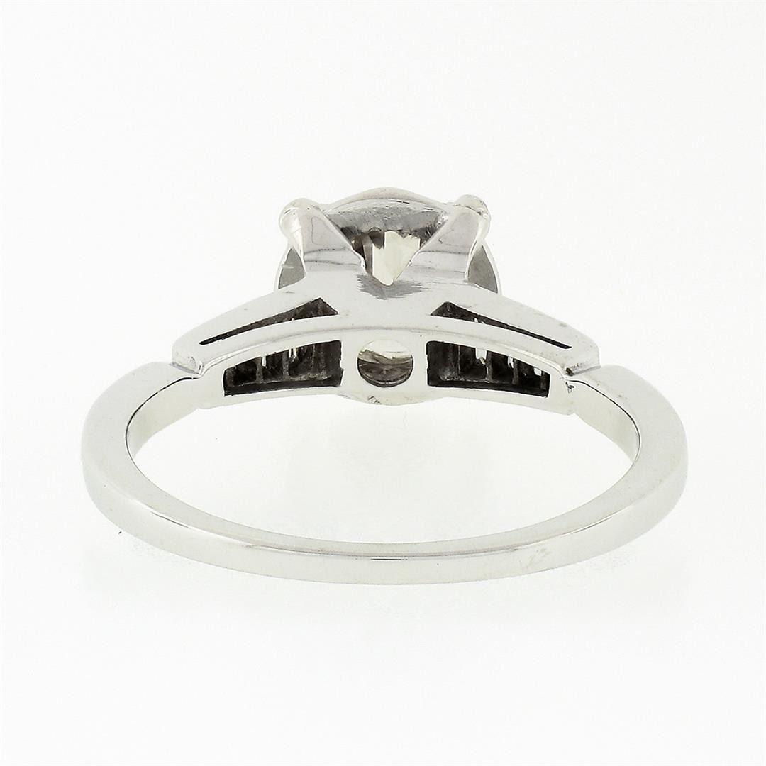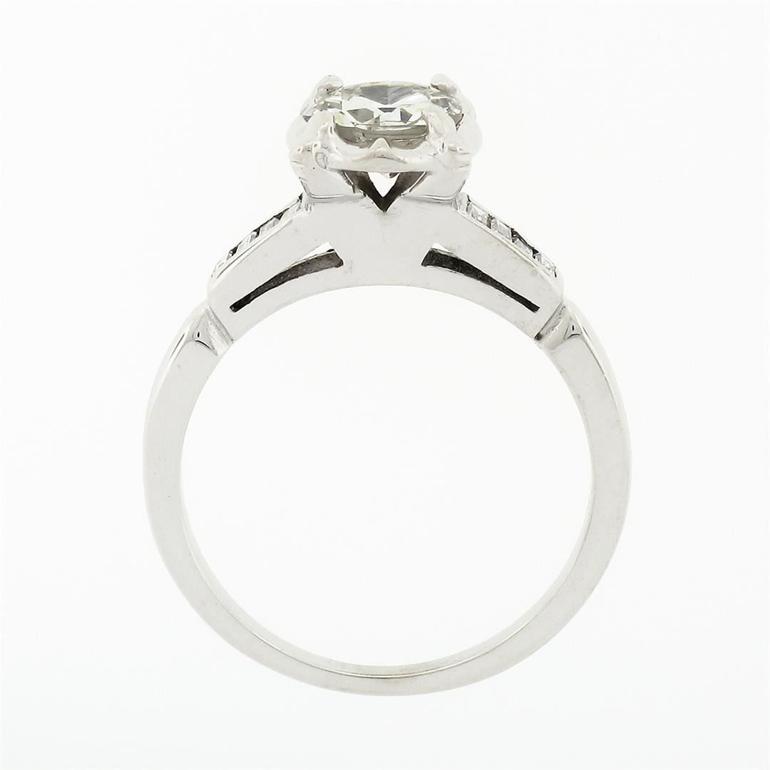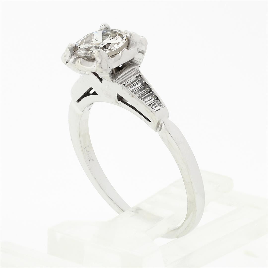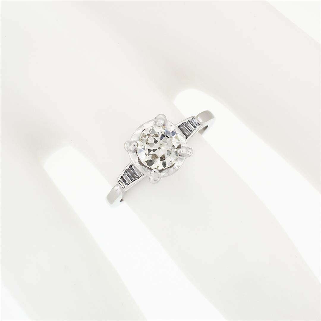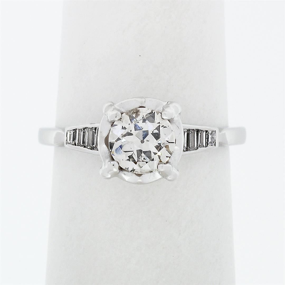 An antique art deco solid 14k white gold engagement ring, with 1 old european cut natural diamond (H - I1 ; 0.71ct ), and 8 straight baguette cut natural diamonds (G/H - VS2 ; 0.26ctw). The ring is size 5.0, weighs a total of 2.3 grams, and measures 7.5mm wide.