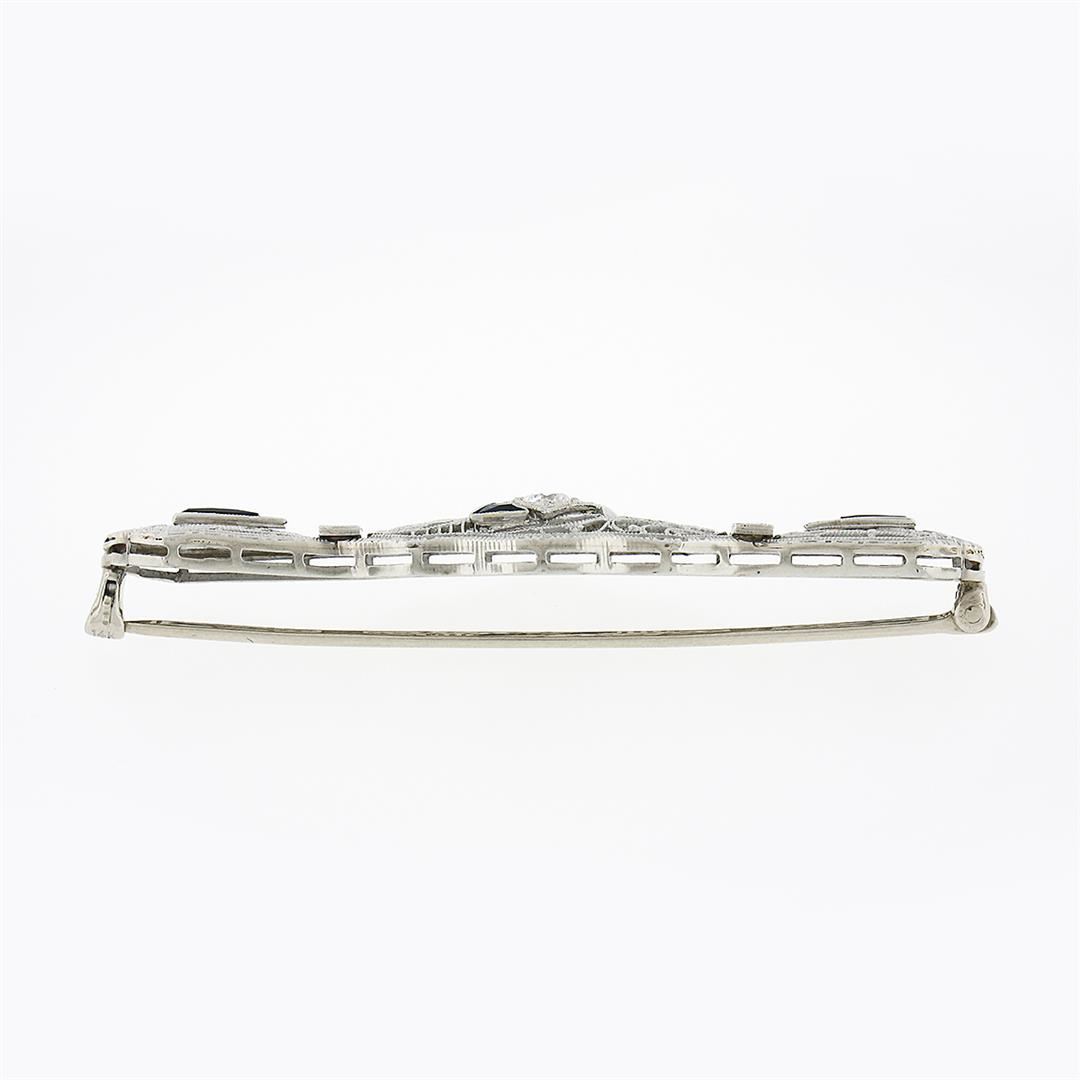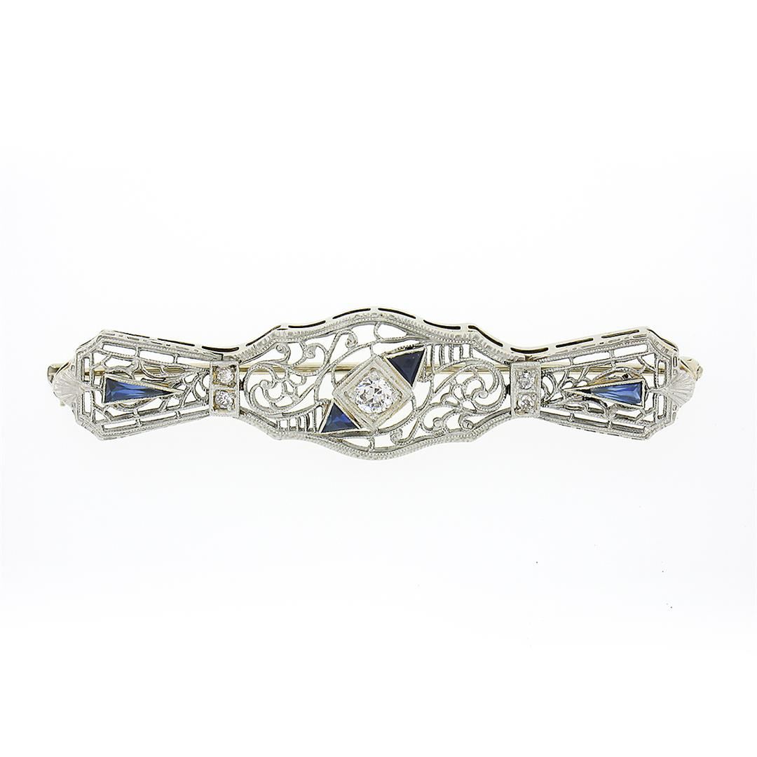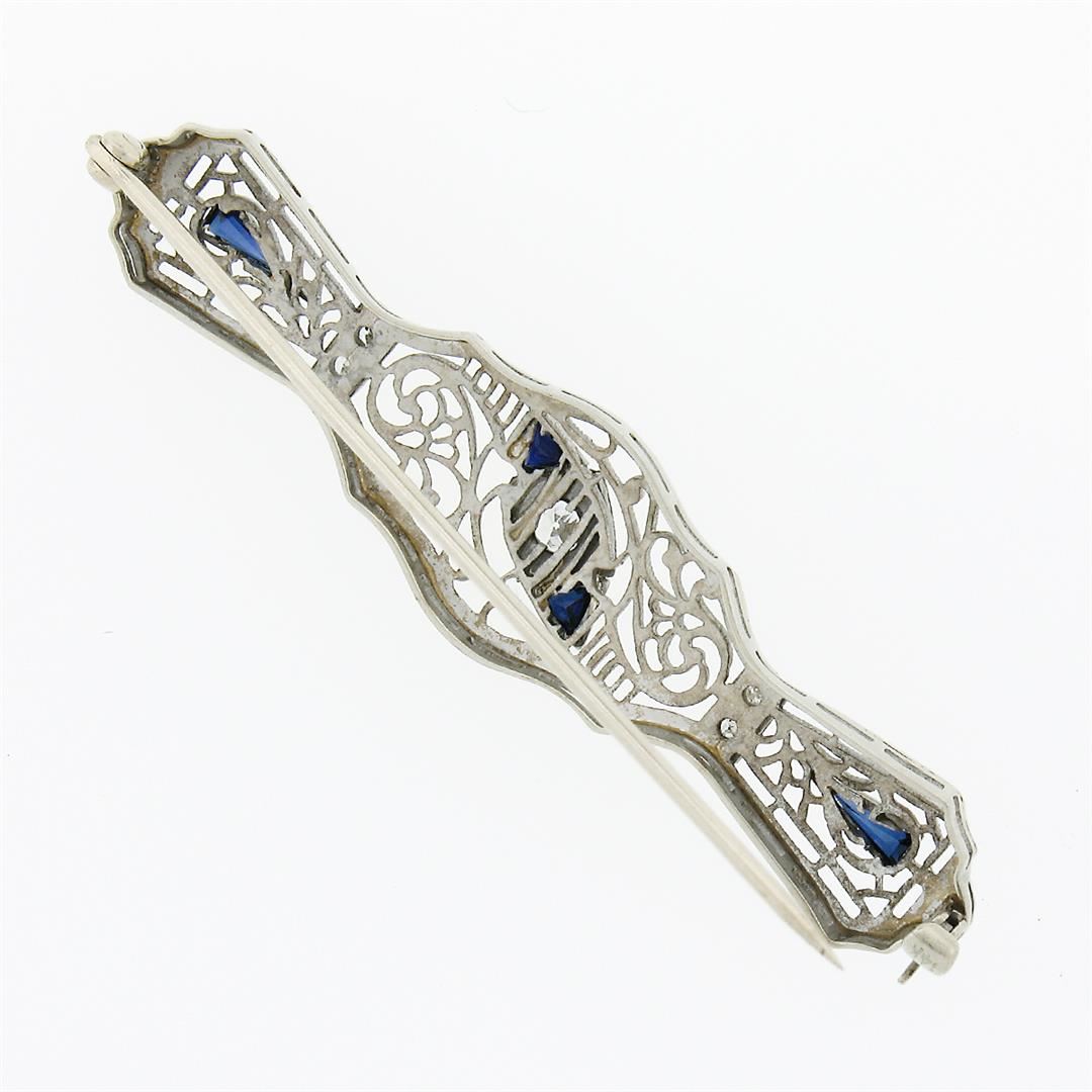 An antique solid 14k white gold bar pin brooch, with 5 old single & old European cut natural diamonds (H - SI1 ; 0.21ctw), & 4 caliber cut synthetic Sapphires. Measures 13.40x55.10mm and weighs a total of 4.27 grams.