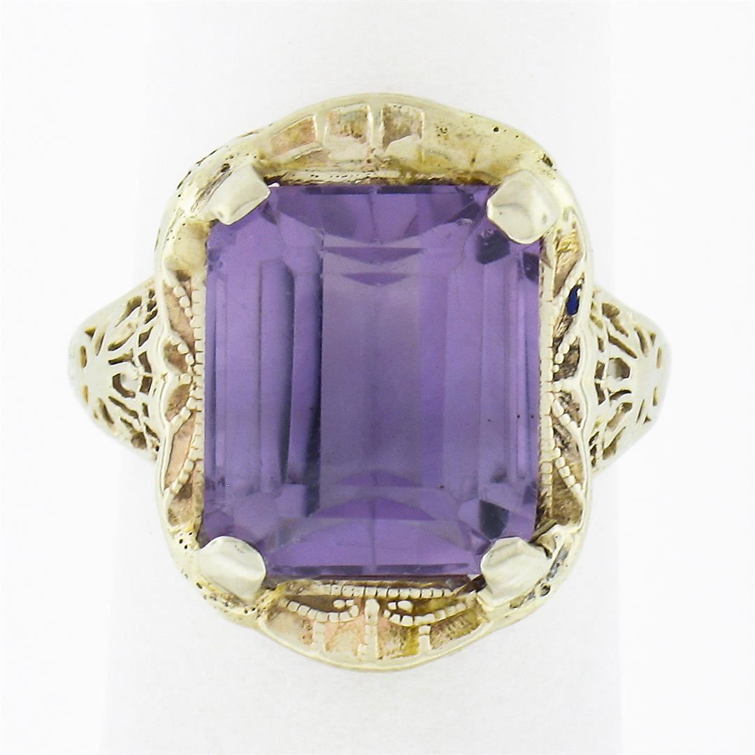 An antique solid 14k white gold ring, featuring 1 rectangular step cut natural amethyst (10x11.7mm). The ring is size 6.5, weighs a total of 3.47 grams, and measures 17.70mm wide.