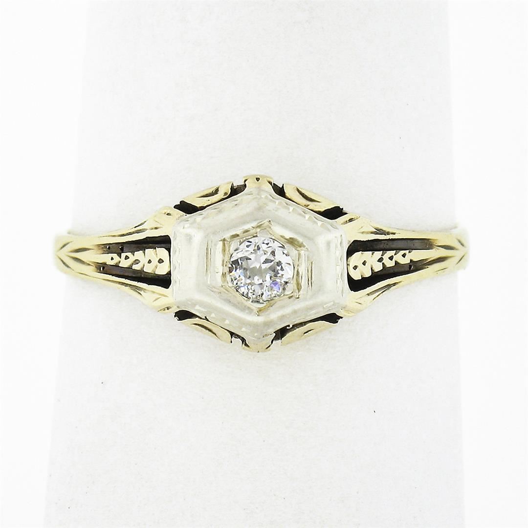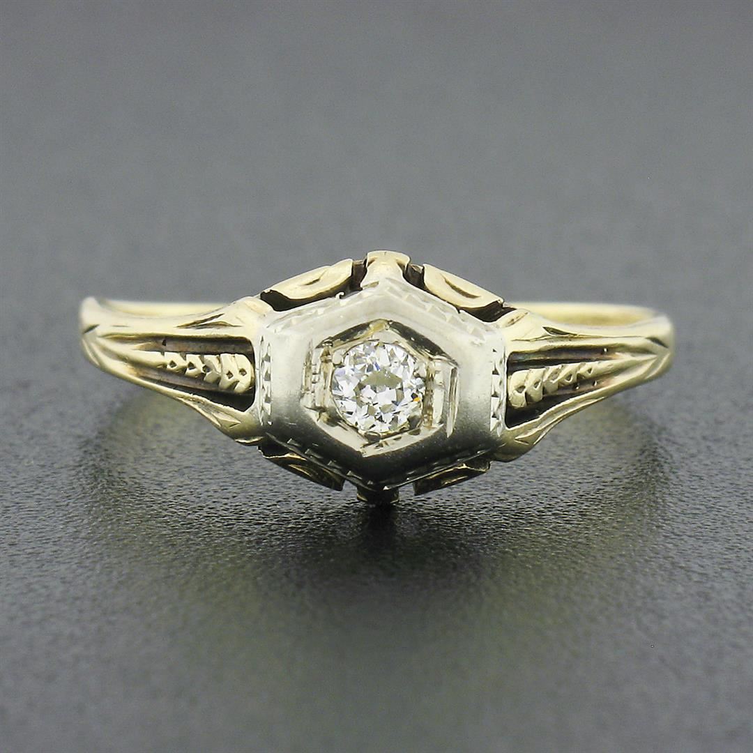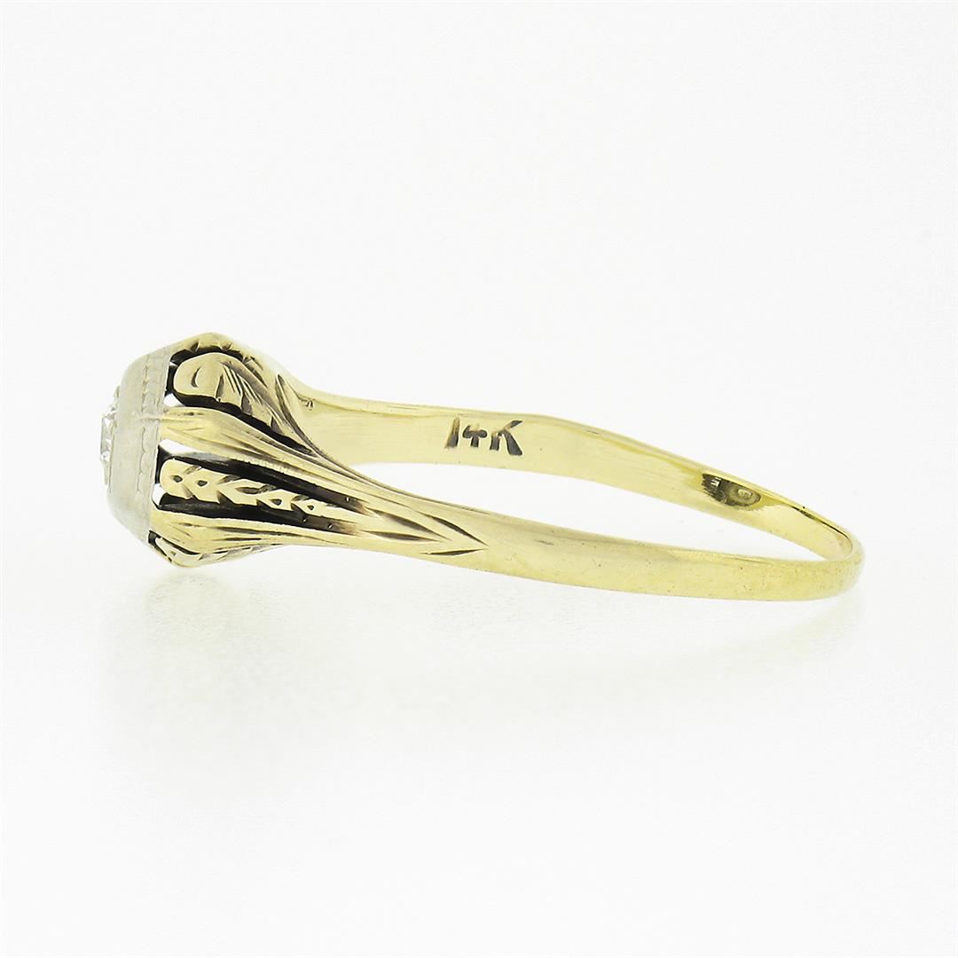 An antique solid 14k yellow and white gold ring, with 1 old european cut natural diamond (H - VS1 ; 0.14ct). The ring is size 7.5, weighs a total of 2.0 grams, and measures 7.65mm wide.