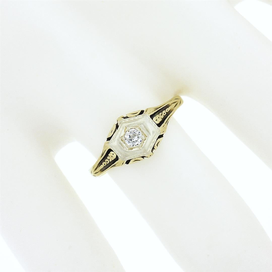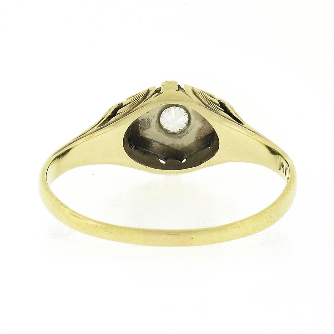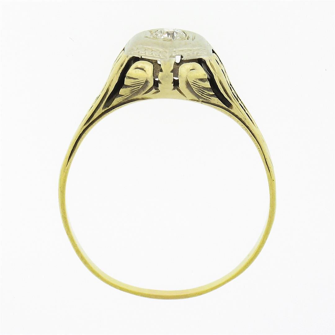 An antique solid 14k yellow and white gold ring, with 1 old european cut natural diamond (H - VS1 ; 0.14ct). The ring is size 7.5, weighs a total of 2.0 grams, and measures 7.65mm wide.