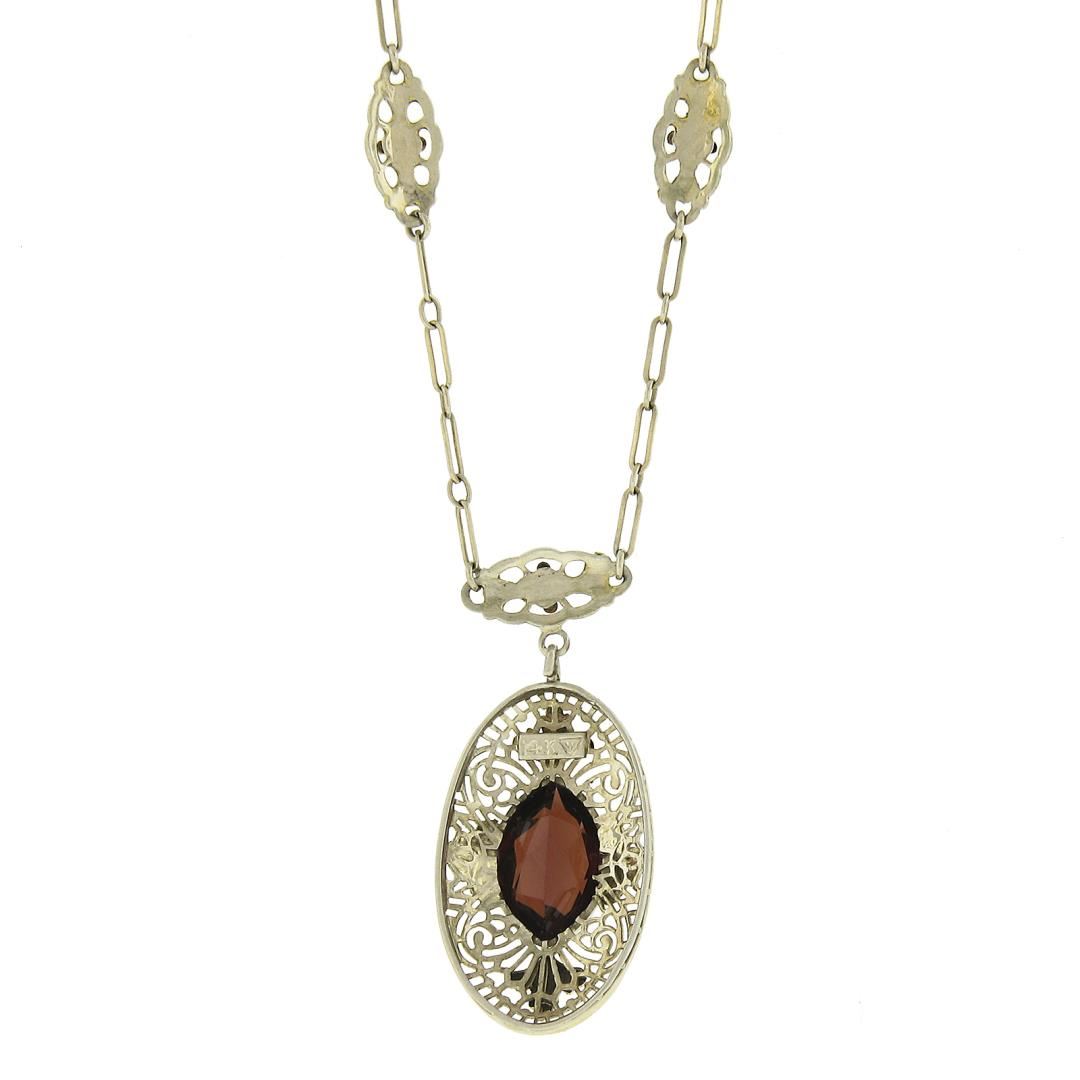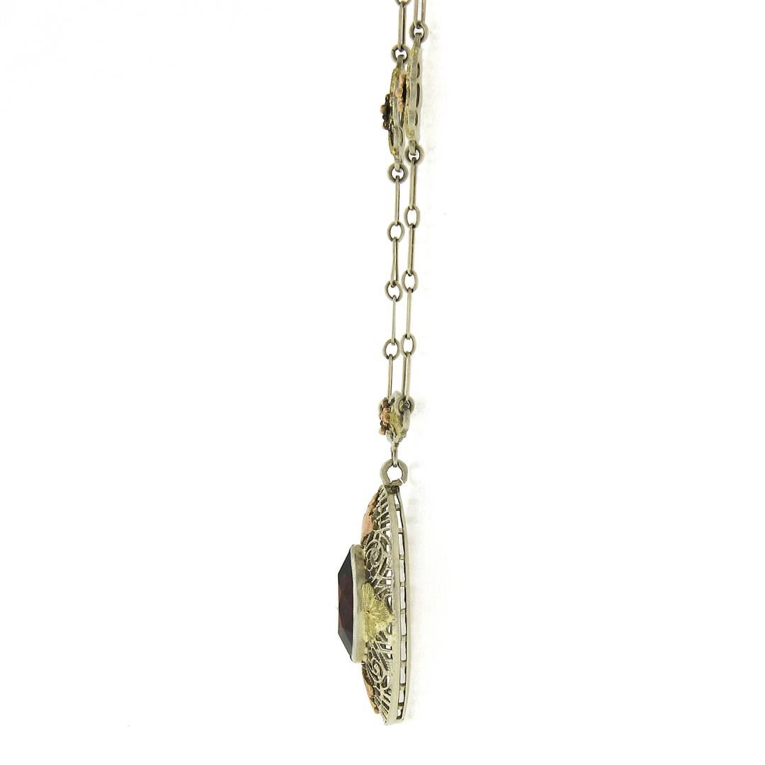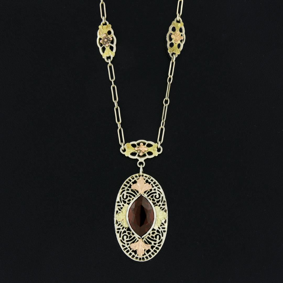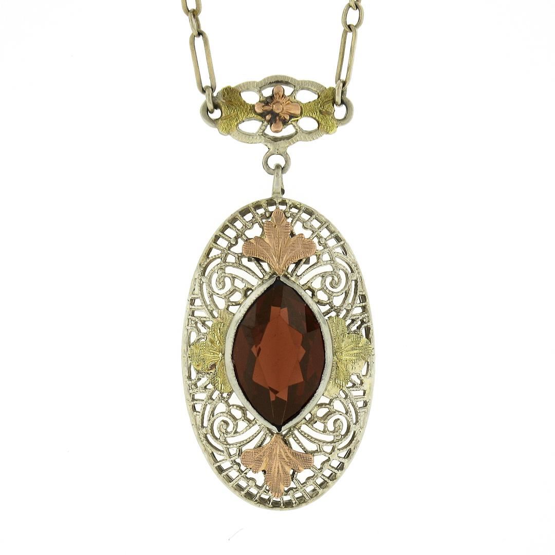 An antique solid 14k green, rose & white gold pendant necklace, featuring 1 marquise cut natural garnet (2.0ct). 15.5 inch oval and round link chain, 3.67 grams total weight, pendant measures 23.8x13.3mm.