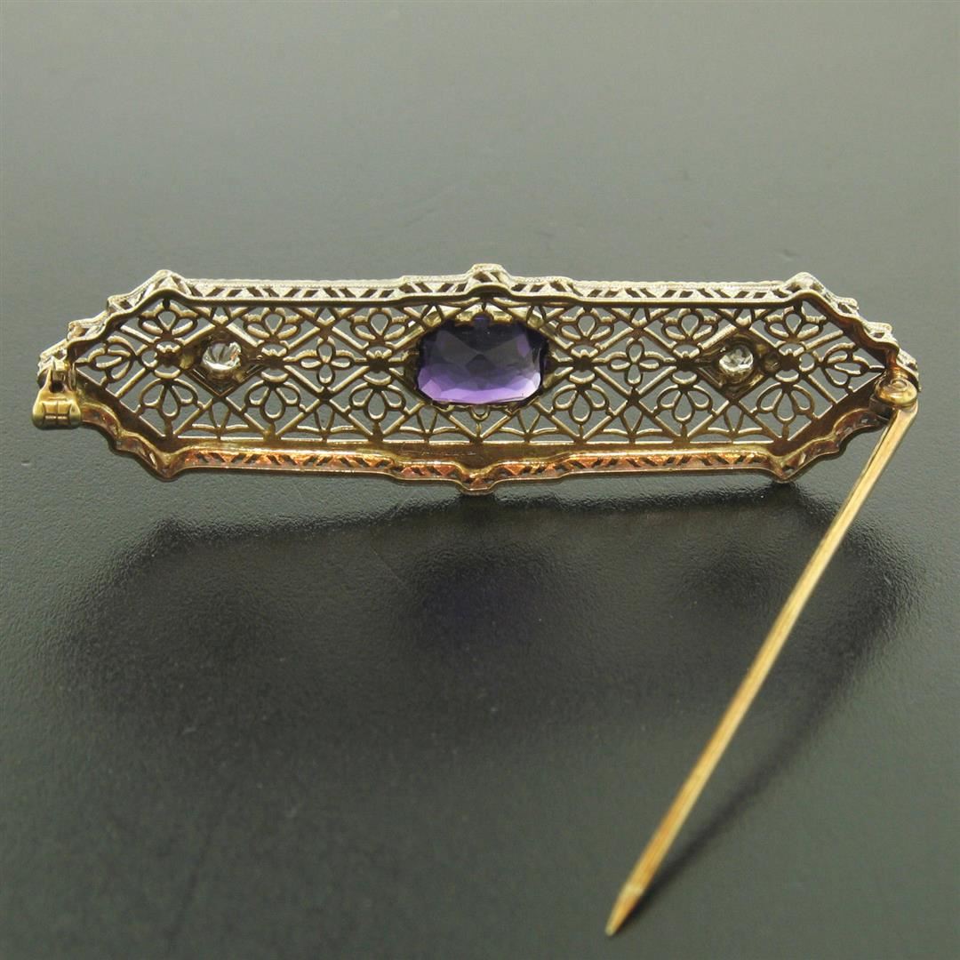 An antique solid 14k yellow and white gold pin brooch, with 1 radiant cut natural amethyst (1.50ct ), and 2 round europeant cut natural diamonds (H - VS1 ; 0.20ctw). Measures 16.32x54.60mm and weighs a total of 5.8 grams.
