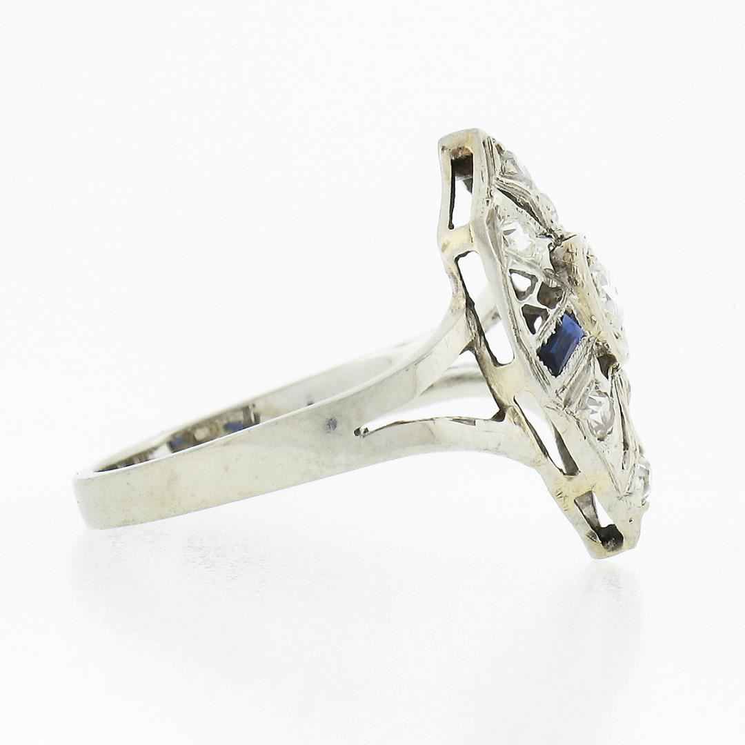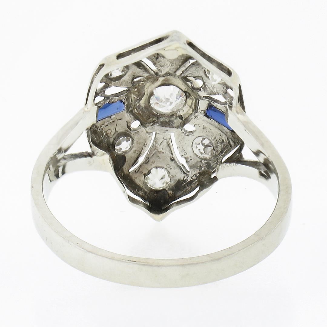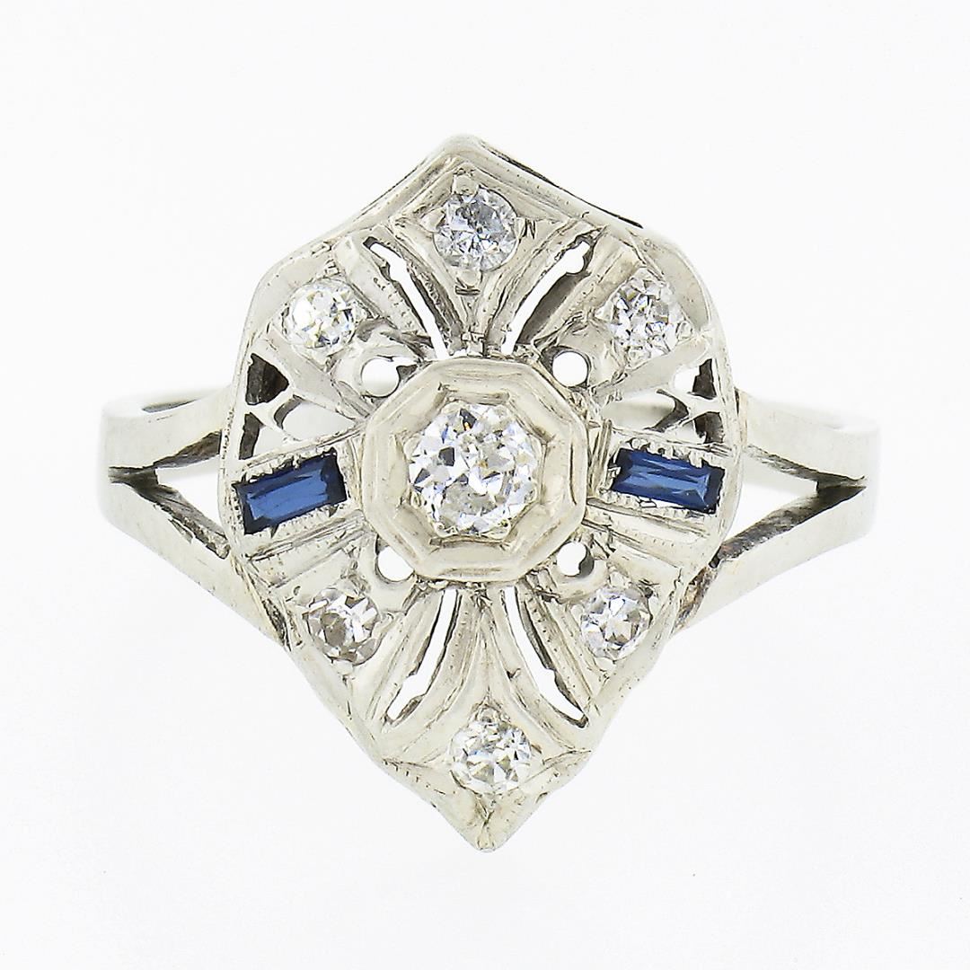 An antique solid 14k white gold ring, with 7 old european & old single cut natural diamonds (G/H - VS2 ; 0.24ctw), and 2 french baguette cut synthetic sapphires ( 0.20ctw). The ring is size 6.0, weighs a total of 2.37 grams, and measures 16.50mm wide.