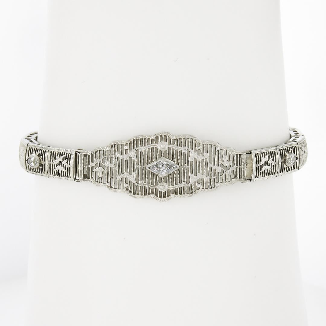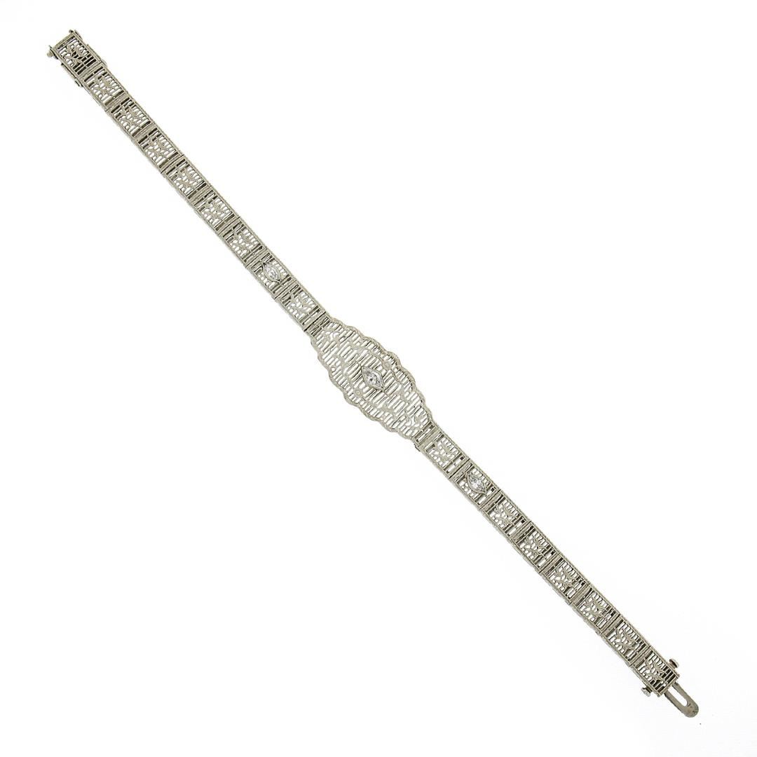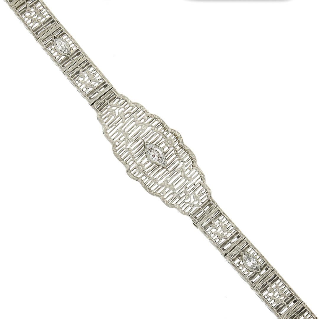 An antique solid 14k white gold belly bracelet, with 3 old marquise cut natrual diamonds (G'/H - SI1-SI2 ; 0.40ctw). It weighs a total of 10.49 grams, measures 13.4mm wide, and measures 6.5 inches in length.