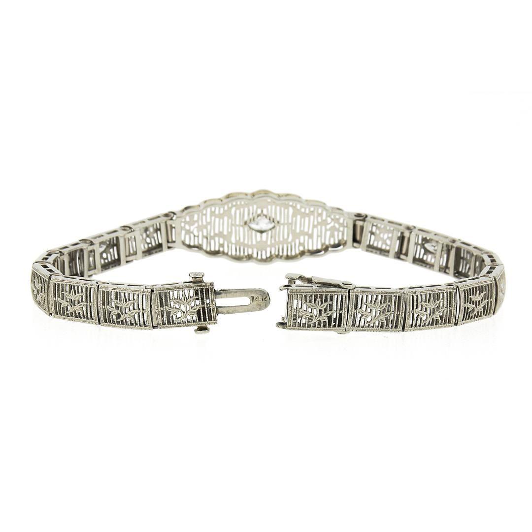 An antique solid 14k white gold belly bracelet, with 3 old marquise cut natrual diamonds (G'/H - SI1-SI2 ; 0.40ctw). It weighs a total of 10.49 grams, measures 13.4mm wide, and measures 6.5 inches in length.