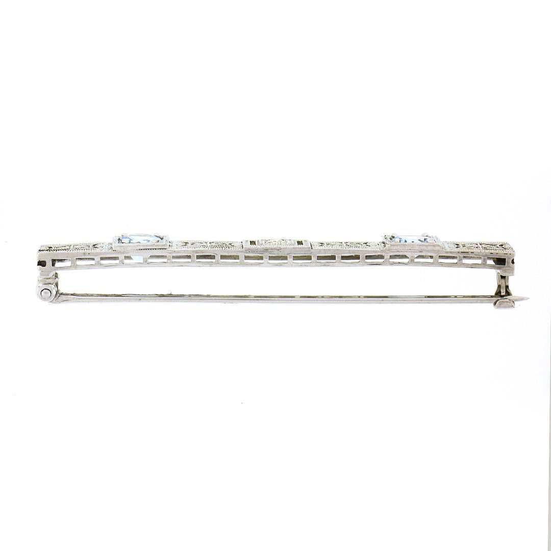 An antique solid 14k white gold bar brooch. with 2 round brilliant cut natural aquamarines (5mm each / 1.0ctw), and 1 old european cut natural diamond ( H - SI1 ; 0.06ctw ). Measures 6.50x54.40mm and weighs a total of 3.69 grams.