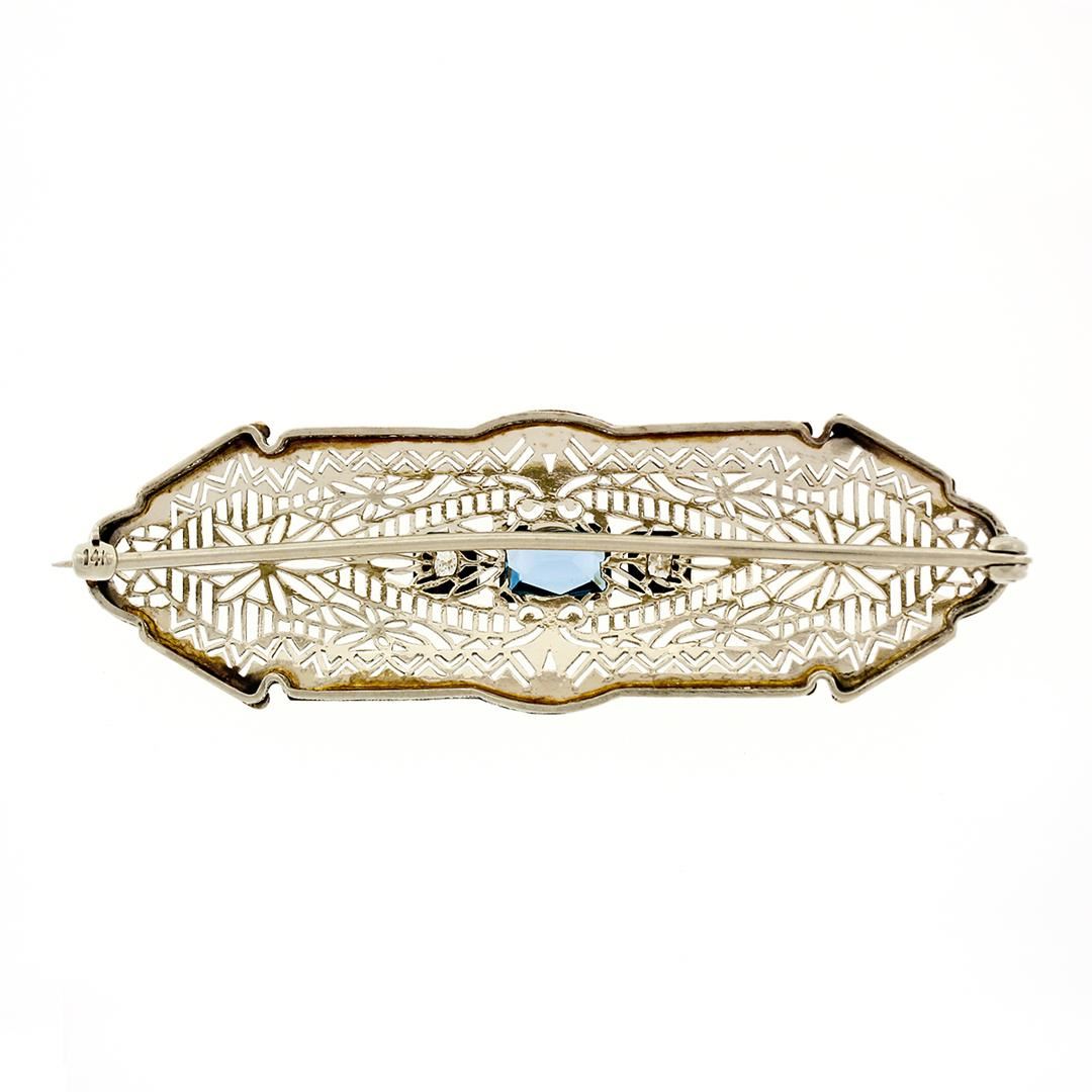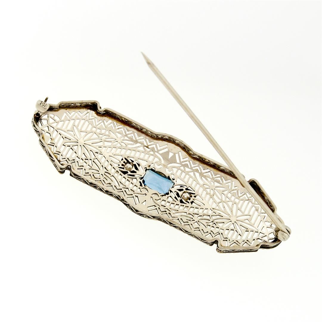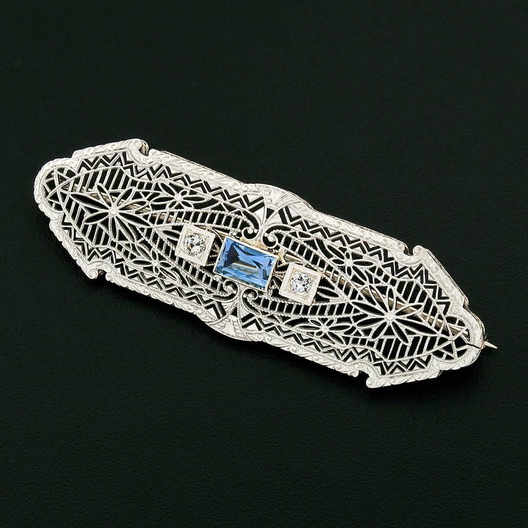 An antique solid 14k white gold pin brooch, with 1 rectangular french cut natural aquamarine (0.47ct ), & 2 old european cut natural diamonds (G- VS2; 0.12ctw). Measures 17.67x54.20mm and weighs a total of 5.25 grams.