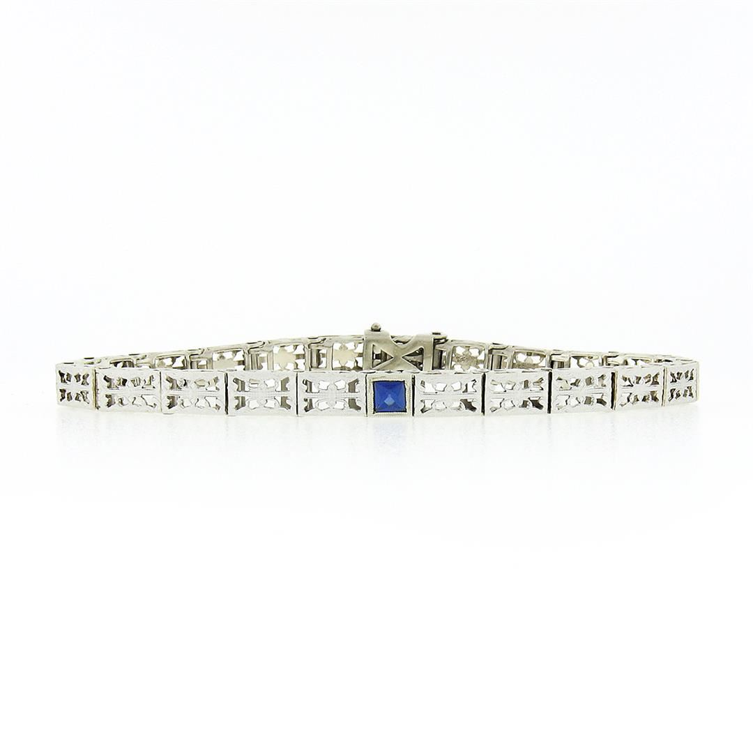 An antique solid 14k white gold link bracelet, with square french cut synthetic sapphire (3.25x3.25mm). It weighs a total of 10.08 grams, measures 5.20mm wide, and measures 6.25 inches in length.